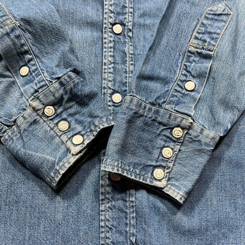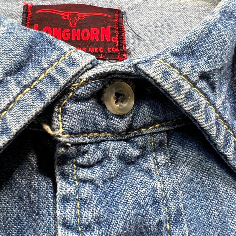 50年代頃から60年代頃のLONGHORNデニムウェスタンシャツです。ブランドの創業年等は不明ですが、元々ミリタリーウェアやユニフォーム、ワークウェアを製造していたDICSON JENKINS社が手掛けていたウェスタンウェアブランドの様です。ブランドロゴとロングホーンのデザインがプリントされたタグが付きます。第一ボタンはスナップではございません。全体的に色落ちがあり、色残りは4割程度ですがダメージ等も殆ど無くコンディションは良好です。裾はウェスタンシャツらしい角度の付いたラウンドをしており、縁は篝縫いで処理されています。こちらのブランドはスナップボタンに馬蹄が描かれており特徴的なディティールだと思います。ウェスタンシャツとしては身幅も充分にあるので、着やすいサイズ感だと思います。表記はございませんが、M~L位でしょうか。スナップボタンにゆるみも無くしっかりと留まります。古い年代のデニムウェスタンシャツはリーバイスを始め価格も徐々に高騰していますので、お探しだった方は是非いかがでしょうか。