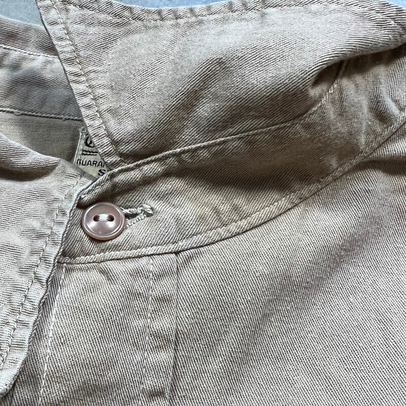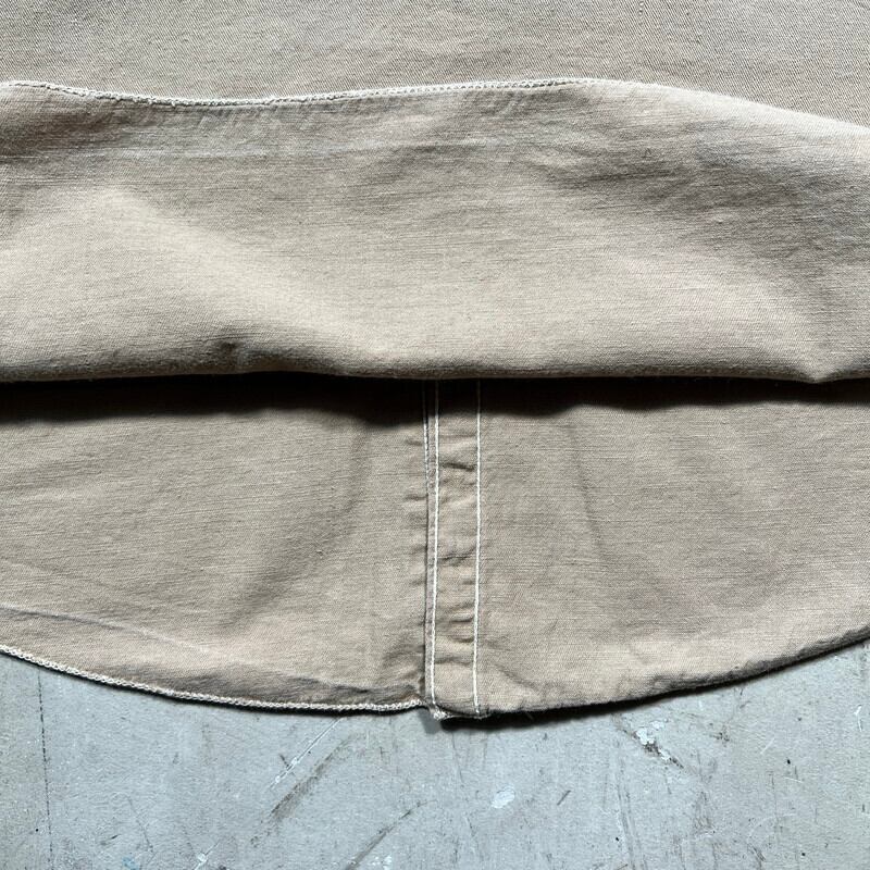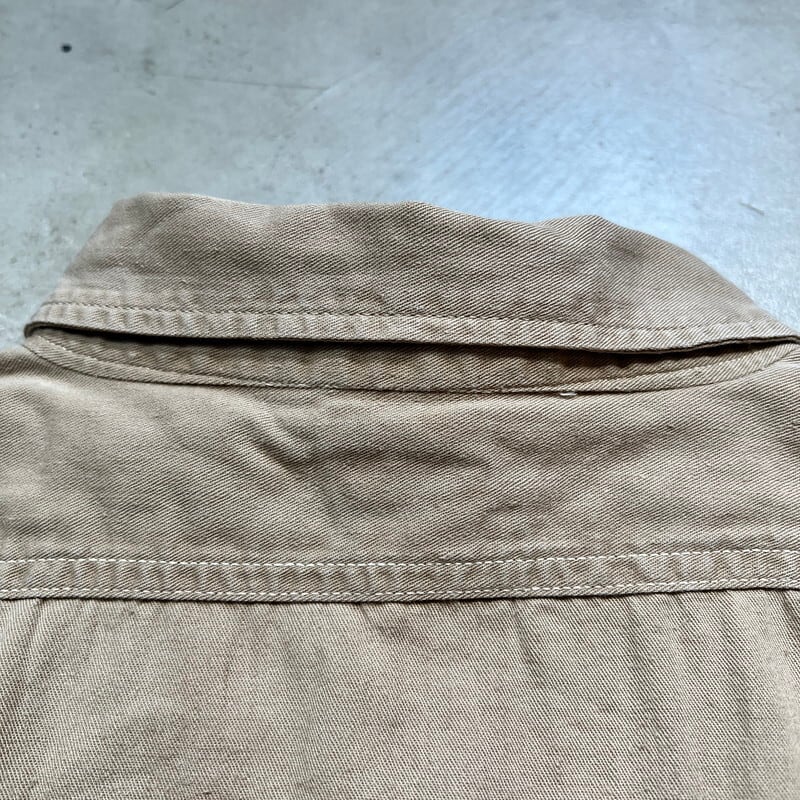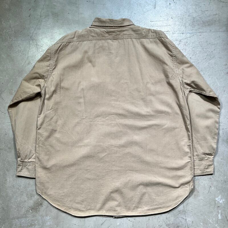 40年代頃のN&Wコットンツイルワークシャツです。N&W(ノーフォーク&ウェスタン)は1838年から1982年まで実在していた鉄道会社で、鉄道会社では珍しく1930~50年代頃まで自社でワークウェアを作った会社として知られています。ご紹介するこちらは、コットンツイル地のワークシャツで、襟先の形状がやや先細の古いタイプで台襟です。ボタンは全て樹脂製のオーバルボタンが使用されています。サイドにはマチが付かない仕様となっています。胸ポケットが中央に寄ったデザインも興味深いディティールです。首元のタグにはTurner N&Wと刺繍で記載されております。同デザインでプリントタグも存在しますが、恐らく刺繍タグの方が古いと思われます。擦れ等はございますが、目立つ汚れやダメージは無くコンディションは良好です。サイズ表記はございませんが、ゆったりとした大き目な作りでXL相当だと思います。鉄道会社であるN&Wが自社でワークウェアを製造していた期間は長くなく、他のワークウェアブランドの物と比べても流通量は極めて少ないのではないでしょうか。カバーオールやオーバーオールはヴィンテージ市場で目にする機会はございますが、シャツ類はなかなか出ない希少なアイテムですので、N&Wコレクターは是非この機会にコレクションに加えてみてはいかがでしょうか。今後の入荷は期待できないスペシャルアイテムです。
