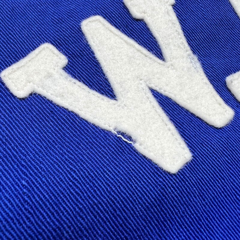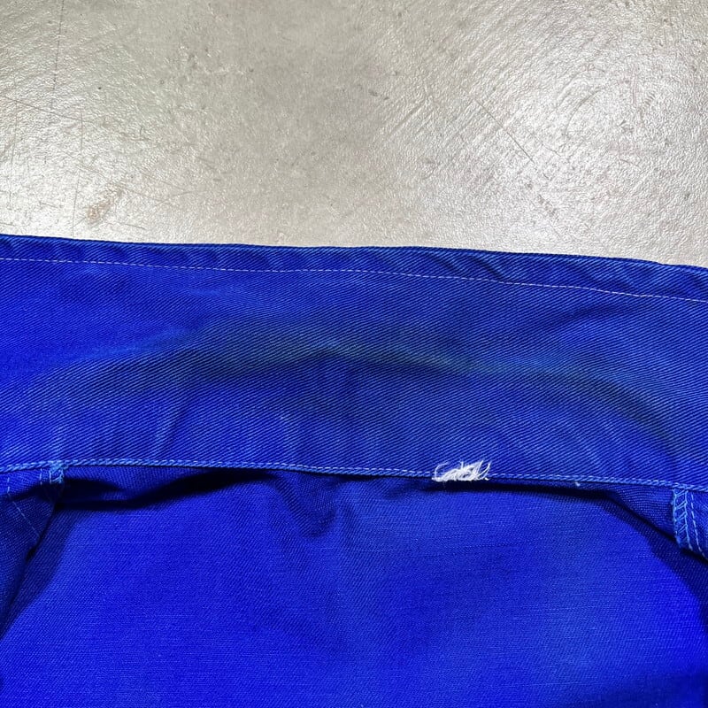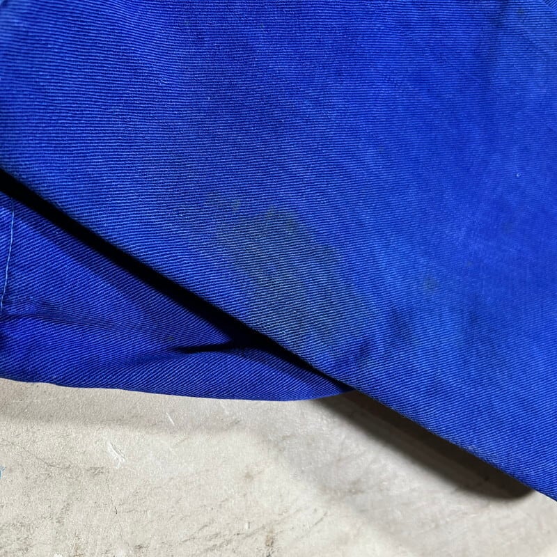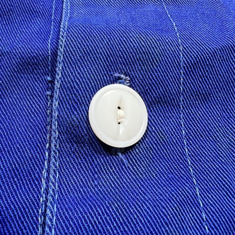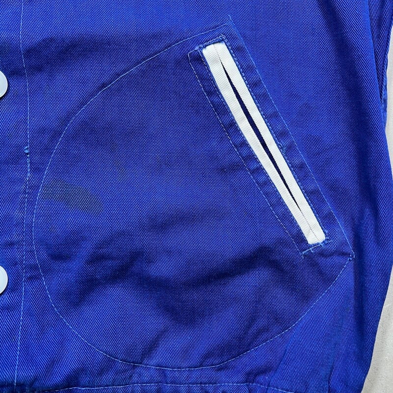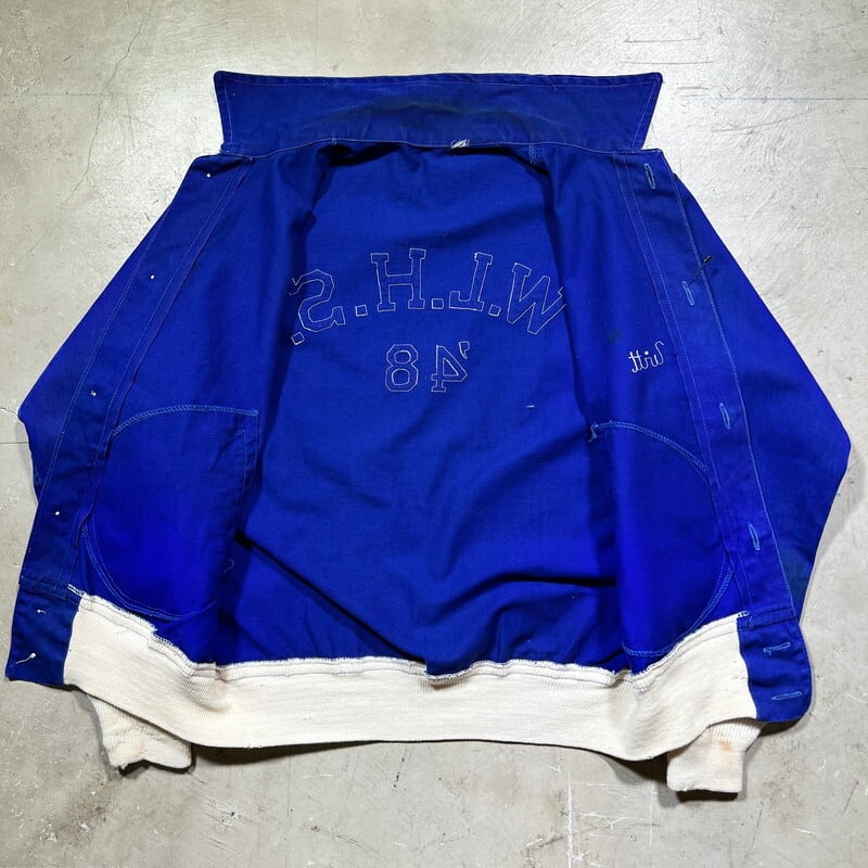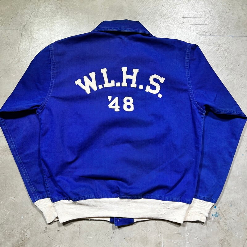 40年代から50年代頃のUnknownコットンツイルボタンスタジャンです。所謂”ボタスタ”と呼ばれるアイテムで、ウール素材の物に比べ少ないとされるコットンツイル地で襟が付くタイプの希少な1着です。胸にチェーンステッチでネームが入り、背面にはW.L.H.S.’48のフェルトレターが入ります。WLHSは恐らくハイスクールの名称ですが、いくつか同じ略称の高校が存在するため特定はできませんが、恐らくWisconsin Lutheran High Schoolの生徒もしくは卒業生が所有していたのかもしれません。鮮やかななブルーにホワイトのフェルトレターがとても映えます。ボタンは全て19mmの猫目ボタンが使用されています。ハンドウォーマーポケットは古い年代のアワードジャケットで見られる丸いラウンドしたステッチが特徴的です。袖と裾のリブに虫食いによる小穴やハンドリペアがいくつかございます。背面のフェルトには一部生地が薄れている箇所がございます。ポケット付近や袖等に薄汚れもございますが、ボディ自体のコンディションは良いと思います。サイズ表記はございませんが、40~42位かと思われます。コットンの襟付きボタスタはなかなか出ないと思いますので、お探しだった方は是非この機会にいかがでしょうか。これからの季節はTシャツの上にさらっと羽織れるのでお勧めです。