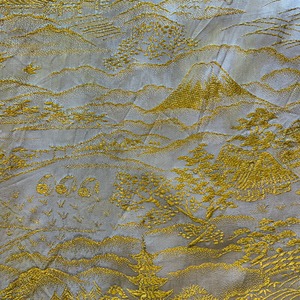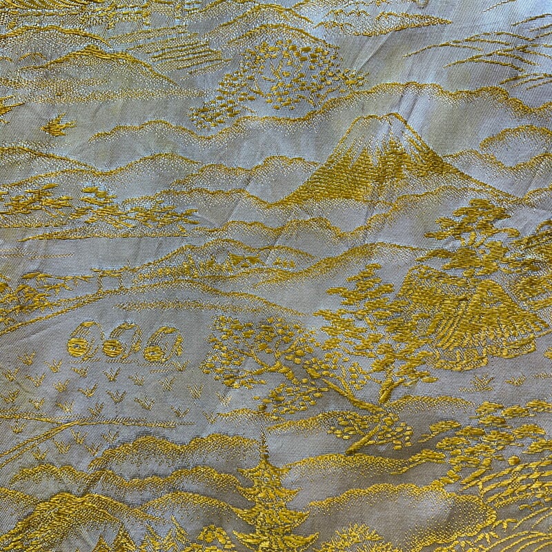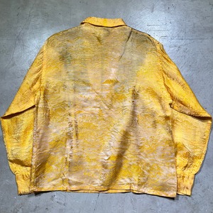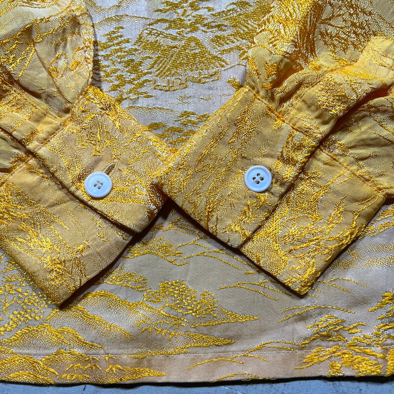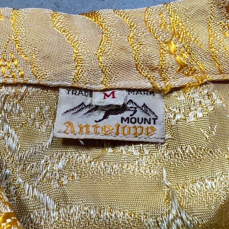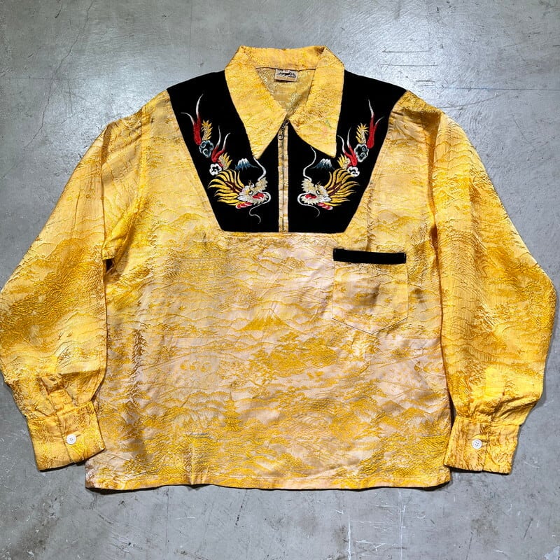 40年代から50年代頃のMOUNT Anteropeスーベニアプルオーバーシャツです。スカジャンのように刺繍が施された所謂スカシャツと呼ばれるアイテムです。同デザインのスカシャツはいくつか種類があり、ほとんどがシルクやサテン、ギャバジン等のボディーで構成されていますが、ご紹介するこちらは西陣織のような着物生地がボディに使用された珍しい1着です。刺繍が入る下地には別珍が使われております。ジッパーは無名のチェーンジッパーです。ブラックとイエローのコントラストが非常に豪華な印象です。襟や背面に若干の色移りが見られ、色褪せやその他薄汚れもいくつかございますがダメージは無くコンディションは良好です。Mサイズ表記ですので男女共に着やすいサイズ感だと思います。トップスとしても存在感がありますが、デニムジャケット等のインナーに着用してもとても良いと思います。ダメージや汚れの多いスカシャツは見かけますが、コンディションの良い個体はなかなか出会わないと思いますので、是非この機会にいかがでしょうか。激シブなスペシャルアイテムです。