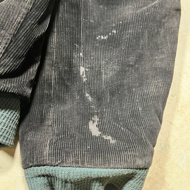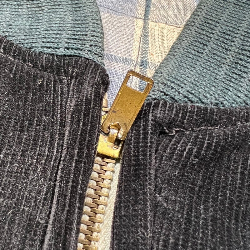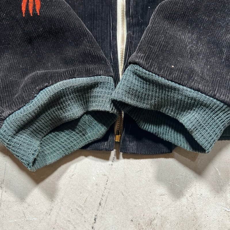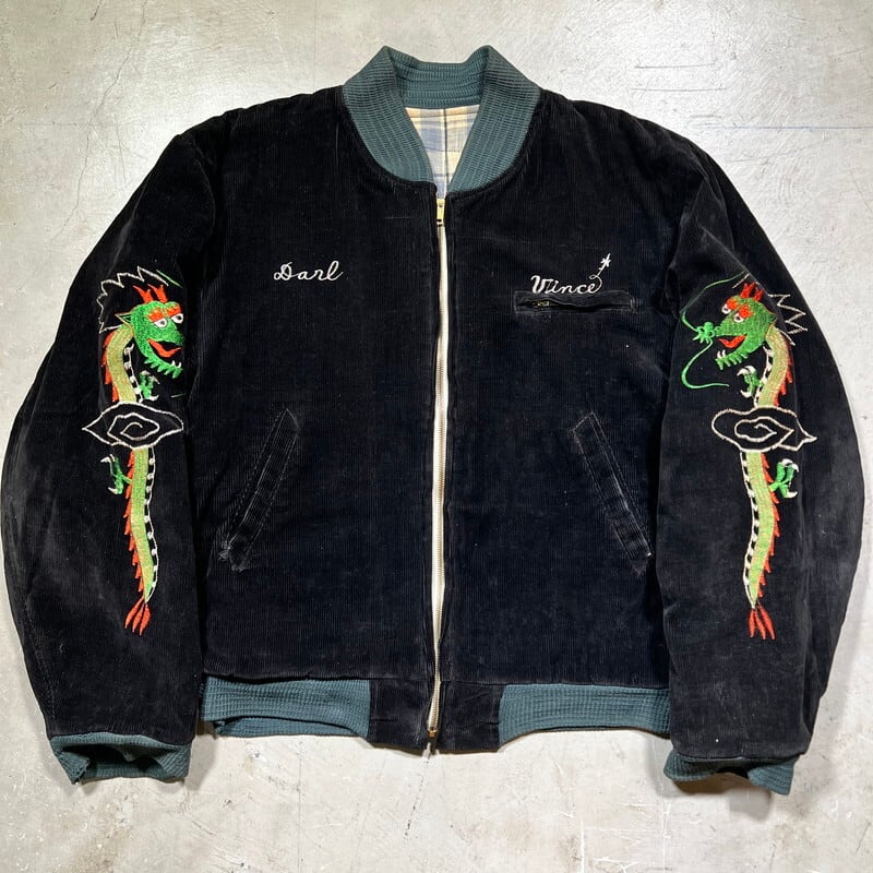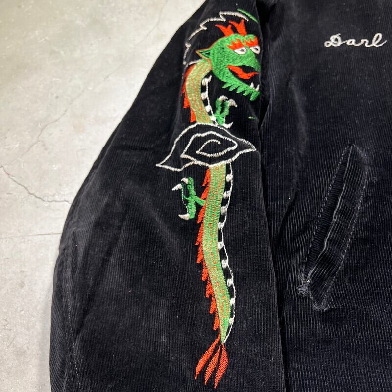 60年代頃のU.S.AIR FORCE スーベニアジャケットです。1964年から1965年、韓国の烏山空軍基地(OSAN AIR BASE)で駐留していた米空軍兵士が帰国の際に現地のテーラーにオーダーをして作成したと思われるアイテムです。ローカルメイドらしくブランドタグ等はございません。別珍やサテンでのスーベニアジャケットは見かけますが、ユーロ物以外でブラックのコーデュロイを使用したスーベニアジャケットは非常に少ないかと思います。フロントは無名のピンロックジッパーが使用されています。胸元にネーム刺繍、両袖には龍、背面にはシルクのような素材でパッチが縫い付けられています。チェックのコットン地がライニングに使用されているのも興味深いポイントです。袖リブにややダメージと伸びがあり、ハンドウォーマーポケット縁にも若干のダメージが見られます。袖付近のコーデュロイに一部抜けがございます。その他うっすらとシミ等ございますが、全体的にはコンディションは良好だと思います。サイズ表記はございませんが、40位でしょうか。普段Mサイズを着用される方で丁度良い塩梅だと思います。同年代頃のベトジャンに比べると遥かに見つかりにくいスペシャルなアイテムだと思います。サイズも良いので、お好きな方は是非この機会にいかがでしょうか。