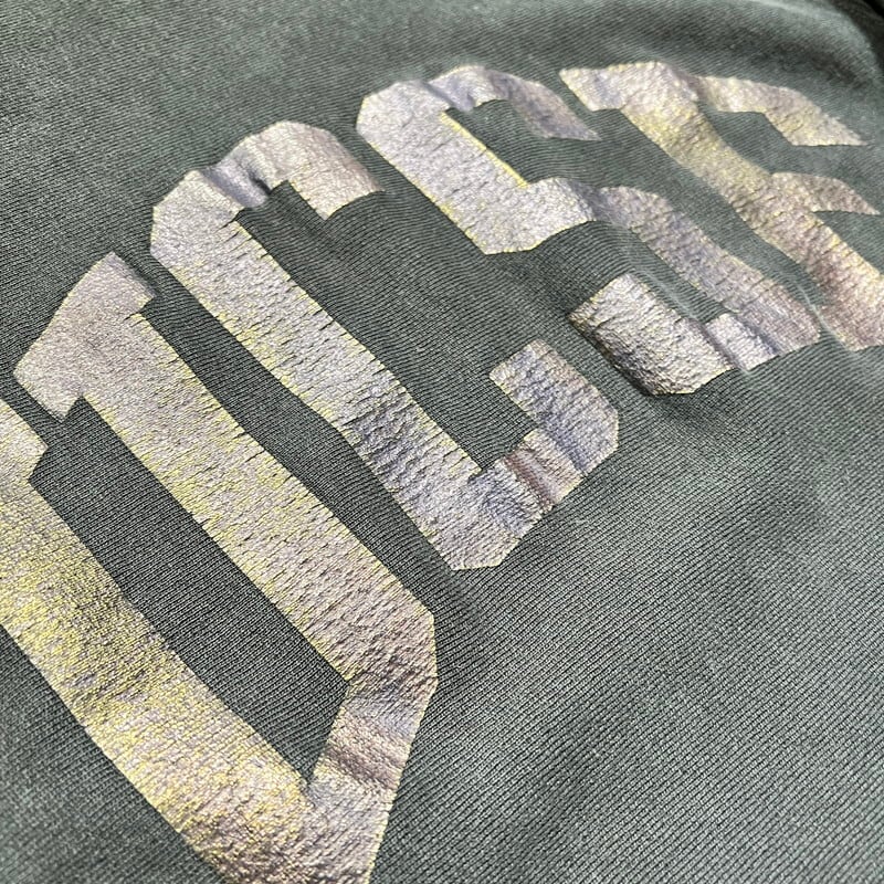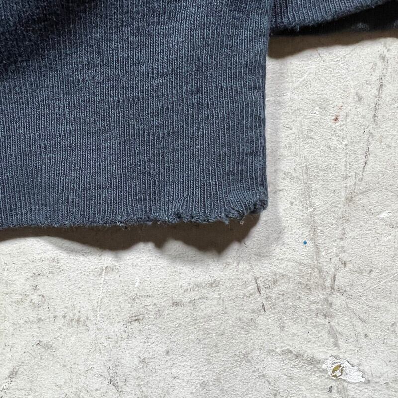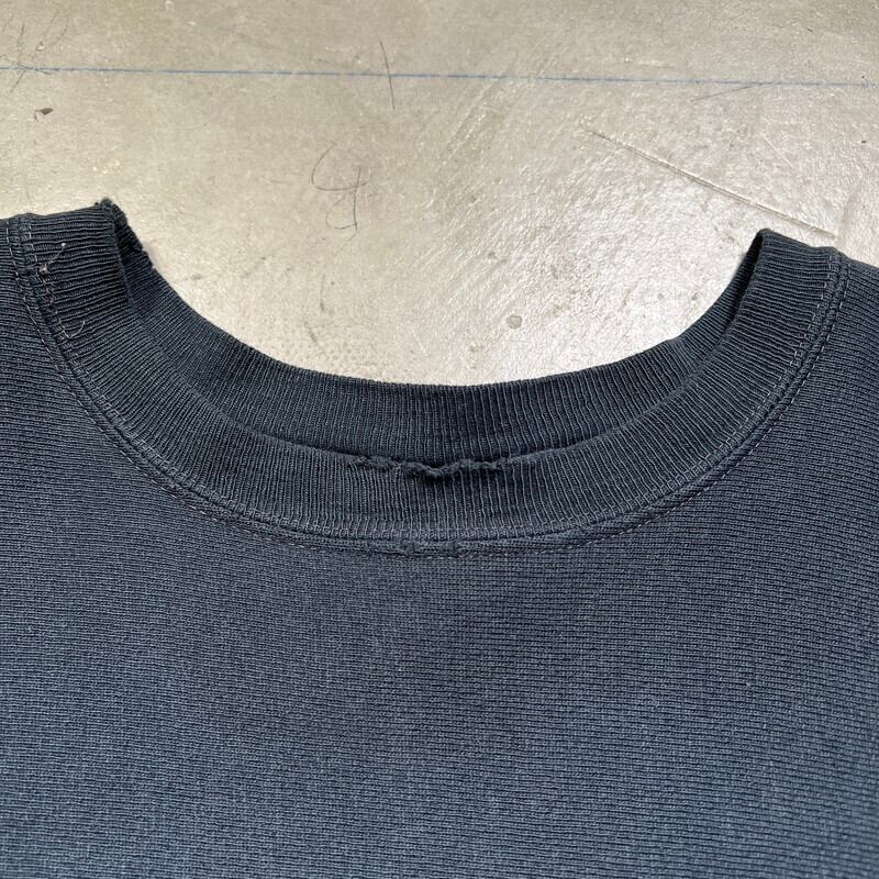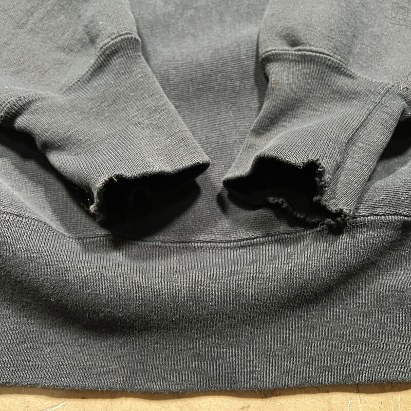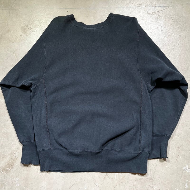 90年代頃のChampionリバースウィーブスウェットです。後染でブラックに加工されています。フロントにはラバーでUCSAのプリントが入りますが、恐らくカリフォルニア大学サンフランシスコ校のカレッジ物だと思われます。元元はグレー地にネイビーのプリントが入っていたと思われますので、経変変化でどのように色落ちするのか楽しめる1着です。目立つ汚れはございませんが、袖や裾、首のリブに一部ダメージがあり、右のサイドにもステッチから外れて生地がめくれた箇所がございます。サイズはLARGEですので、需要の高いサイズ感だと思います。USA製ボディですので、お好きな方は是非いかがでしょうか。