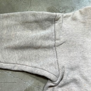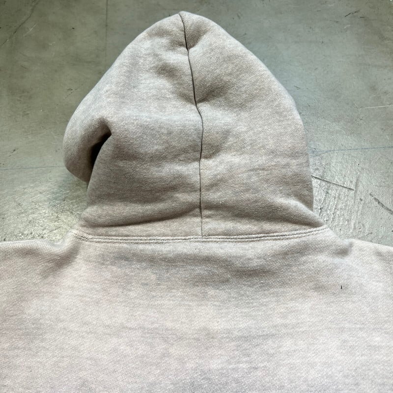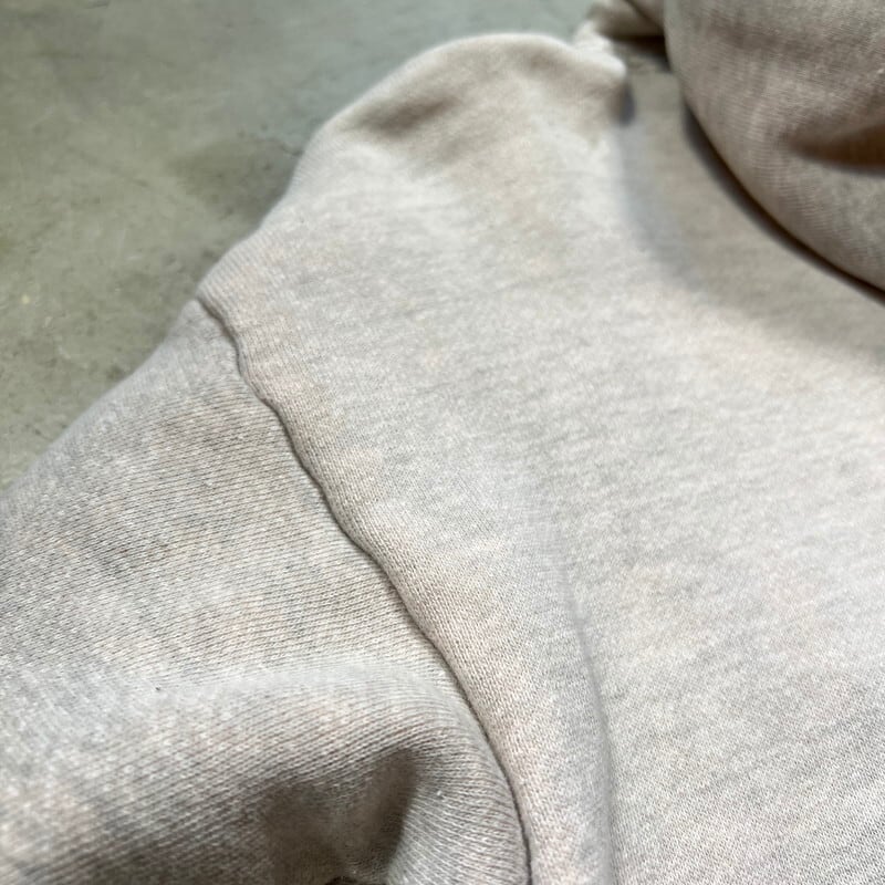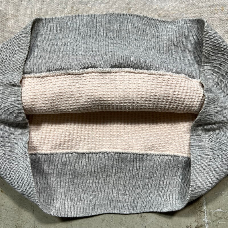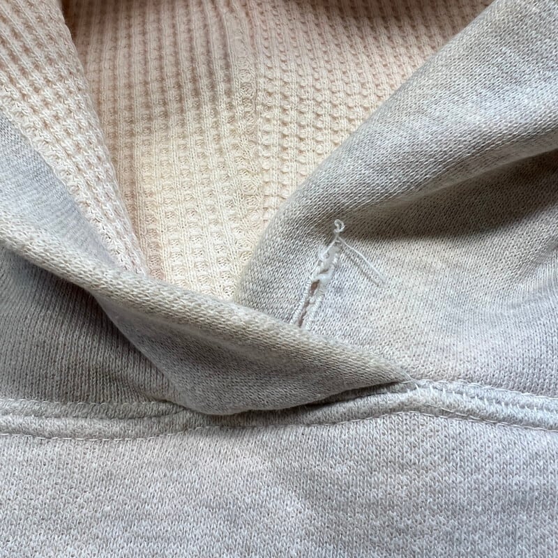 50年代から60年代頃のUnknown裏地サーマルダブルフェイススウェットパーカーです。タグ欠損の為詳細は不明ですが、フード内側までサーマール生地が使われているモデルです。袖と裾リブの色味がやや違う2トーン仕様です。フード付け根はロックフードやクロスフードと呼ばれる重なったタイプです。首元と裾は2本針、肩と腕まわりは内縫い仕様です。全体的にうっすらとピンクっぽく色移りしており、フロント等にもうっすらとした汚れがございます。ダメージは特に無くコンディションは良好です。サイズは比較的あるほうで、M~L位はあるかと思います。ここ数年でヴィンテージスウェットの中でもダブルフェイス物は人気も高く、サイズが大き目な物は特に需要も高いので、サイズ等でお探しだった方は、是非この機会にいかがでしょうか。