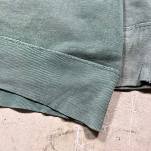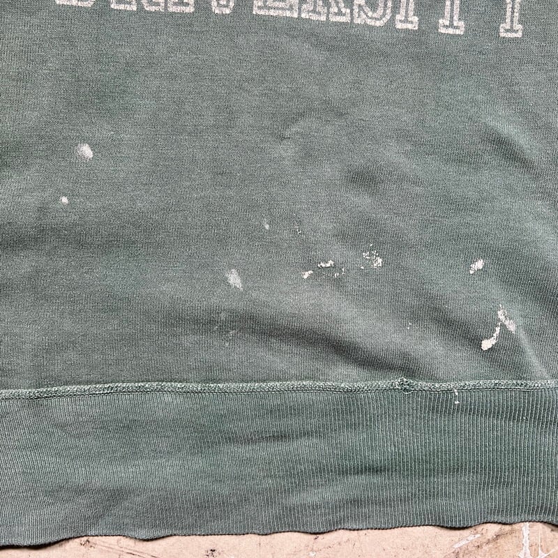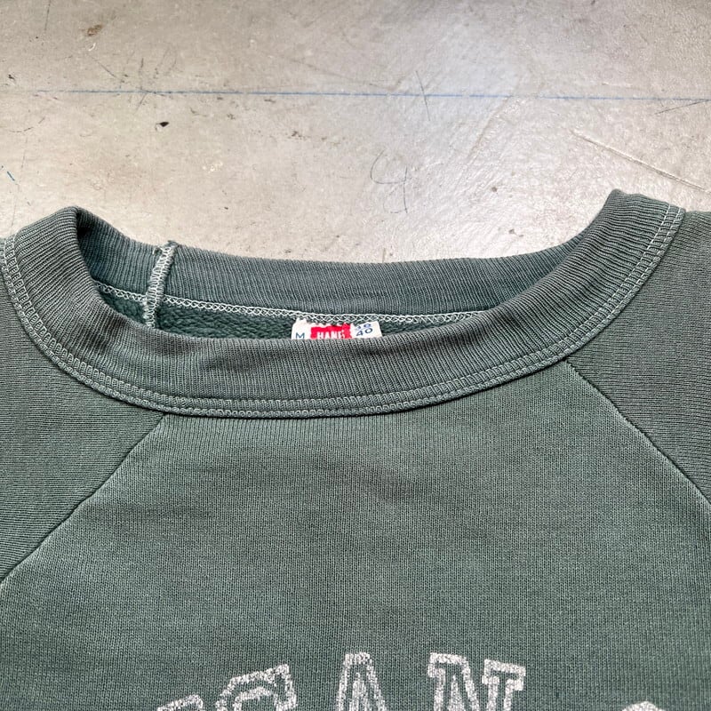 50年代から60年代頃のHANES WIND SHIELD ラグランスウェットです。1855年創立のミシガン州立大学のプリントがフロントにはいるカレッジスウェットです。首元はバインダーネック、ラグランの切り替えは内縫い、その他は4本針仕様です。元はフロッキープリントが施されていたのかもしれません。全体的に褪色したフェードグリーンのボディに所々に見られるペンキ飛びがヴィンテージ感をさらに強調してくれています。裾にステッチ飛び等ございますが、大きな目立つダメージはございません。サイズはM(38-40)ですが、身幅がやや細目な作りをしています。スチームで伸ばすともう少し拡張はできるかもしれません。雰囲気は抜群に良いのでサイズが合う方は是非いかがでしょうか。
