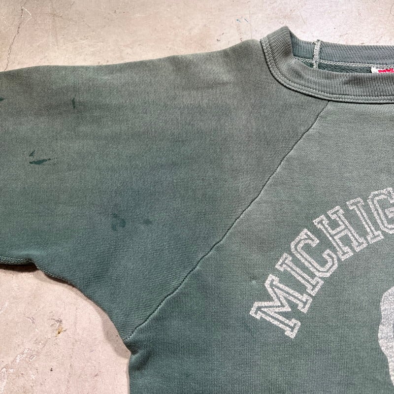 50's 60's HANES WIND SHIELD ヘインズ ラグランスウェット MICHIGAN STATE UNIVERSITY ミシガン州立大学 カレッジプリント フェードグリーン Mサイズ 40 ペンキ飛び 希少 ヴィンテージ BA-1809 RM2228H