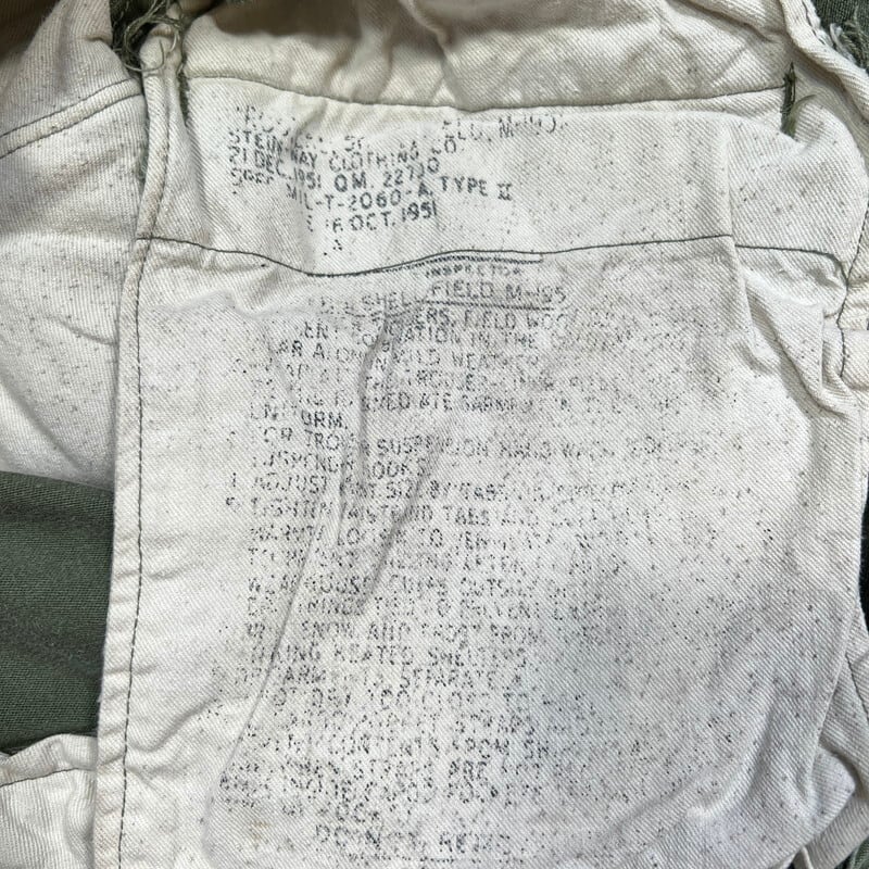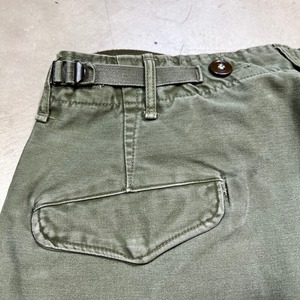 50年代のU.S.ARMY M-1951フィールドパンツです。MIL-T-2060A、STEIN WAY CLOTHING社製。フロントはCONMAR社のブラスジッパーで、こげ茶の尿素ボタンは全て欠損無く揃っています。全体的に使用感があり、コットン地ならではのフェード感が良い雰囲気の1本です。左脛付近に小さなリペアがございます。その他擦れなどございますが、生地はとてもしっかりとしていますので、ガンガン着用していただけます。サイズ需要も多いM-Rですので、ゆったりとした特徴的なこのシルエットがお好きな方は是非いかがでしょうか。