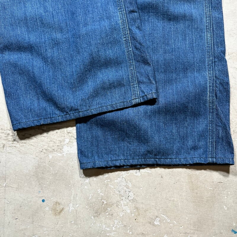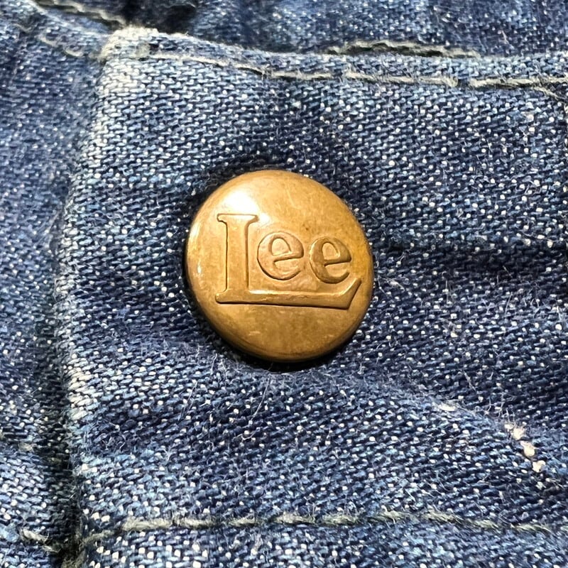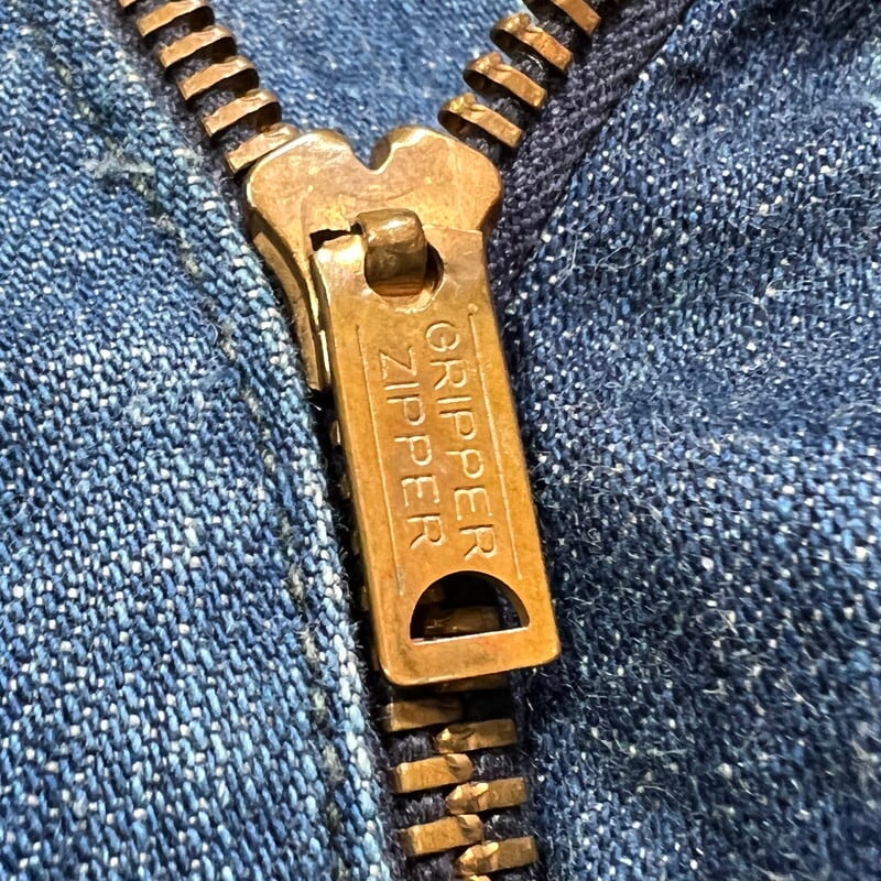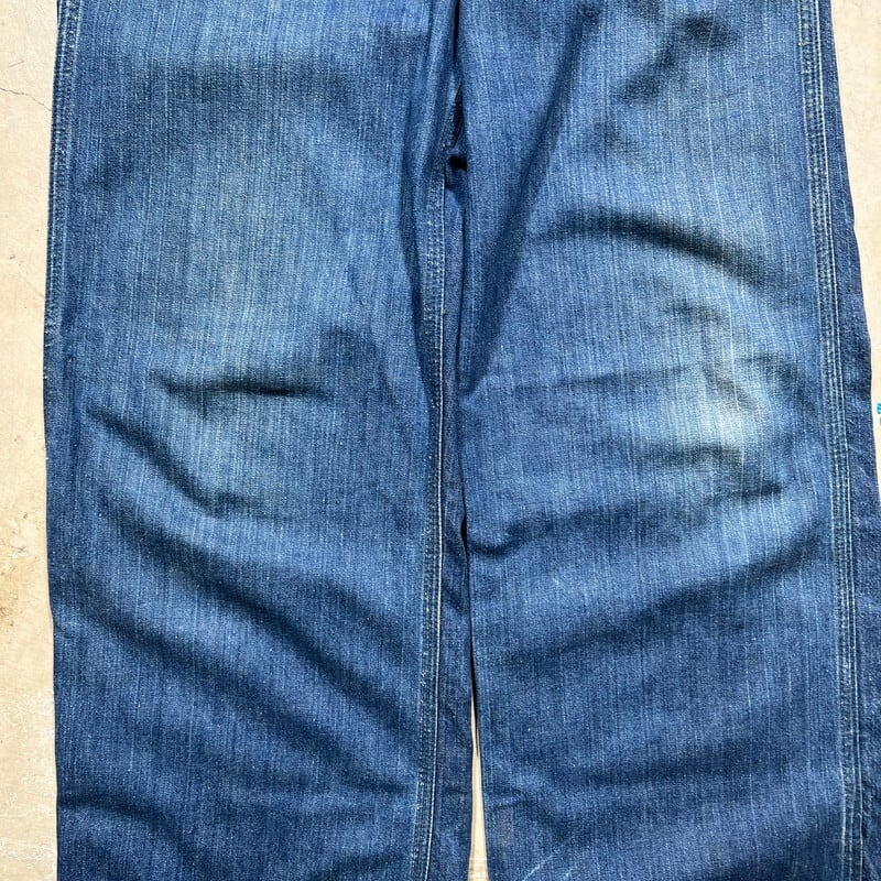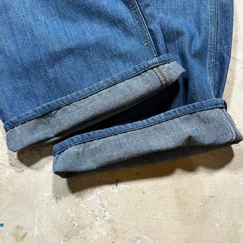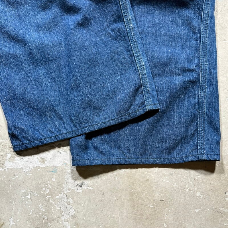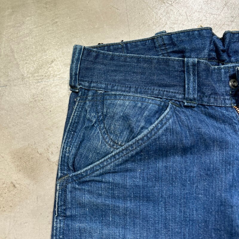 40年代から50年代頃のLee バックレースアップデニムパンツです。トップボタンロングL、GRIPPERのピンロックジッパー、サイドトリプルステッチ、背面レースアップ、赤タグ。Leeの数あるワークウェアの中でもかなり出現率の低いバックレースアップ仕様のアイテムです。U.S.NAVY等でも見られるレースアップスタイルで、テーパードの入らないゆったりストレートです。以前にフリマサイトでこちらと同様のモデルでフラッシャー付きデッドストックが出品されており、そのフラッシャーには”21-5Z"と読めるLotナンバーが記載されていましたので、こちらの個体はもしかすると同品番なのかもしれません。色残りは6~7割程残っており綺麗な縦落ちも見られます。レングスはチェーンステッチで裾上げされているかもしれません。バックポケットにはユニオンチケットが付属しています。フロントのピンロックジッパーのピンが折れて欠損している為、ジッパーにロックがかからないので少し開きやすくなっています(ゆるゆるではございません)。その他ダメージや汚れはほとんど無く、コンディションはかなり良好だと思います。ウエストは背面のレースアップ(ゴム)で縛る事でW28~W31インチで調整が可能です。比較的小さいサイズが多い印象ですが、男女共に着用できるグッドサイズだと思います。ヴィンテージデニムが高騰する中、こういった少し変わり種なアイテムはより見つけづらくなっていますので、お探しでサイズが合う方は是非この機会をお見逃しなく。