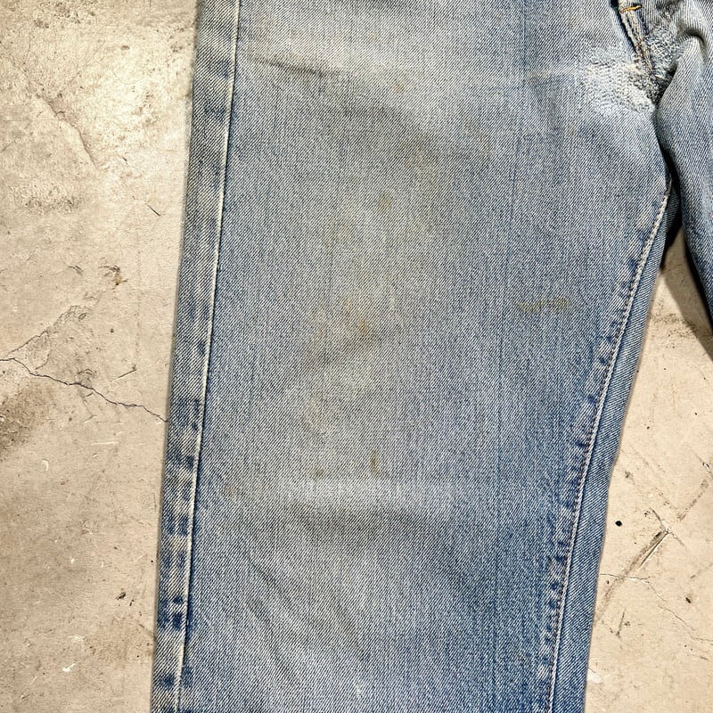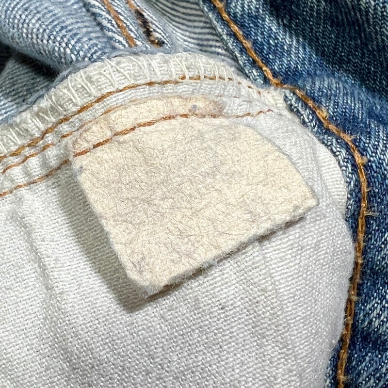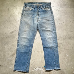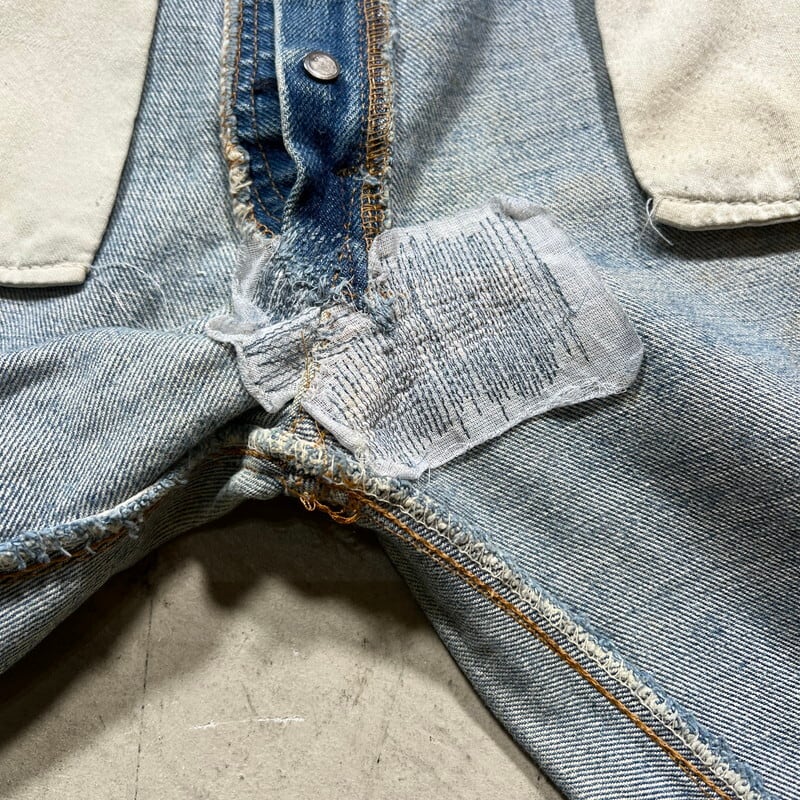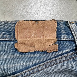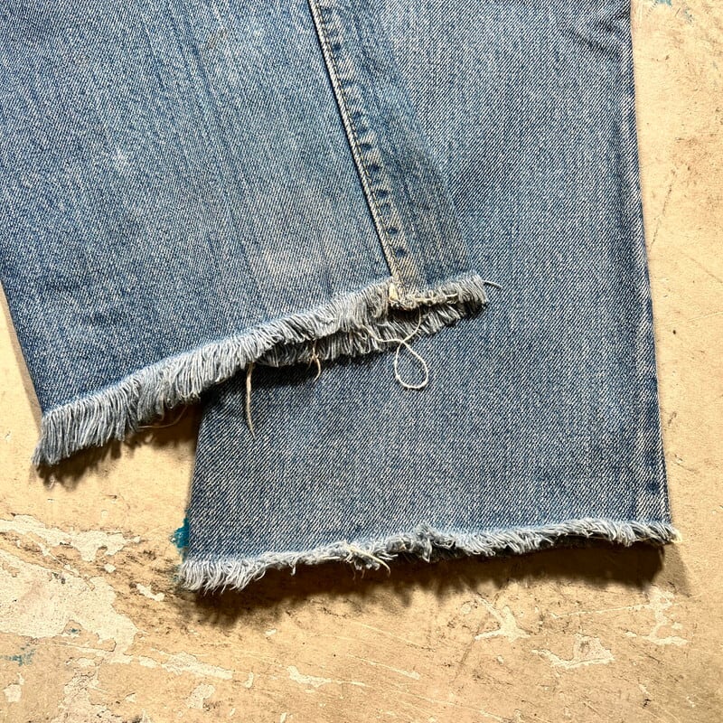 70年代後半のLevi's501 66後期モデルです。トップボタン裏刻印6、ウォッチポケット裏チェーン、セルヴィッジ、アウトシーム裏シングル+チェーン、スモールe赤タブ、バックポケット裏チェーン。全体的に色落ちが激しく色残りは2割程度です。裾がカットオフされており、ポケット縁にダメージや、股にタタキリペア等ございます。パッチも殆ど取れかかっています。使用感は強めですが、この色味でカットオフですので、これからの季節にはサンダル等とも非常に合わせやすいのでは無いでしょうか。レングスが合う方はそのままでも様になりますし、ラフにロールアップしても良いと思います。色の薄さが気になる方はペンキを飛ばしたり、カスタムされてみてはいかがでしょうか。66後期とはいえ今後はさらに入手しづらくなると思われますのでこの機会に是非。