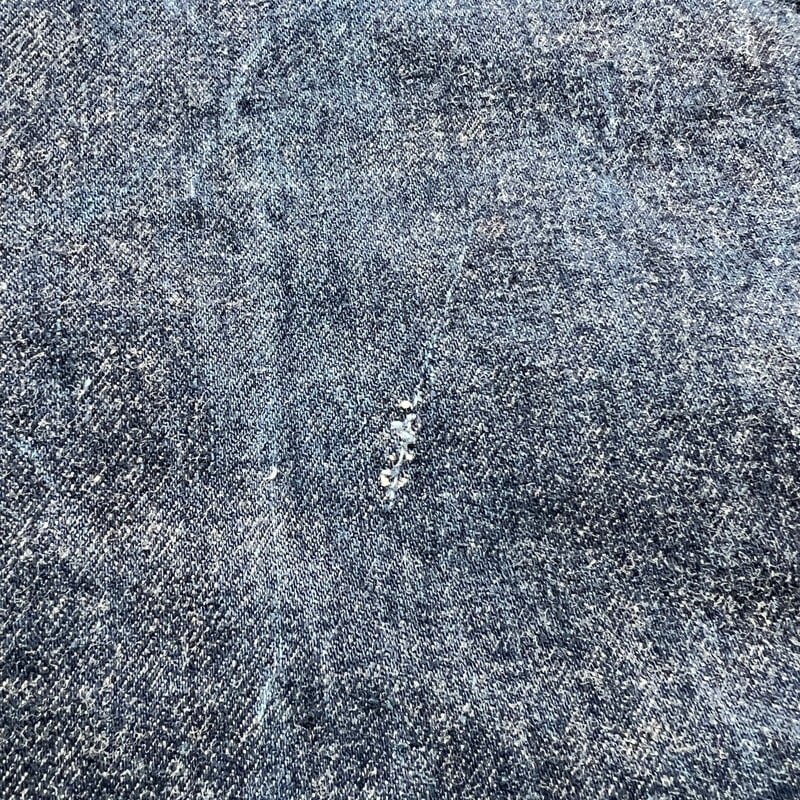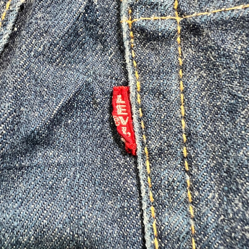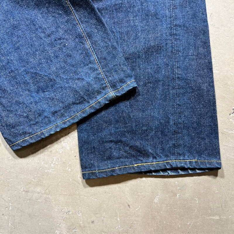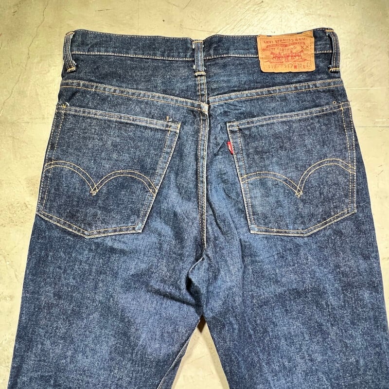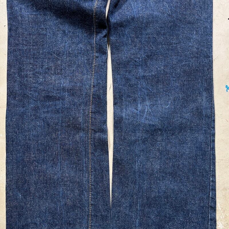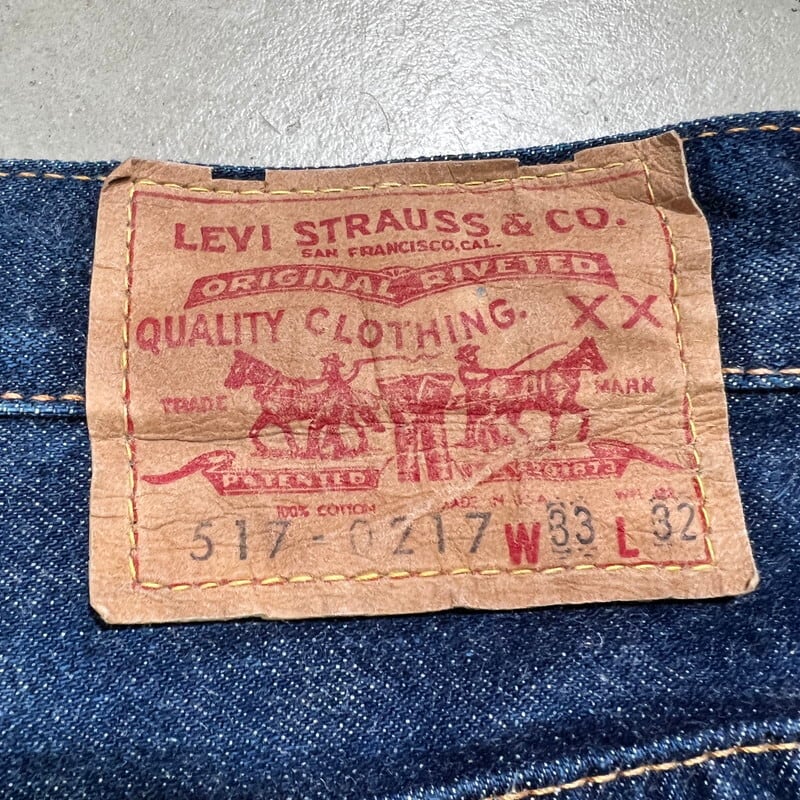 70年代のLEVI'S 517-0217ブーツカットデニムです。トップボタン裏ドット刻印、42TALON、バックポケット裏シングル、アウトシーム裏両面シングル、デカ文字表記、赤タブBig E、不均等V。8割から9割程の濃紺な色残りで、まだ生地に毛羽立ちが見られるミントコンディションです。1971年にデニムラインの517が発売され、66前期へ移行するまでの僅か1~2年程という極めて短い期間のみ製造されていた希少アイテムで、紙パッチの印字はデカ文字と呼ばれる初期頃のモデルです。右膝付近に生地の糸抜けのような箇所がございますが、着用に問題はございません。517と言えば緩やかに裾が広がったブーツカットシルエットで有名ですが、初期頃のモデルの中にはその広がりが極めて緩い物も混在しているようで、こちらの個体はブーツカットというよりほぼストレートシルエットです(一番最後の写真がわかりやすいと思います)。レングスも恐らくオリジナルなので、カットしてフレア部分がなくなったという訳ではございません。ブーツカットが苦手という方でもこの個体はほぼストレートですのでシルエットを気にせず穿いていただけます。ウエストは表記通りW33インチです。ここまで色残りがあり状態の良い最初期の517Big Eはなかなか市場にも出ないと思いますので、お好きな方は是非この機会にいかがでしょうか。今後の入荷は期待できないコレクタブルな1本です。