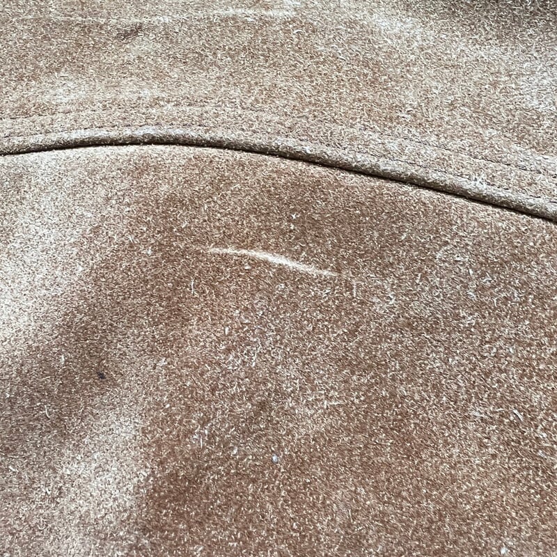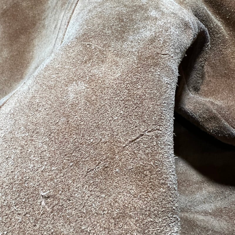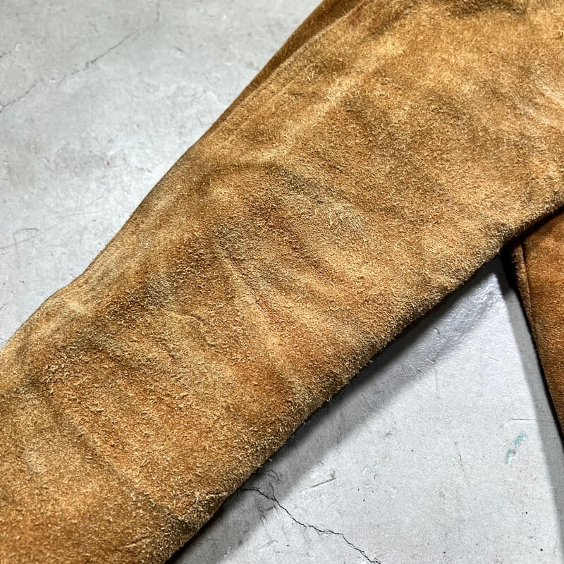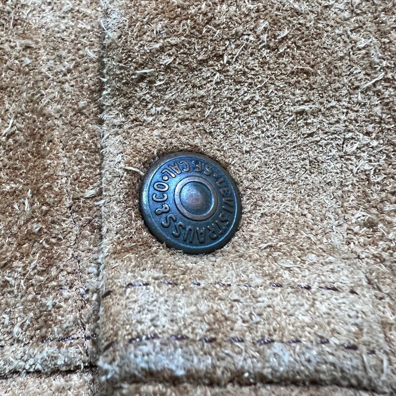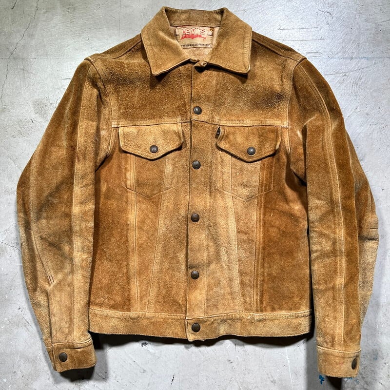 60年代から70年代頃のLevi's(リーバイス)スエードジャケットです。全面ラフスエードを使用した3rdタイプのモデルです。胸元には均等VのBig Eタブが付きます。全体的にスエード特有の毛羽立ちが見られ、擦れや薄汚れがございます。袖先に若干ダメージがございます。目立つ大きなダメージは無くスエード時t来はかなりしっかりとしています。サイズ表記はございませんが、34~36位です。先日出品した506XXに近いサイズ感ですので小柄な方でサイズが合う方は是非いかがでしょうか。大きいサイズの常用が高いですが、このサイズ感のアイテムも意外と見つかりづらいと思いますので、是非この機会にいかがでしょうか。