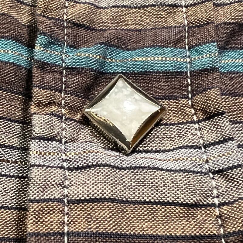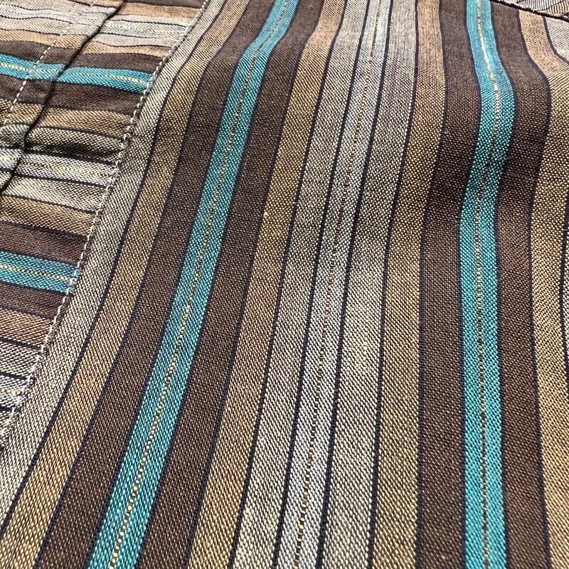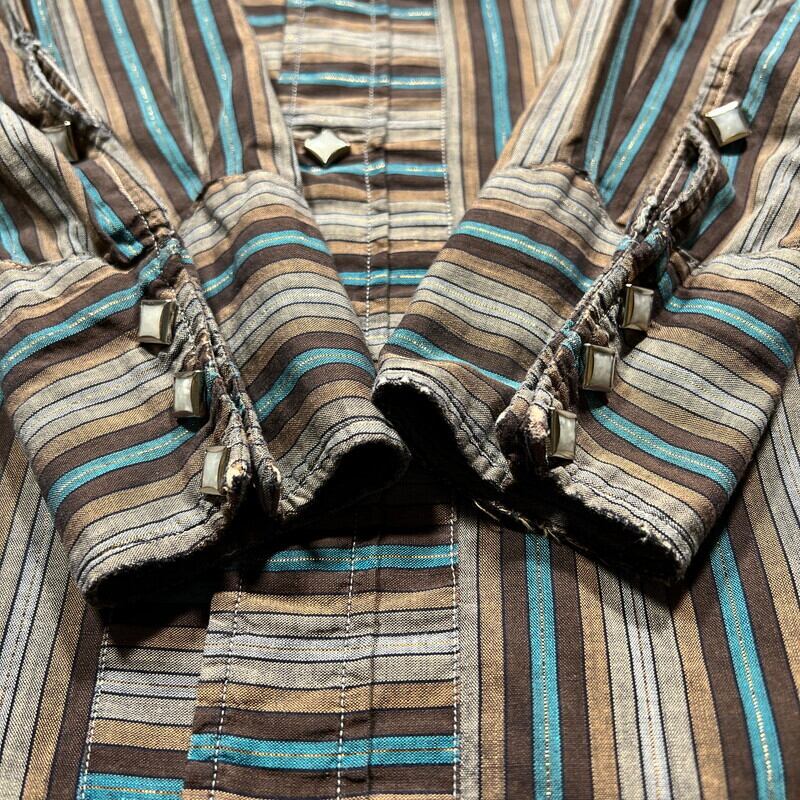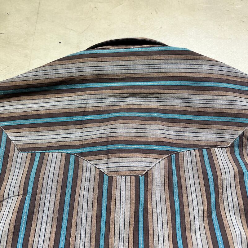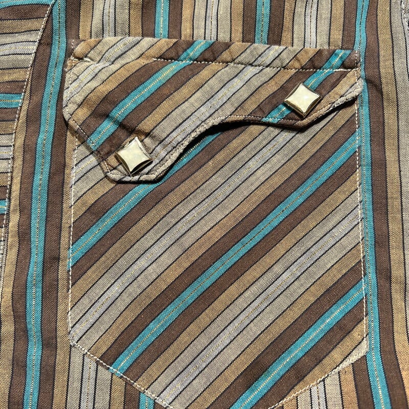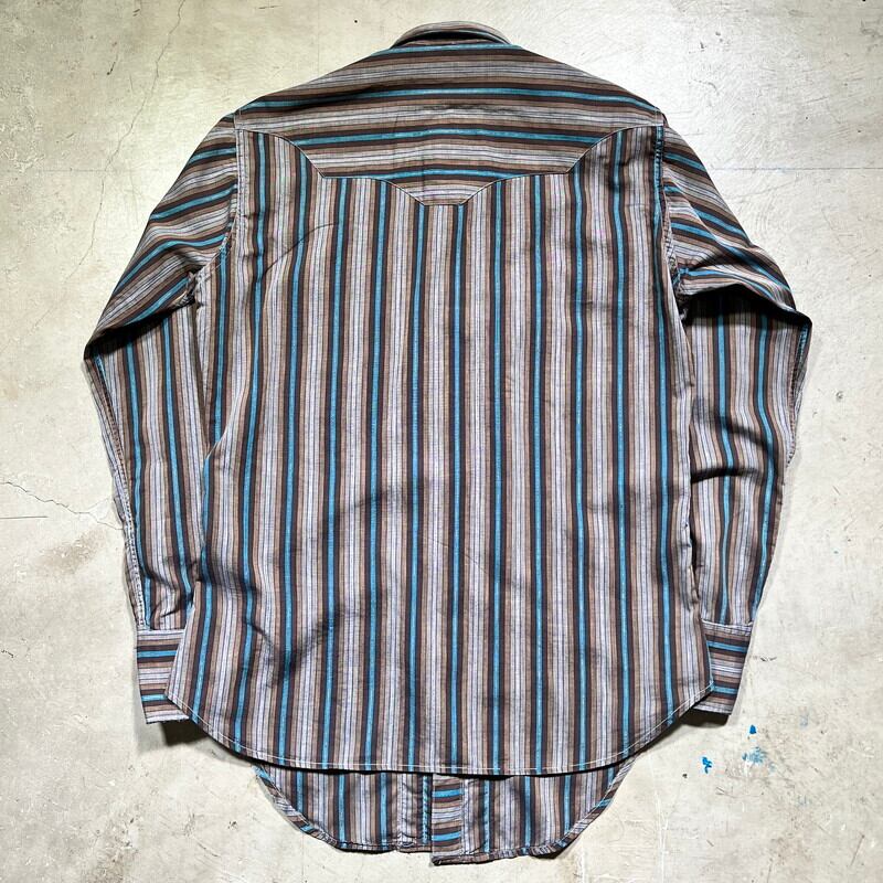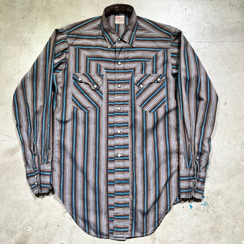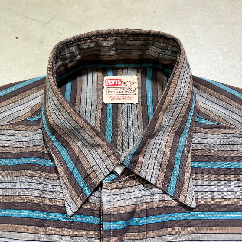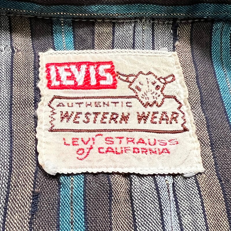 50年代頃のLEVI'Sマルチストライプウェスタンシャツです。貴重なショートホーンタグが付くモデルです。フロントは全てパールの菱型フルスナップボタンです。フラップの形状が特徴的な1着です。少し落ち着いた色味のマルチストライプ柄で、一部に金糸が使われていていますので、良いアクセントとなっています。襟元や袖先に若干の擦れがございますが、その他目立つ汚れも無くコンディションは良好です。袖のスナップが通常と違いカフスのような少し珍しい拝みタイプです。サイズ表記はござませんが、恐らくM相当です。フレアなデニムにシャツインして、941B等のホワイトリーバイスを合わせて少し大人なアメカジスタイルに合わせてみてはいかがでしょうか。