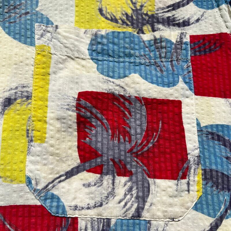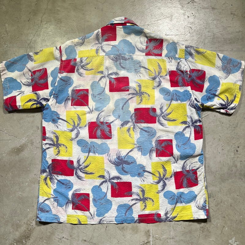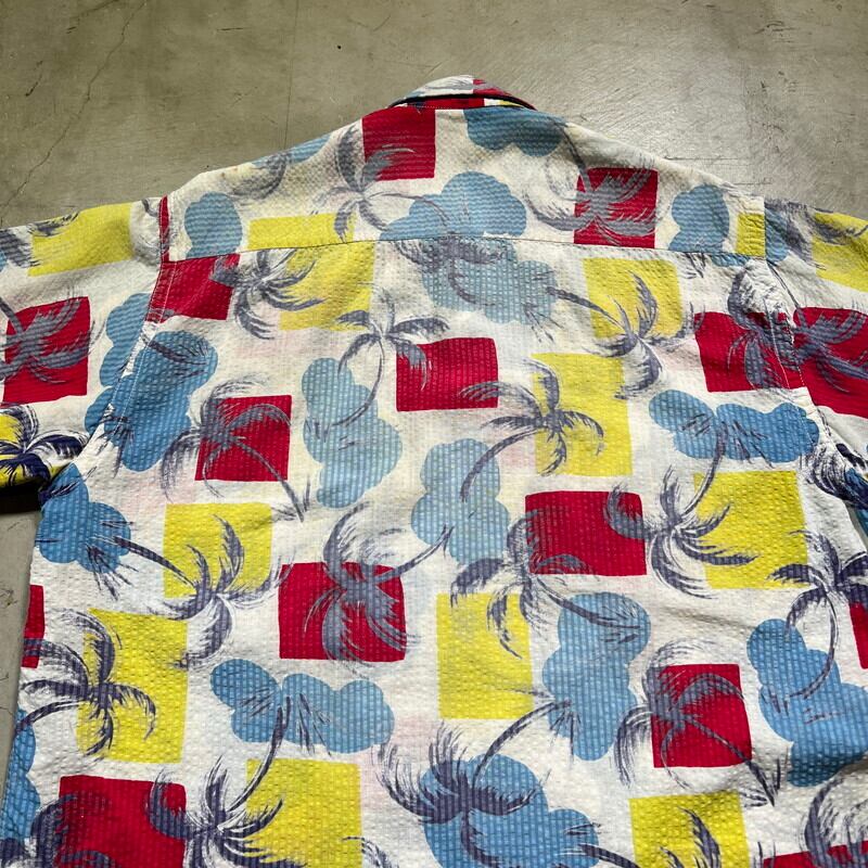 40~50's Unknown シアサッカーシャツ オープンカラー 半袖 パームツリー ハワイアン ベークライトボタン マルチカラー L位 希少 ヴィンテージ BA-1823 RM2242H