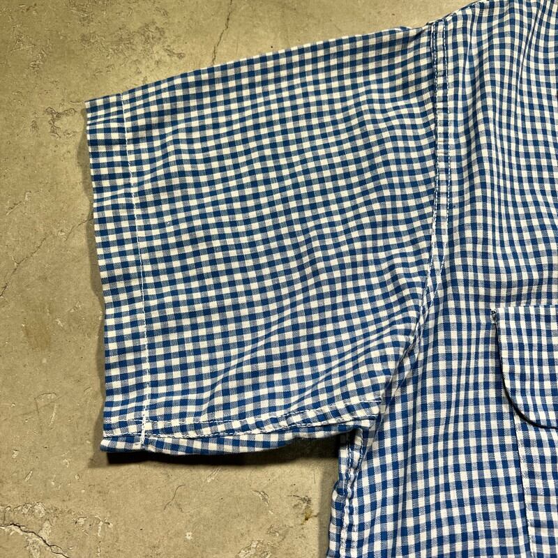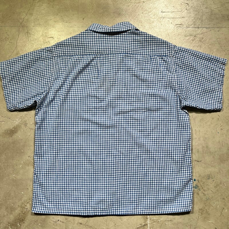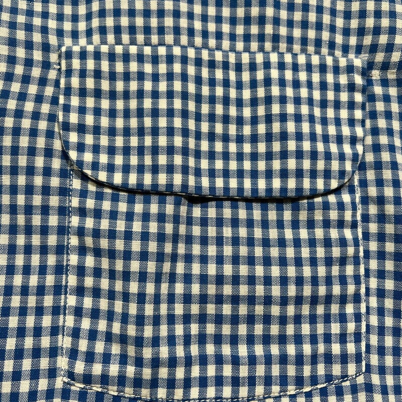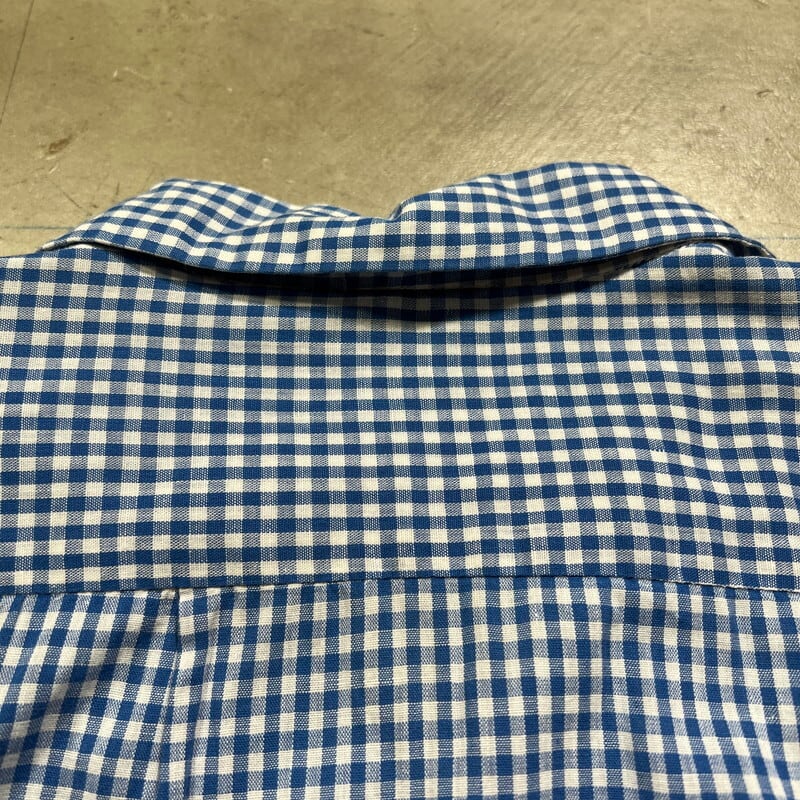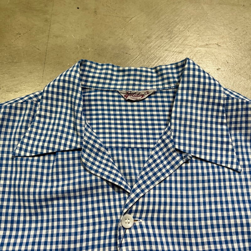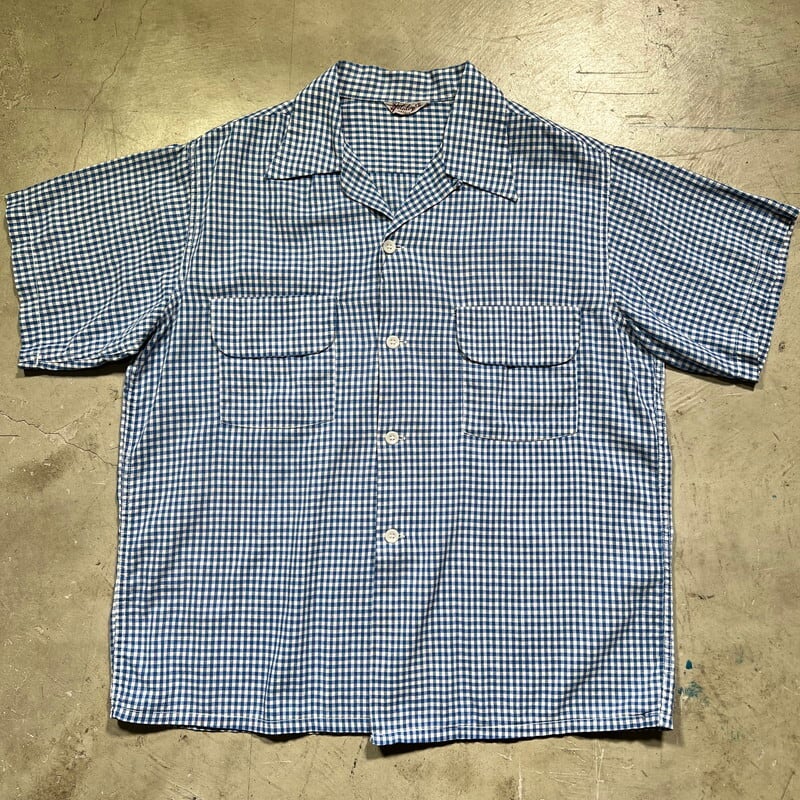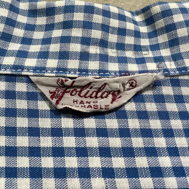 40年代から50年代頃のHolidayギンガムチェックオープンカラーシャツです。1940年代頃からボーリングシャツで有名なKing Louis(キングルイ)を展開していたブランドです。この年代で長袖やウェスタンシャツでは見かける事はありますが、半袖のオープンカラーは珍しいかと思います。丸みのあるフラップ付きポケットも良い雰囲気です。コットン地ですのでさらっとラフに羽織れます。トップのループに若干ほつれはあるもののその他ダメージや汚れの無いグッド痕dh資本です。表記はXLですが、M~L相当の着やすいサイズ感です。着丈も長く無く良いシルエットです。コテコテのヴィンテージ感はありませんので、現行の綺麗目なファッションにも取り入れしやすいのではないでしょうか。シンプルながらもなかなか見かけないギンガムチェックのオープンカラーシャツですので、お探しだった方は是非この機会をお見逃しなく。
