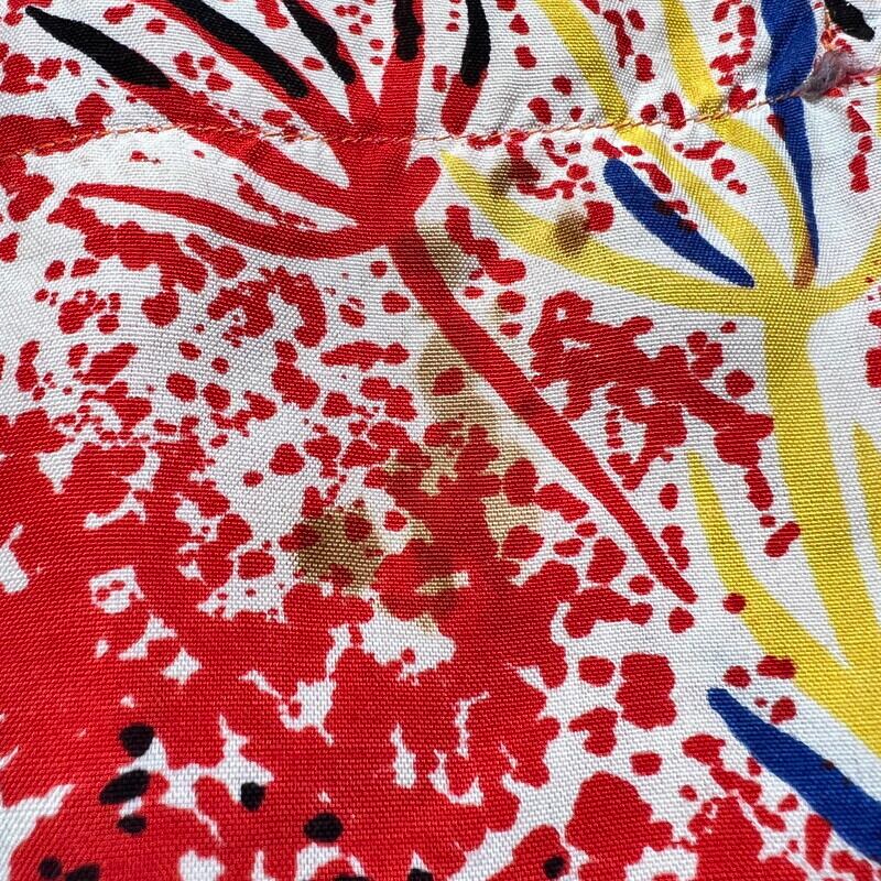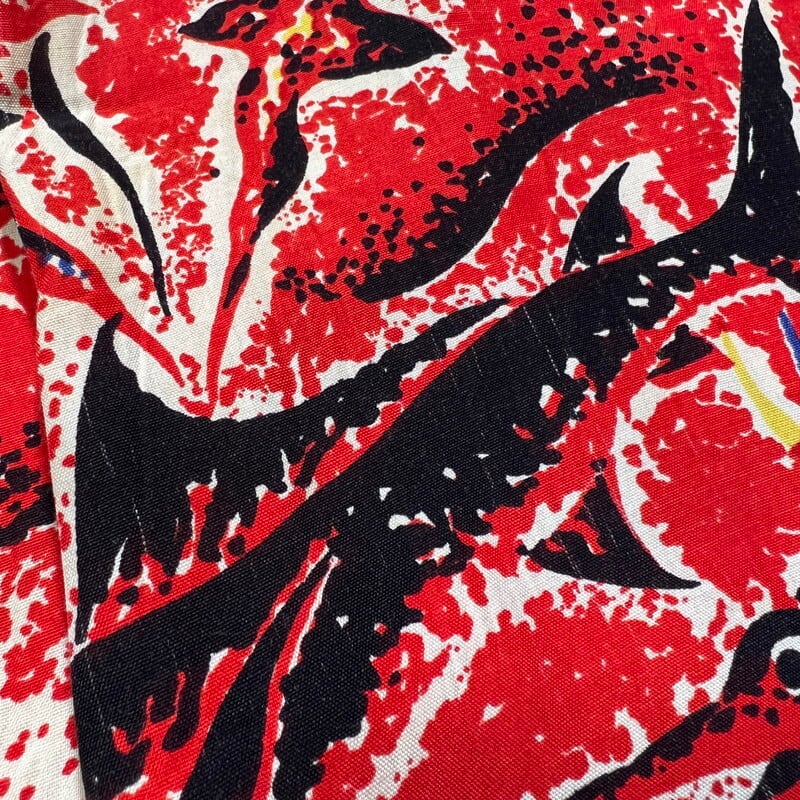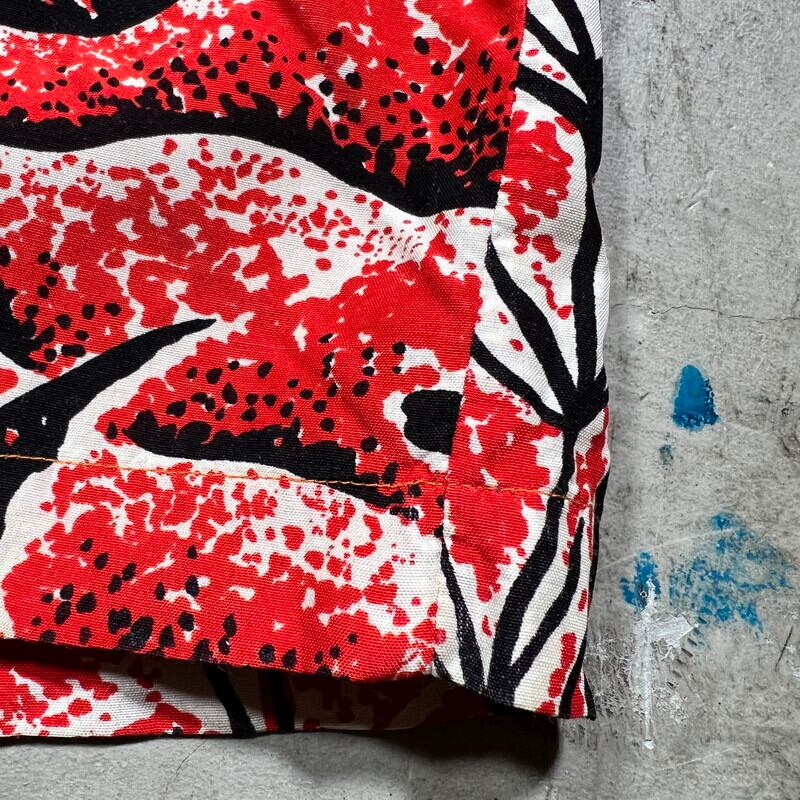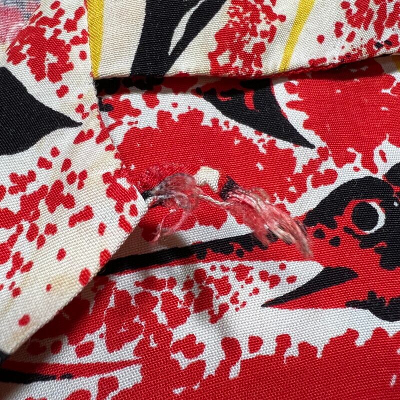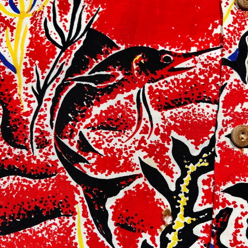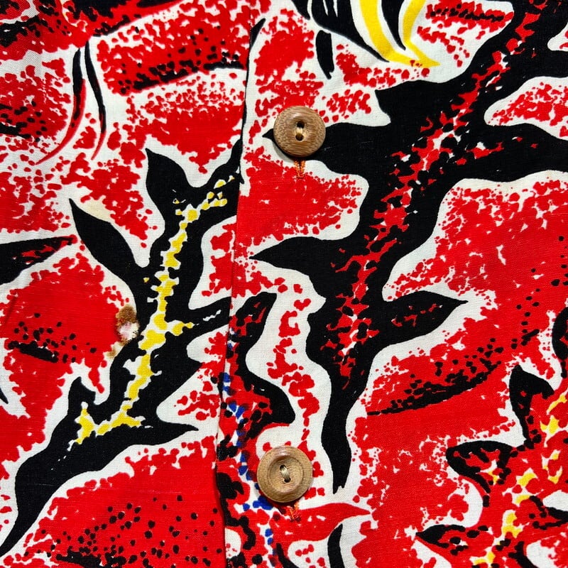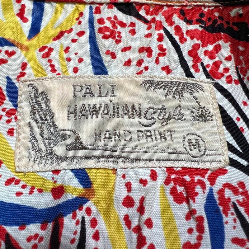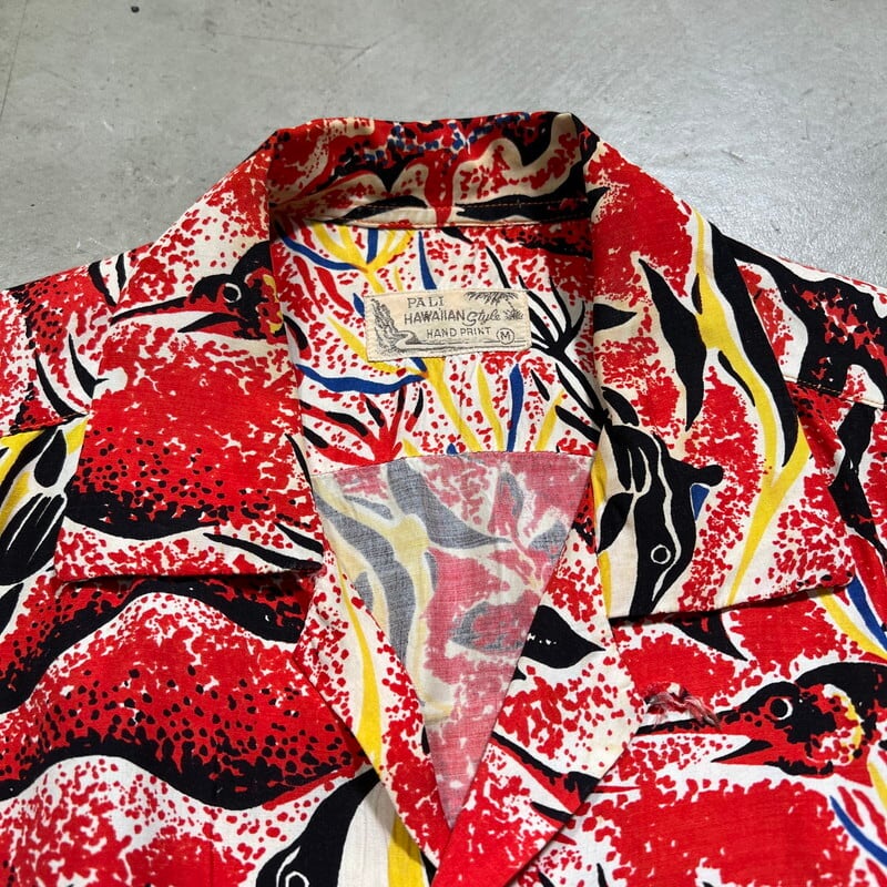 50年代のPALI HAWAIIAN STYLEレーヨンアロハシャツです。終戦後に京都でプリント工場を設立したイサム・タカブキという人物がハワイに商社、大阪に貿易会社も立ち上げ日本でプリントした生地をハワイへ輸出する事業を始めました。その後、イサム・タカブキの娘とカリフォルニアで結婚したクラレンス・ハラは、イサム・タカブキの勧めで売り出したシャツがこのPALI HAWAIIAN STYLEです。1960年にGo Brarefootへとブランド名を変更しています。ご紹介するこちらは、全面にプリントが施されたオールオーバーパターンで、鮮やかな色彩でカジキ(セイルフィッシュ)やツノダシ(ムーリッシュアイドル)が描かれいます。ボタンは全てバンブーボタンが使用されています(1番下は欠損していた為取り換えています)。トップボタンのループが解れてしまっているので使用できません。フロント腹部付近に5mm程の穴が開いていますが、ボタン裏の裏地と重なっている場所なので、中が透ける心配はございません。ポケットにはシミがございます。小穴以外は比較的良好なお品です。Mサイズですので、需要も高いのでは無いでしょうか。日本とハワイ、カリフォルニアを繋ぎアロハシャツの歴史の中でも中枢を担ったと言っても過言では無いブランドです。小穴こそございますが、色褪せもほとんど無くデザインも素晴らしいので、お好きな方は是非この機会にいかがでしょうか。