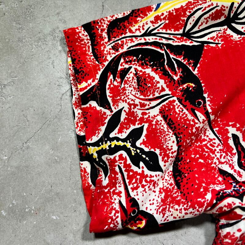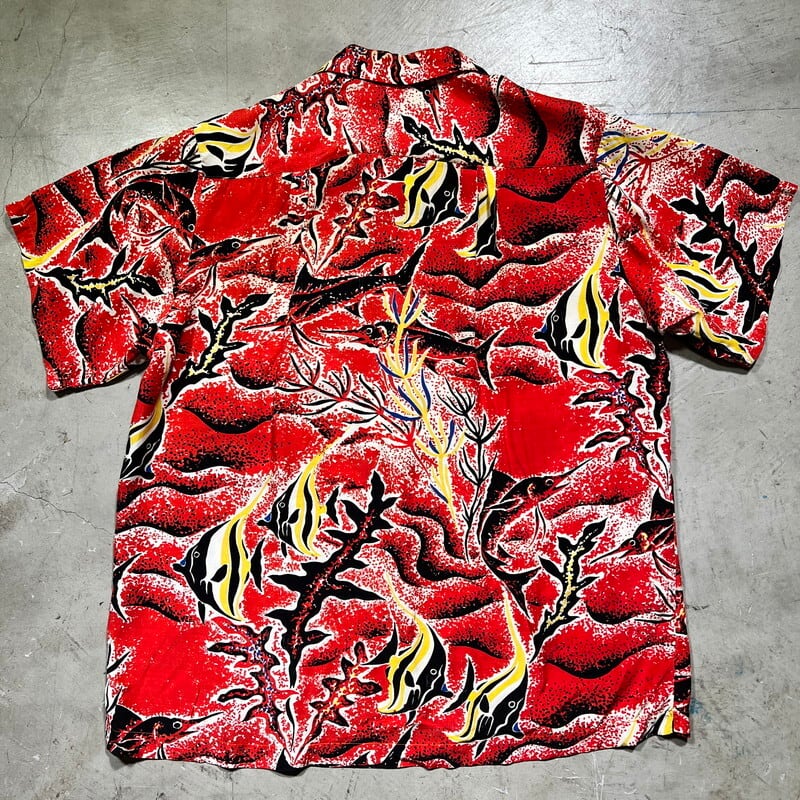 50's PALI HAWAIIAN STYLE レーヨンアロハシャツ ハワイアンシャツオールオーバーパターン カジキ ツノダシ ハンドプリント Mサイズ 希少 ヴィンテージ BA-1825 RM2244H