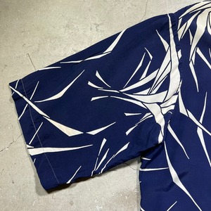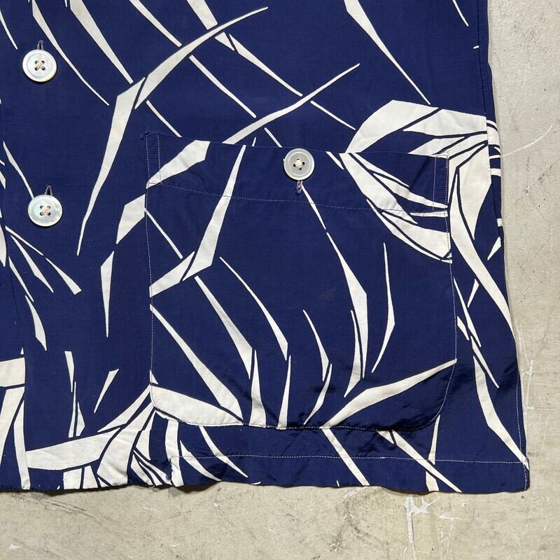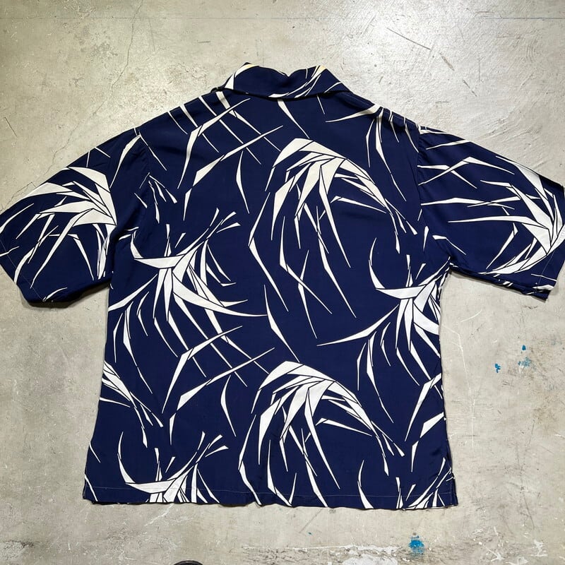 40's~ Loy's MEN'S WEAR レーヨンハワイアンシャツ アロハシャツ ビーチシャツ ネイビー ホワイト 草柄 ススキ ロングポイント パチポケ L位 希少 ヴィンテージ BA-1826 RM2245H