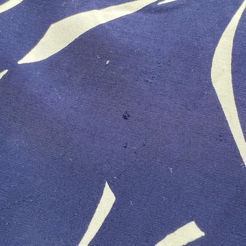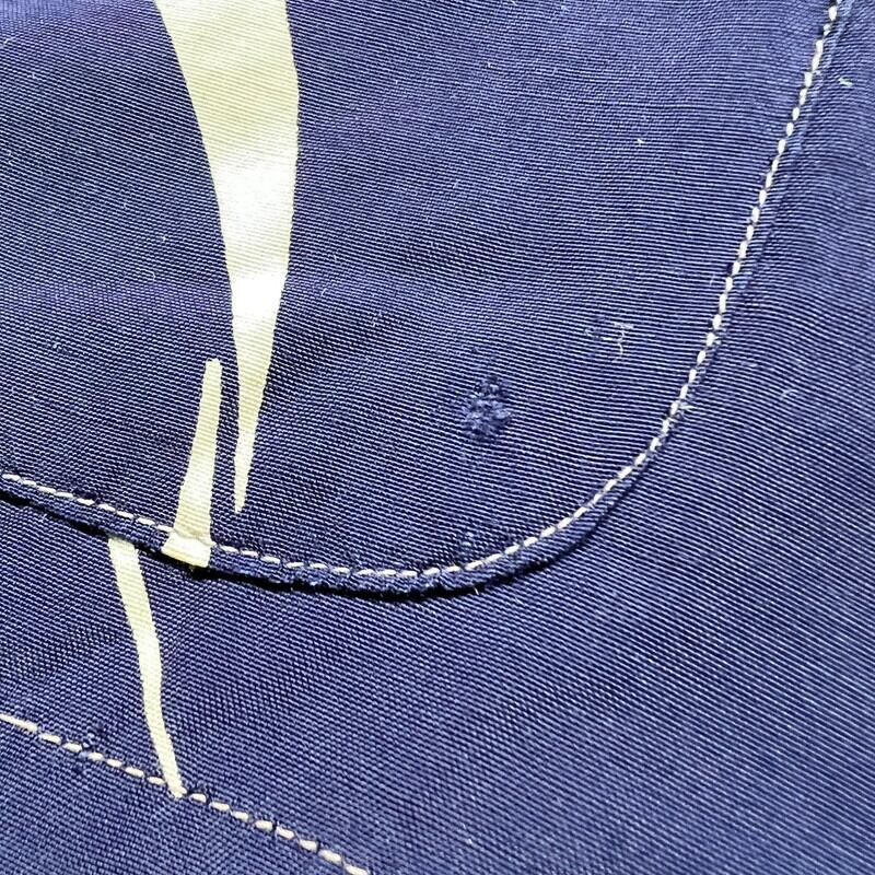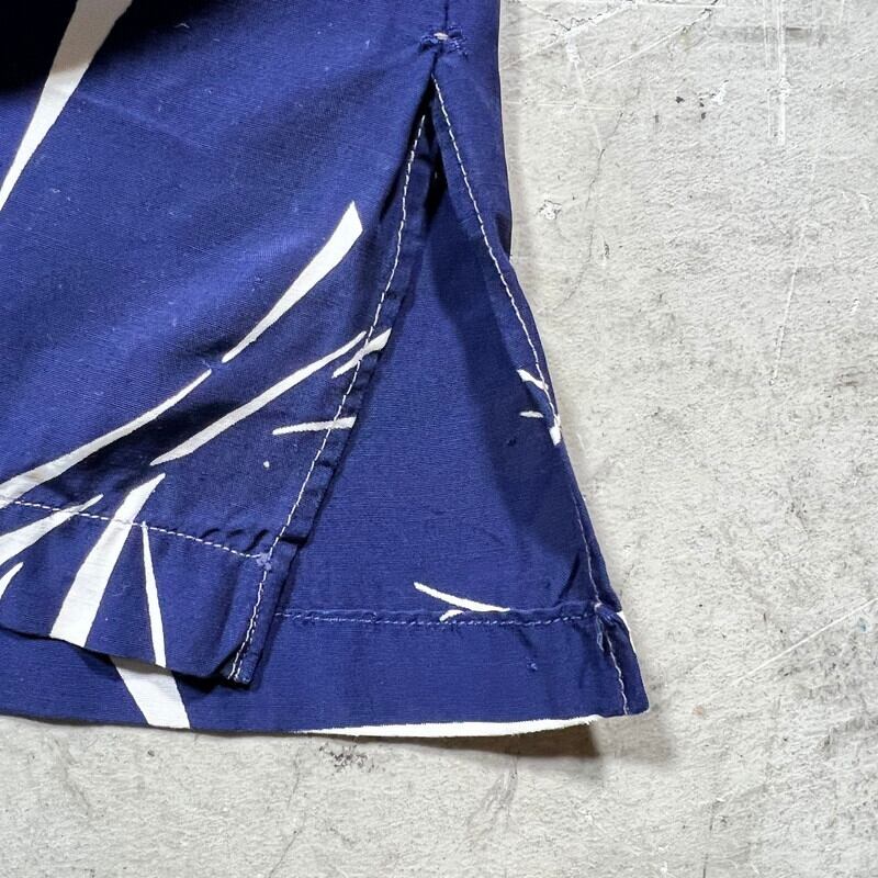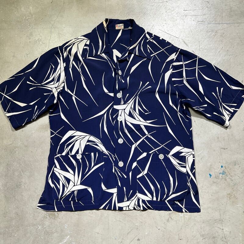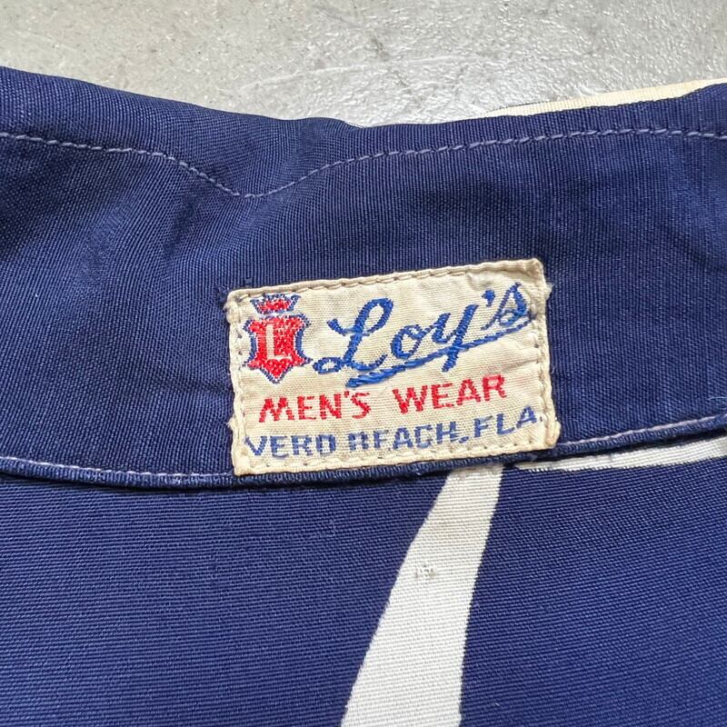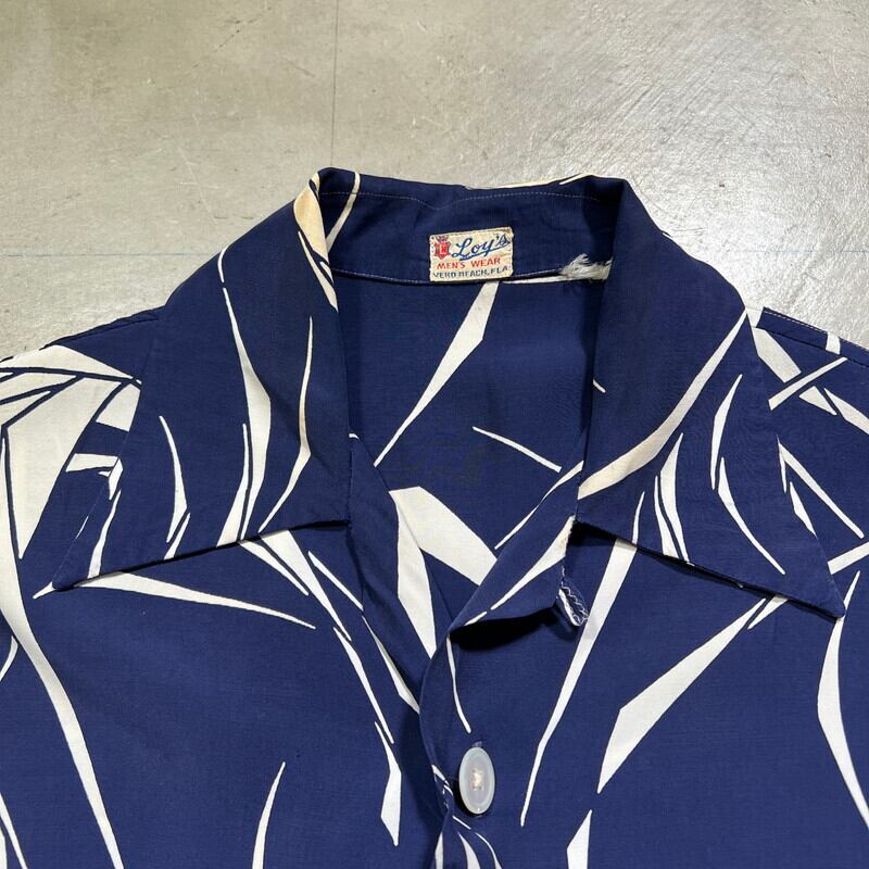 40年代頃のLoy's MEN'S WEARレーヨンハワイアンシャツです。ブランドの詳細が不明ですが、フロリダのVERO BEACHで地域社会に貢献したAlma Lee Loyという女性が衣料品店を高校や大学で営んでいたようなので、もしかするとそのショップのオリジナルウェアかもしれません。素材は恐らくレーヨンです。紺に白いススキの葉のような柄が全面に入るパターンです。全てシェルボタンが使用されています。襟も長めで、シェルボタンが使用されています。袖が通常のレーヨンシャツに比べやや長めに作られています。フロント下部にはパチポケが付く仕様で、ビーチシャツのようなデザインです。両サイドにはスリットが入ります。30年代頃のLeeのように襟下では無く襟に直接縫い付けられたタグも非常に興味深い特徴です。襟元に若干の薄汚れはございますが、その他目立つ汚れやダメージは無くコンディションは良好です。サイズ表記はござませんがL相当です。雰囲気が良くパチポケ付きの個体はなかなか出ない印象ですので、お好きな方は是非この機会にいかがでしょうか。色味も合わせやすいのでお勧めです。