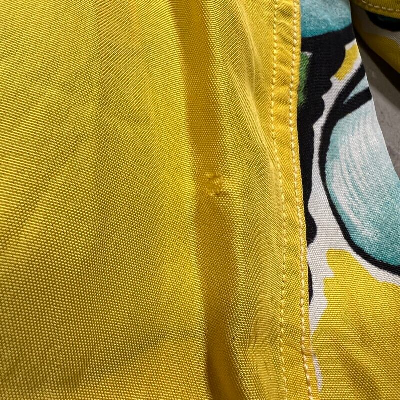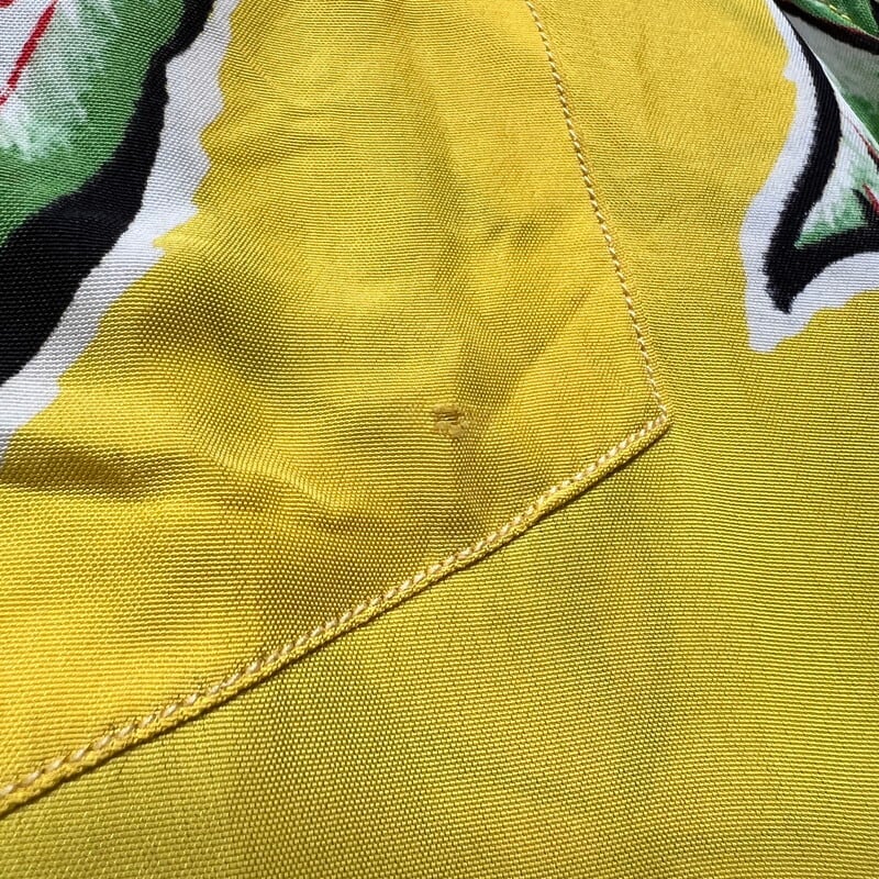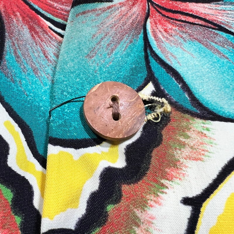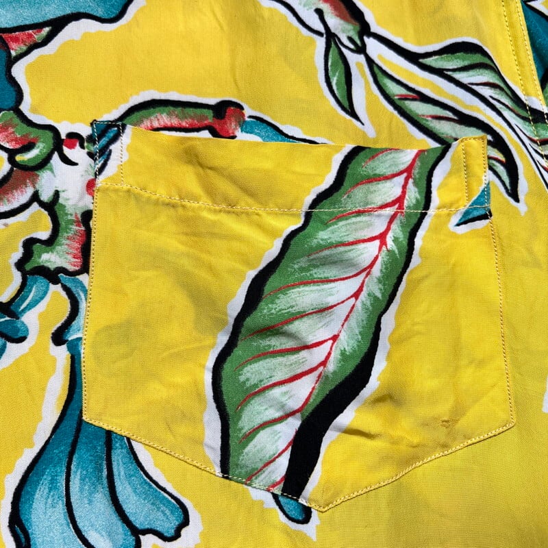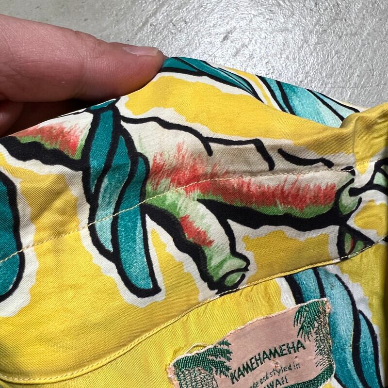 40年代頃のKAMEHAMEHAレーヨンハワイアンシャツです。1936年に創業した老舗アロハシャツブランドです。イエローのボディにターコイズブルーのプルメリアが全面にプリントされたデザインです。全てココナッツボタンが使用されています。襟先が長いロングポイントでヴィンテージアロハらしいディティールと言えます。胸元のポケットの形状は趣のある横長のホームベース型です。首元にうっすらと汚れがあり、その他細かく小さなシミがございます。1mm以下の極小のピンホールもいくつか見られます。その他細かな擦れなどございますが、ヤケなどの褪色も殆ど無く年代物のアロハとしてはかなりコンディションが良い個体だと思います。大きな柄とその柄の隙間のバランスも良く非常に見ごたえのあるデザインです。やはりヴィンテージデニムとシンプルに合わせてほしいそんなスペシャルな1着です。ヴィンテージアロハをお探しだった方は是非この夏にいかがでしょうか。