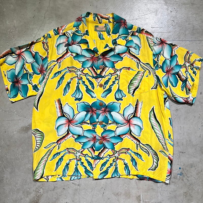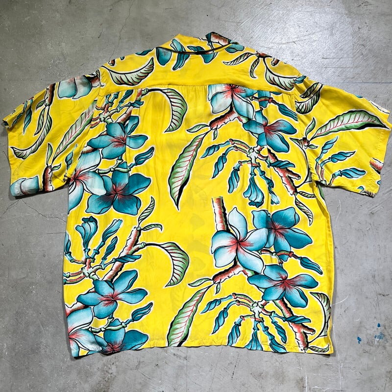 40's KAMEHAMEHA カメハメハ レーヨンハワイアンシャツ アロハシャツ プルメリア柄 オールオーバーパターン イエロー ロングポイント ココナッツボタン 美品 L相当 希少 ヴィンテージ BA-1827 RM2246H