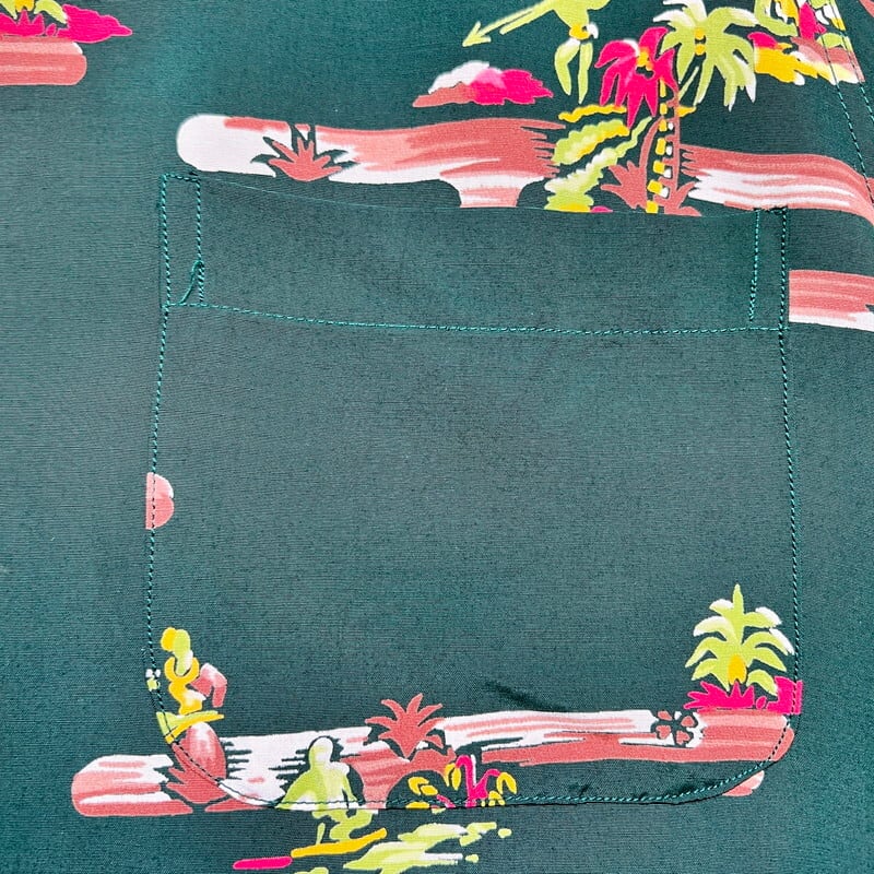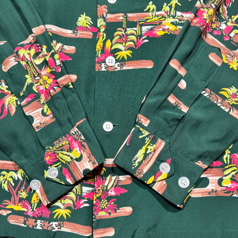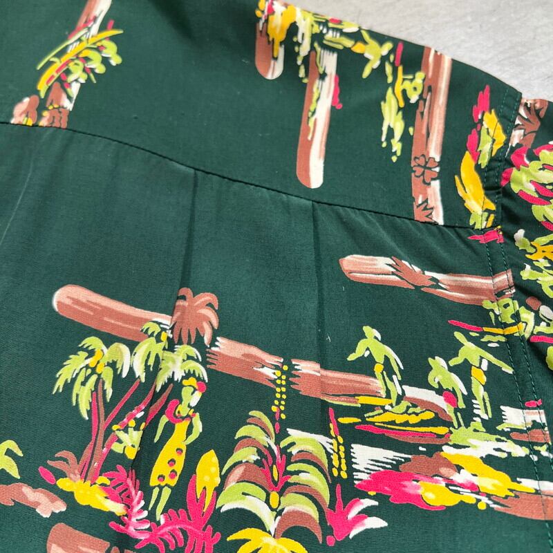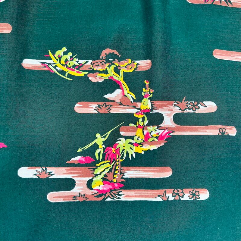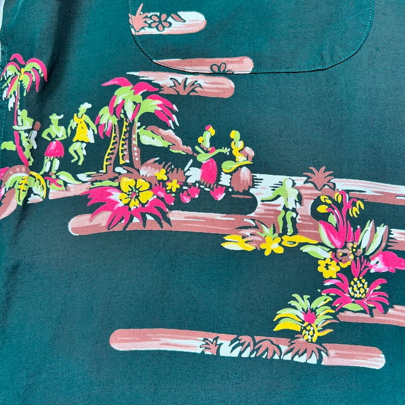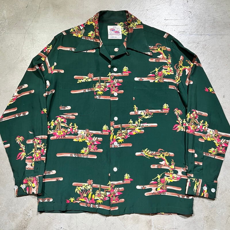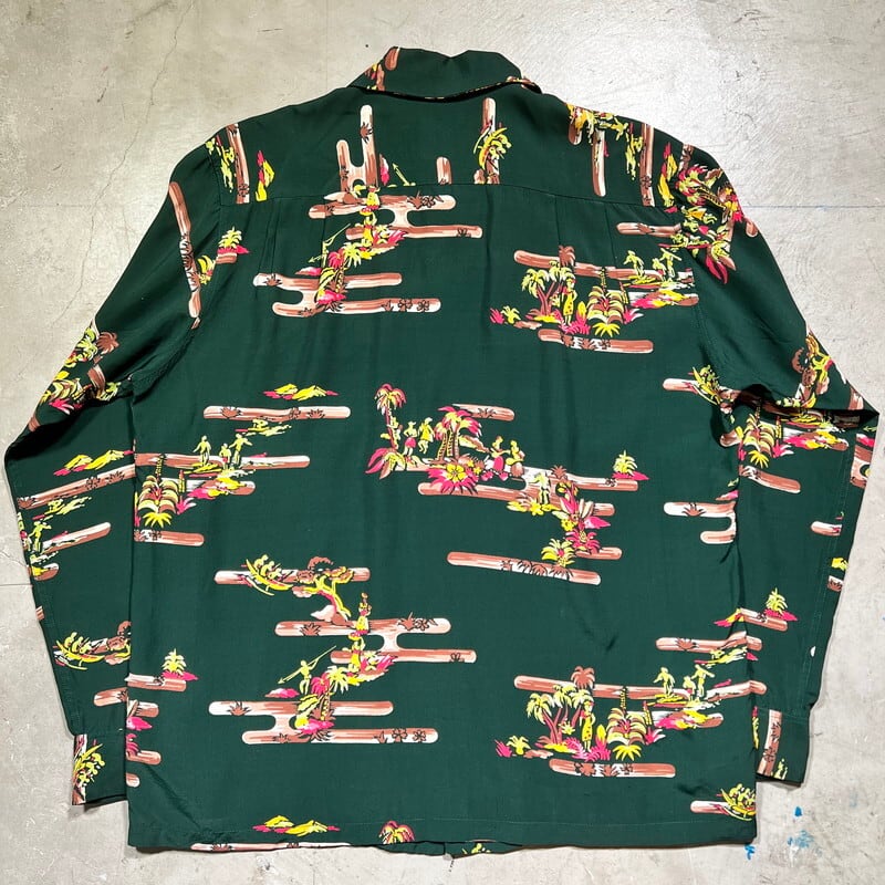 SPECIAL!! 40's DUKE KAHANAMOKU デュークカハナモク 長袖レーヨンハワイアンシャツ アロハシャツ オールオーバーパターン シェルボタン フラガール サーファー アウトリガーカヌー パームツリー グリーン Mサイズ 美品 希少 ヴィンテージ BA-1827 RM2246H