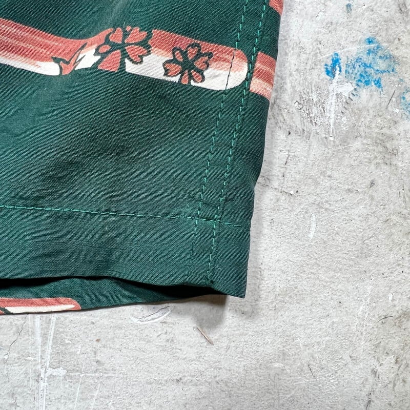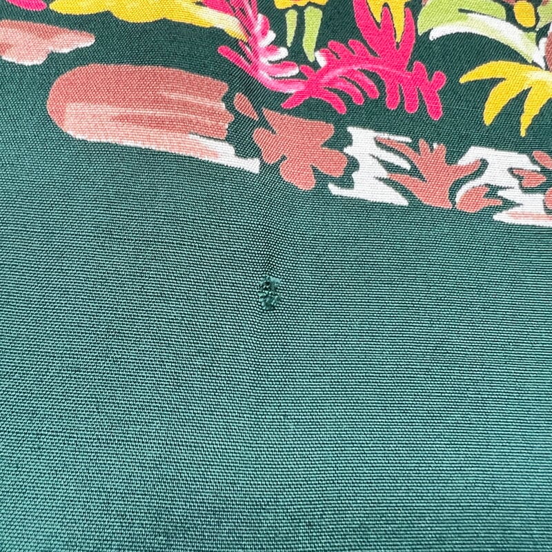 40年代のDUKE KAHANAMOKU長袖レーヨンハワイアンシャツです。1936年に創業したブランフリート・スポーツウェア社が1937年、それまでに水泳の大会で数々のメダルを獲得していたデュークカハナモクと契約しブランドがスタートしたとされています。アロハシャツの名門で、ヴィンテージがお好きな方では知らない人は居ないと言っても過言ではありません。今回ご紹介するこちらは、1949年にCISCO社へブランドの権利が譲渡される以前の初期タグが付くモデルで、ヴィンテージアロハシャツの中でも貴重とされる長袖仕様の1着です。襟はロングポイント、シェルボタンが使われています。フラガールや、サーファー、アウトリガーカヌーなど島民の生活が全面に描かれたオールオーバーパターンです。袖は剣ボロとなっています。細かな擦れや薄く目立ちにくい汚れ、ピンホール等はございますが、非常にコンディションも良くヤケ等もございません。Mサイズ表記ですが身幅もしっかりとあるので、綺麗なボックスシルエットです。デュークカハナモクの中でも名作と言えるスペシャルピースだと思います。ヴィンテージの長袖アロハをお探しだった方は是非この機会にいかがでしょうか。