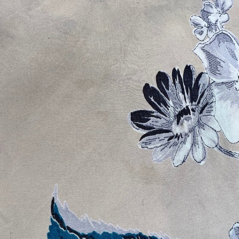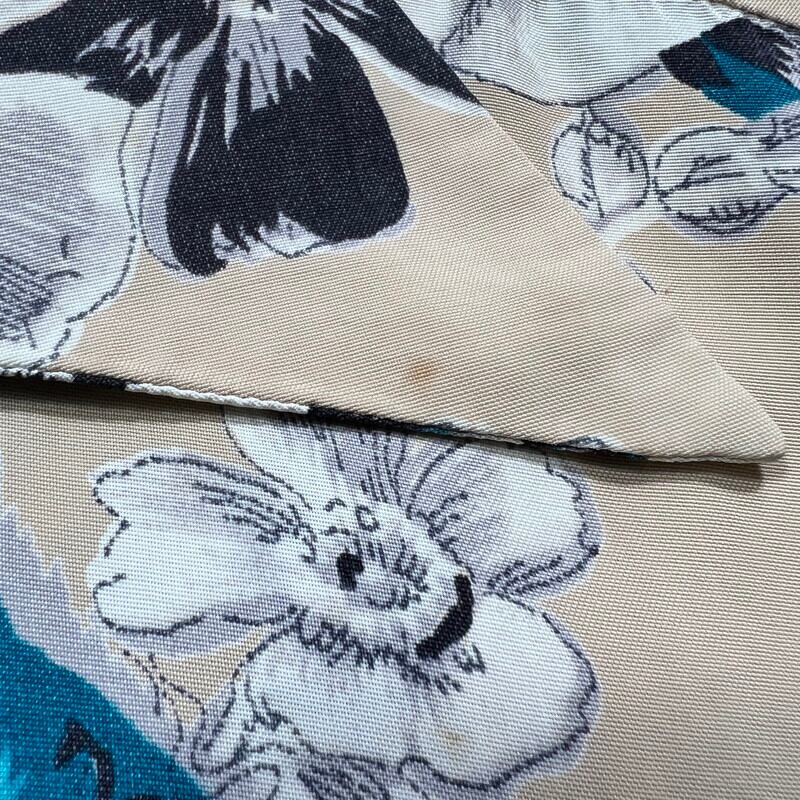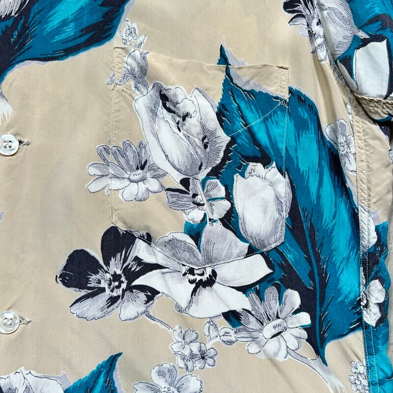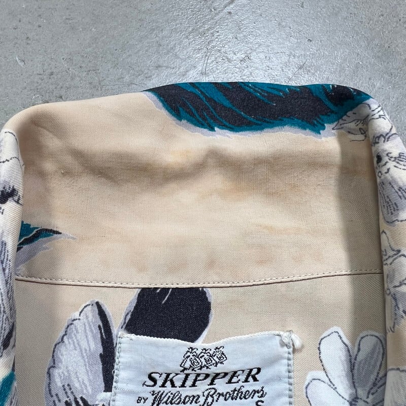 50年代頃のSKIPPER レーヨンハワイアンシャツです。1864年オハイオ州シンシナシティで4人の兄弟で設立されたメンズ衣料のブランドです。スポーツウェアブランドのWilsonとは別の会社です。淡いベージュボディにターコイズブルーが映える1着です。やや長めのロングポイントで、白蝶貝のボタンが使用されています。線画で描かれたバラや、ローズマリー、ユリ科の花がいくつも描かれています。通常のアロハシャツとは違いどこかアーティスティックな印象です。襟元に汚れがあり、小さなシミや薄汚れがいくつかかございます。右肩後に糸抜けのように線が入板箇所はございますがその他気になるピンホール等は特に無いかと思います。Sサイズ表記ですので、女性も着やすいサイズ感で、スレンダーな男子ならジャスト感覚で合わせていただけると思います。コンディション自体はそこまで悪くないですが、襟元の汚れを考慮した状態特価とさせていただいておりますのでお好きな方は是非いかがでしょうか。
