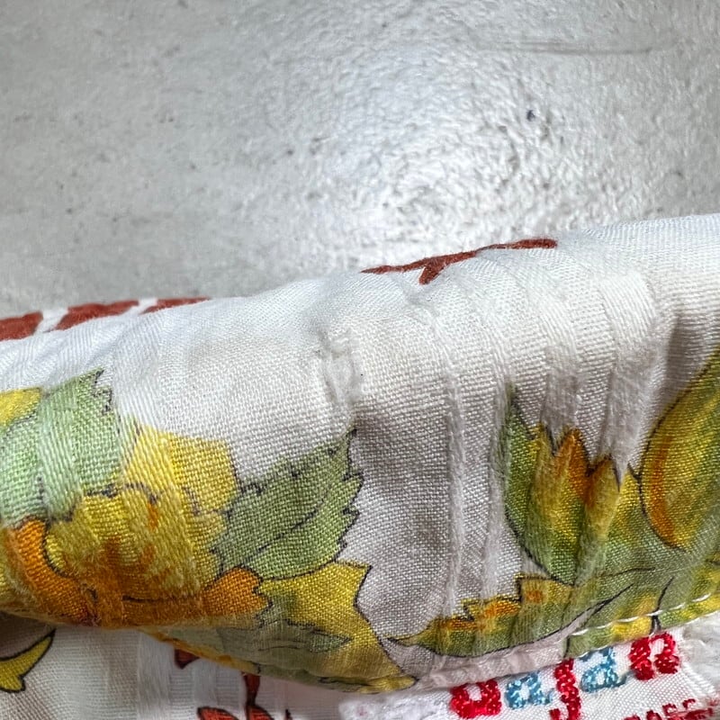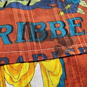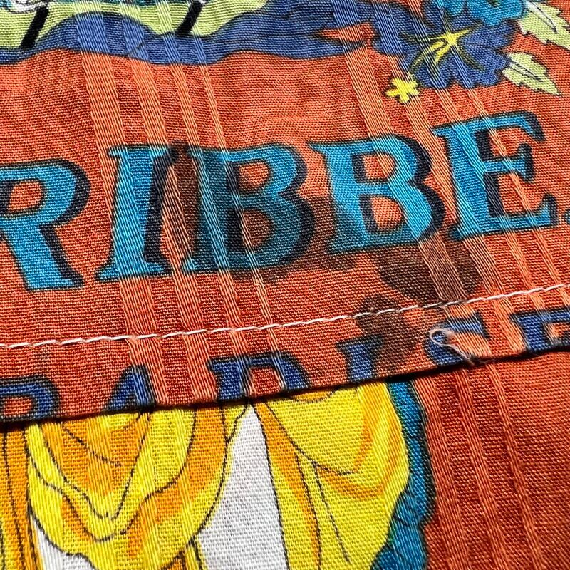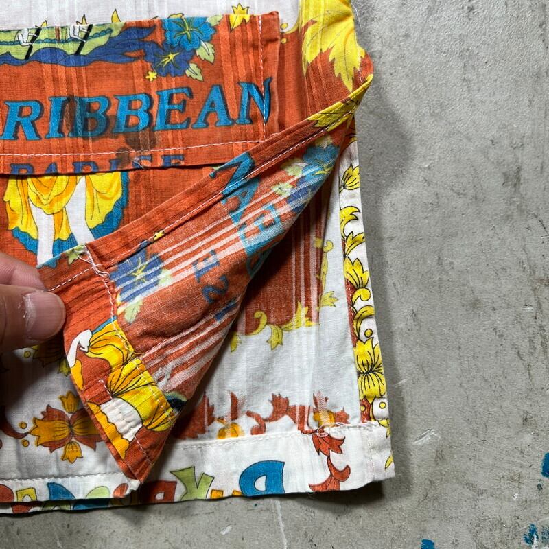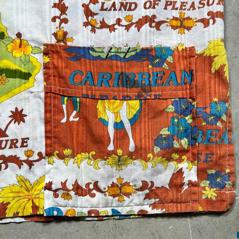 70年代頃のBajanカリビアンビーチシャツです。ブランド詳細は不明ですが、東カリブ海に浮かぶバルバドス製です。こちらも観光客向けのお土産品であったと考えられます。前面にプリントが入り、2パターンの図柄が交互に配置されたオールオーバーパターンです。バルバドスの島やダンスを踊る男女等綺麗な色彩で描かれています。襟は70年代に見られる大木外に広がったデザインで、開襟しようでトップにループボタンは付きません。下部に2つのパチポケが付くビーチシャツのようなデザインです。サイドにはスリットが入ります。襟にうっすらとした変色や小穴があり左のポケットに黒っぽいインク染みが見られます。その他目立つ汚れやダメージは無く状態は良好と言えます。サイズ表記はLです。年代こそ古くはございませんが、雰囲気の良いデザインですのでお勧めです。