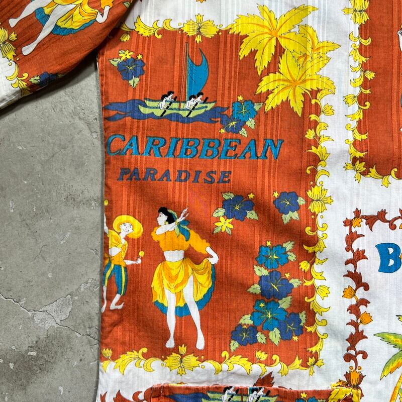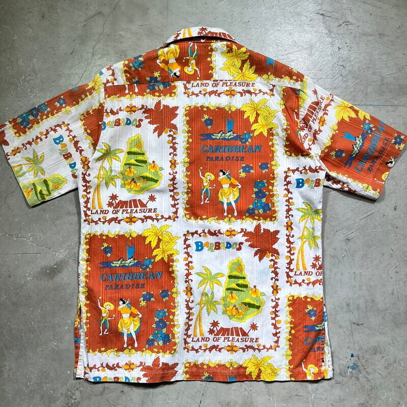 70's~ Bajan カリビアンビーチシャツ スーベニアシャツ BARBADOS CARIBEAN PARADISE パチポケ 総柄 オールオーバーパターン Lサイズ 希少 ヴィンテージ BA-1830 RM2249H