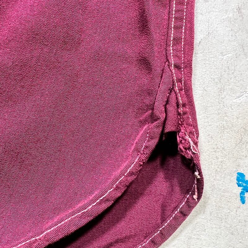 50年代から60年代頃のBOWLING SHIRT BY EMPIRE レーヨンギャバジンボーリングシャツです。1919年に創業したアスレチックウェアブランドです。レーヨンのギャバジン織で袋縫いされた襟に、丸みのあるフラップが時代を感じさせるディティールです。ボディと同色の樹脂系ボタンは欠損無く揃っています。ボーリングシャツでは比較的珍しいボックス型では無く裾がラウンドし、サイドにマチが付く仕様です。背面にはEl-Toroという地名がチェーンステッチで丁寧に施されています。襟元にうっすらと色褪せ、裾に薄汚れございます。背面に小さなダメージが2カ所確認できます。Lサイズでゆとりのあるサイズですので、タンクトップの上に軽く羽織るだけでも、とても様になる1着です。渋い色味で使い勝手が良いので、お勧めです。お探しだった方は是非いかがでしょうか。