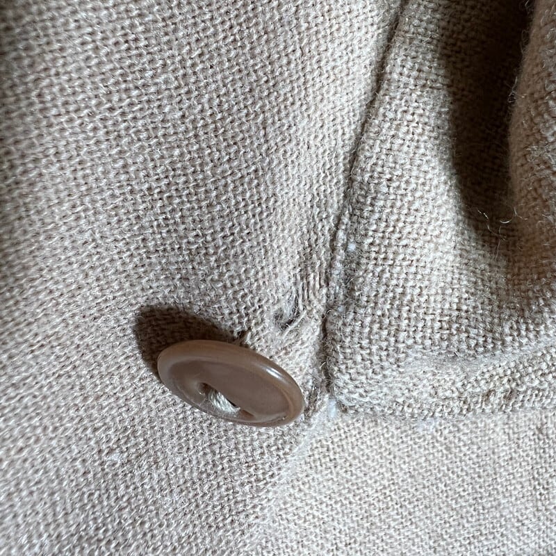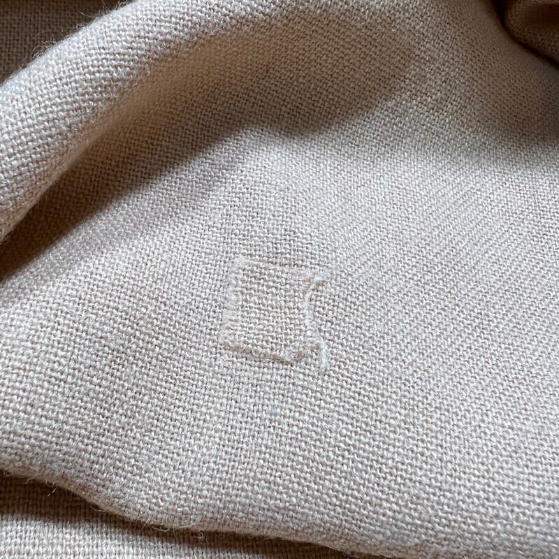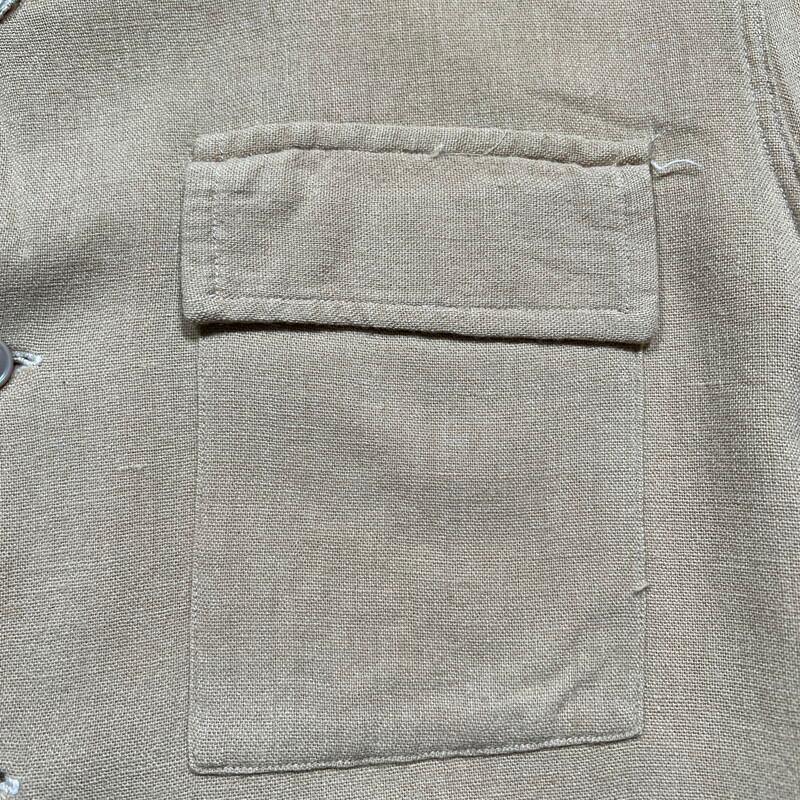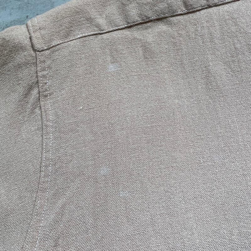 40年代頃のSports Wearオープンカラーシャツです。古いプリントタグが付きますが、ブランド詳細は不明です。襟先が長いロングポイント仕様です。フロントは猫目、ループはオーバルボタンが取り付けられています。フラップの形状はスクエア型で角ばっています。ループボタン付近に小さなダメージがあり、背中の真ん中に小穴を塞いだリペアが1カ所ございます。背面にいくつか白っぽく変色している箇所もございます。襟の後ろにも小穴をボンドの様な物で塞いだ痕跡がございます。その他毛羽立ち等はございますが、目立つ汚れや大きなダメージは無く良好です。柄等は無く非常にシンプルながらもひと目で古いとわかる玄人好みなアイテムだと思います。Mサイズで着丈はやや長めなので、背の高い方も着やすいサイズ感です。シンプルなヴィンテージシャツをお探しだった方は是非この機会にいかがでしょうか。