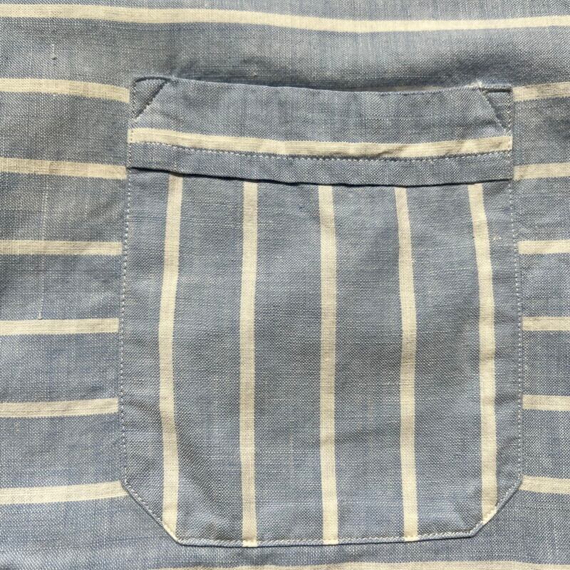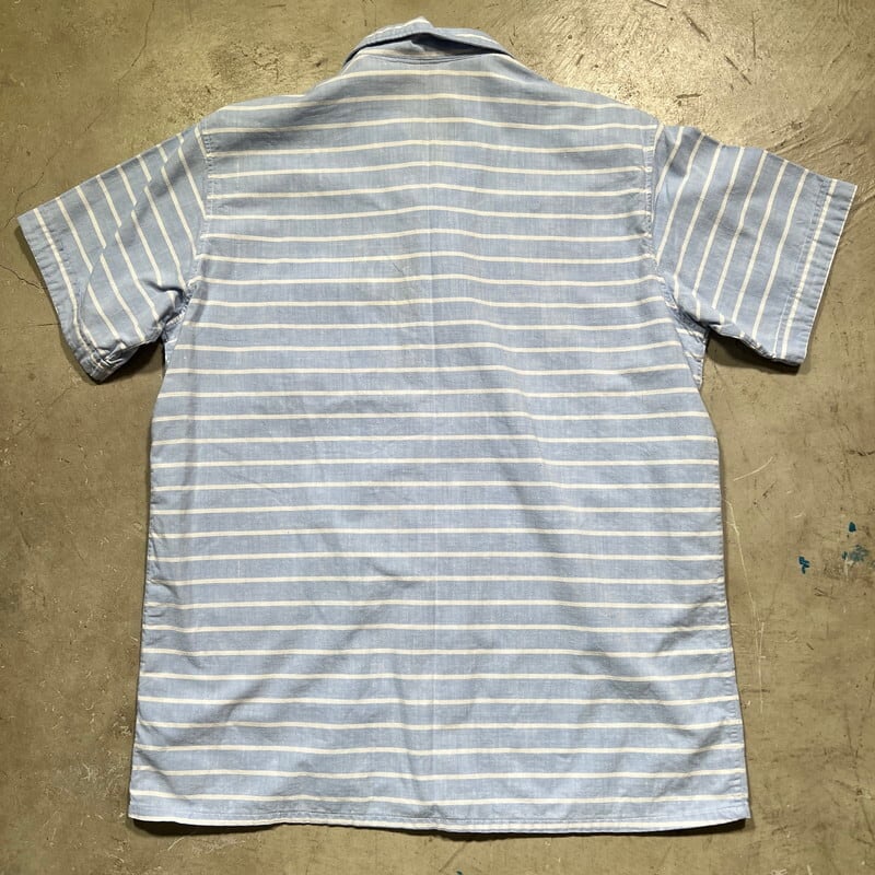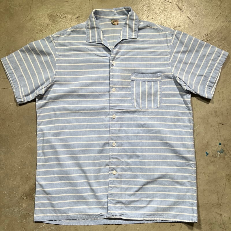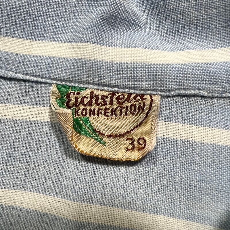 60年代頃のEichsfeld Konfektion コットンボーダーイタリアンカラーシャツです。1940年代にドイツで創業した衣類工場のインラインブランドです。襟のラウンド具合が通常のイタリアンカラーとは少し違うようですが、こちらではイタリアンカラーと記載させていただいております。爽やかな印象のボーダー柄で夏にふさわしい1着です。フロントは全て削り出しのシェルボタンが使用されています。胸のパッチポケットは閂代わりに内側の物が飛び出しにくくなるように丁寧に縫製されています。特筆する汚れやダメージは無くグッドコンディションです。サイズ表記は39で、M相当だと思います。現代のファッションに取り入れても使い易く、タウンユースからオフィスカジュアルまで幅広くお使いいただけるのでは無いでしょうか。さりげないヴィンテージウェアがお好きな方是非いかがでしょうか。