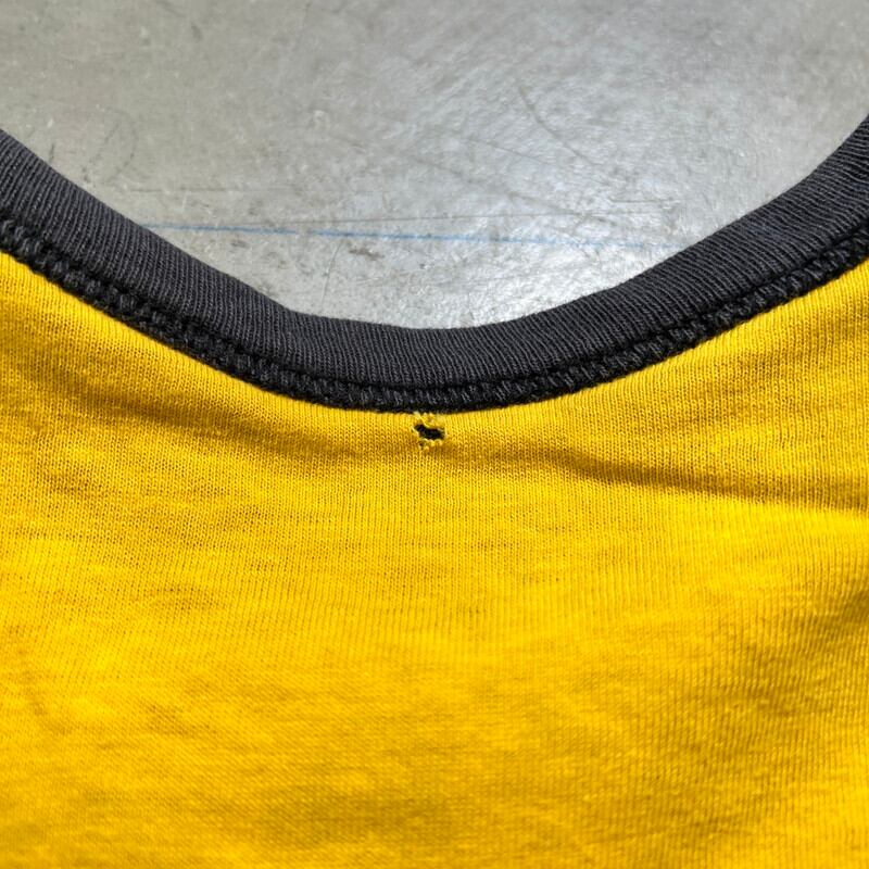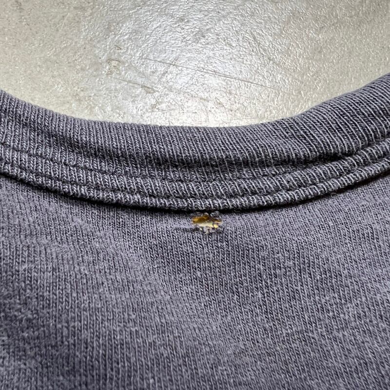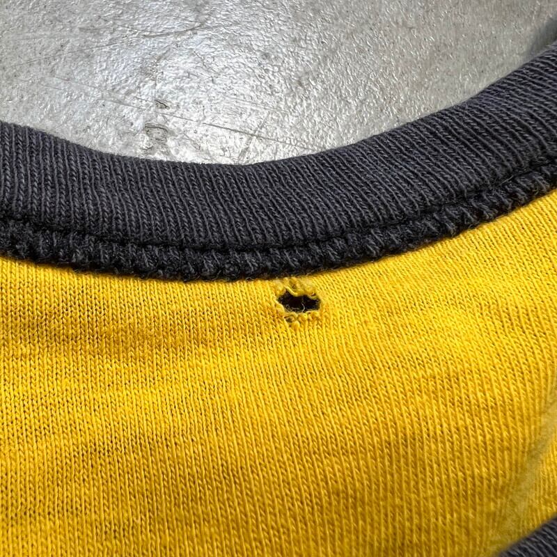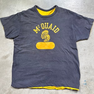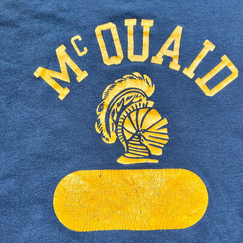 80年代のChampion リバーシブルTeeです。リバーシブルTシャツは表と裏で色が違うので2チームに分けたスポーツ等で使用する目的で1939年に米軍士官学校(USMA)の依頼により作られたのが始まりとされています。ご紹介するこちらは、1954年にニューヨーク州ロチェスターで設立されたMcQuaid Jesuit High Schoolという学校のアスレチック用のアイテムです。表にはMcQUAIDのトレードマークとカプセルの3段プリントが入り、裏面は無地となっています。全体的にフェードしたネイビーカラーの雰囲気も良く、サイズ感の良い1着です。首元に小穴が開いております。擦れや毛羽立ち等の使用感はございますが、その他目立つダメージはございません。XL表記で、縮みも少なくしっかりとサイズが残った個体です。両面使い分けたり、リンガーTeeの様に袖だけまくってみたりと使い勝手の良いアイテムですので、お探しだった方は是非この機会にいかがでしょうか。アメカジの定番カラーでオススメです。