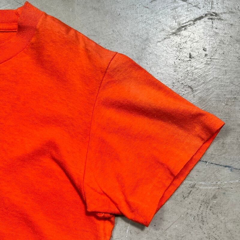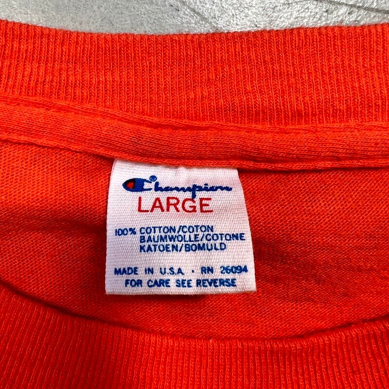 80年台のChampionカレッジTeeです。ニュージャージー州にあるDOVER HIGH SCHOOLのプリントが4段入るカレッジTシャツです。Physical Educationとプリントされているので、体操着として支給されていた物だと思われます。鮮やかなオレンジにブラックの組み合わせはお好きな方も多いのでは無いでしょうか。両袖上部にヤケによる褪色が見られます。ダメージや汚れは特に無くコンディション的には良好かと思います。LARGE表記ですが、体感ではMサイズ相当です。デニムに映える綺麗な色なのでこの夏にお勧めな1着です。プリント4段というのもポイント高めです。