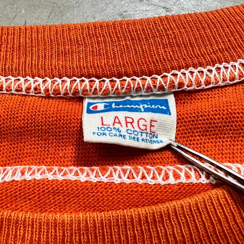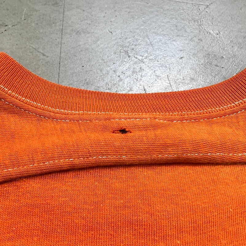 70年台頃のChampion HARLEY DAVIDSONプリントフットボールTeeです。バータグが付くチャンピオンボディにハーレーのプリントが入る希少なアイテムです。胸に切り替えしがり、アームホールにゆとりがあるシルエットです。フロントのプリントにヒビ割れがありますが、ヴィンテージらしい良い雰囲気です。首元のタグ裏に穴が開いています。胸の切り替えから上あたりにヤケによる褪色がございます。腹部には黒っぽいよごれもございます。ヴィンテージのハーレーダビッドソンTee自体人気も高いですが、チャンピオンボディとなると希少性も高いのでは無いでしょうか。小穴や汚れを考慮していますが手頃な価格帯だと思いますので、サイズが合う方でお探しだった方は是非この機会にいかがでしょうか。LARGEサイズですが、MEDIUM寄りのサイズ感です。