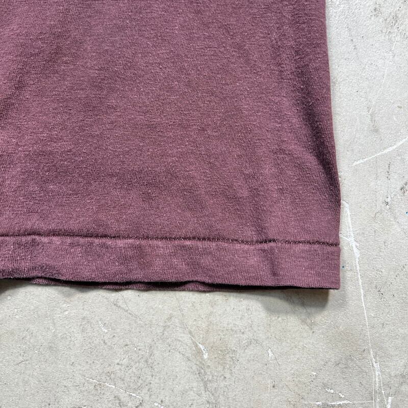 70年代頃のChampion カレッジTeeです。1886年に創立したワイオミング大学のプリントが入ります。経年によりフェードしたブラウンに近いエンジカラーにイエローのプリントが映える1着です。袖、裾共にシングルステッチです。アームホールの形状も後年のトリコタグの物に比べると広く作られています。プリントは細かなクラックはあるものの大きな割れは無く綺麗です。全体的なフェード具合が非常に雰囲気良く、ヴィンテージデニムやミリタリーパンツとの相性も抜群です。フィールドパンツに生成りのキャンバスシューズといったアメカジの鉄板スタイルがお好きな方にお勧めなTシャツです。X-LARGE表記ですが、体感ではM~L相当です。着やすめなサイズ感だと思いますので、男女共にお選びいただけるのでは無いでしょうか。ピンピンに綺麗な個体とは違いこなれ感の出せる良い個体ですので、是非この機会にいかがでしょうか。個人的にイチオシなアイテムです。