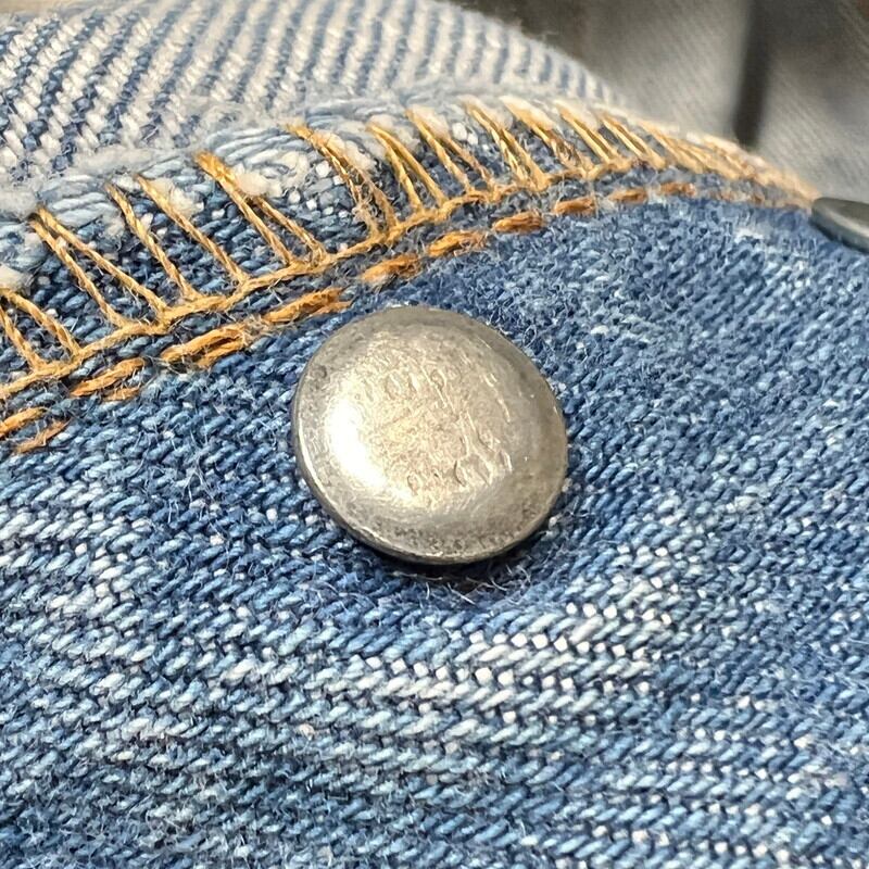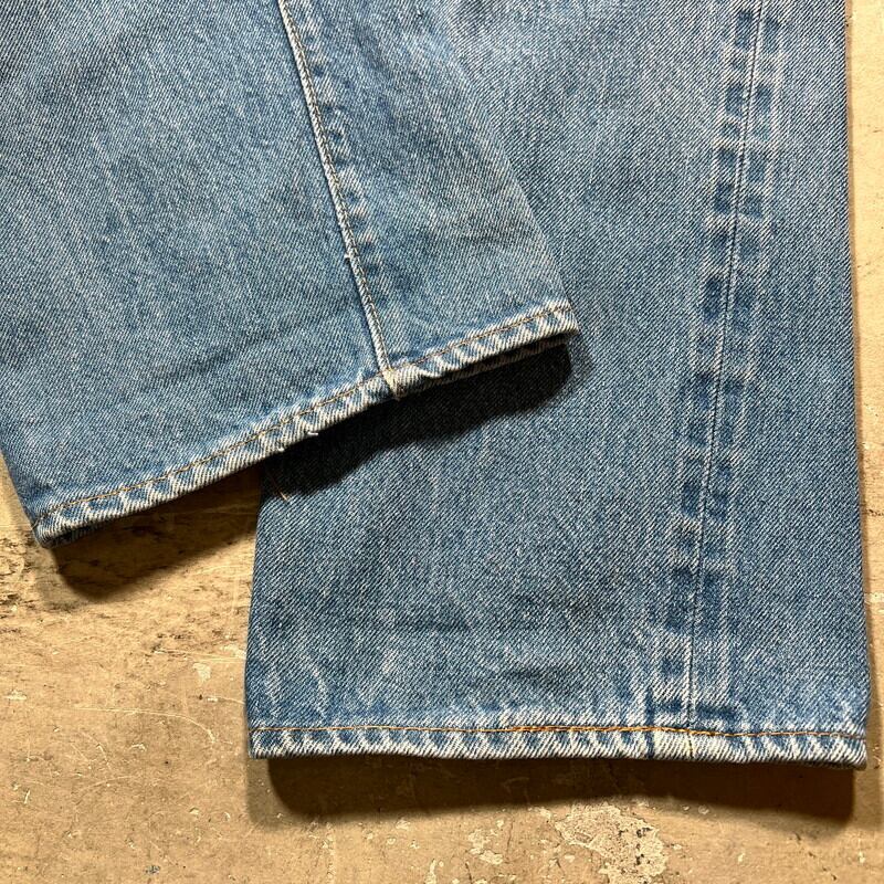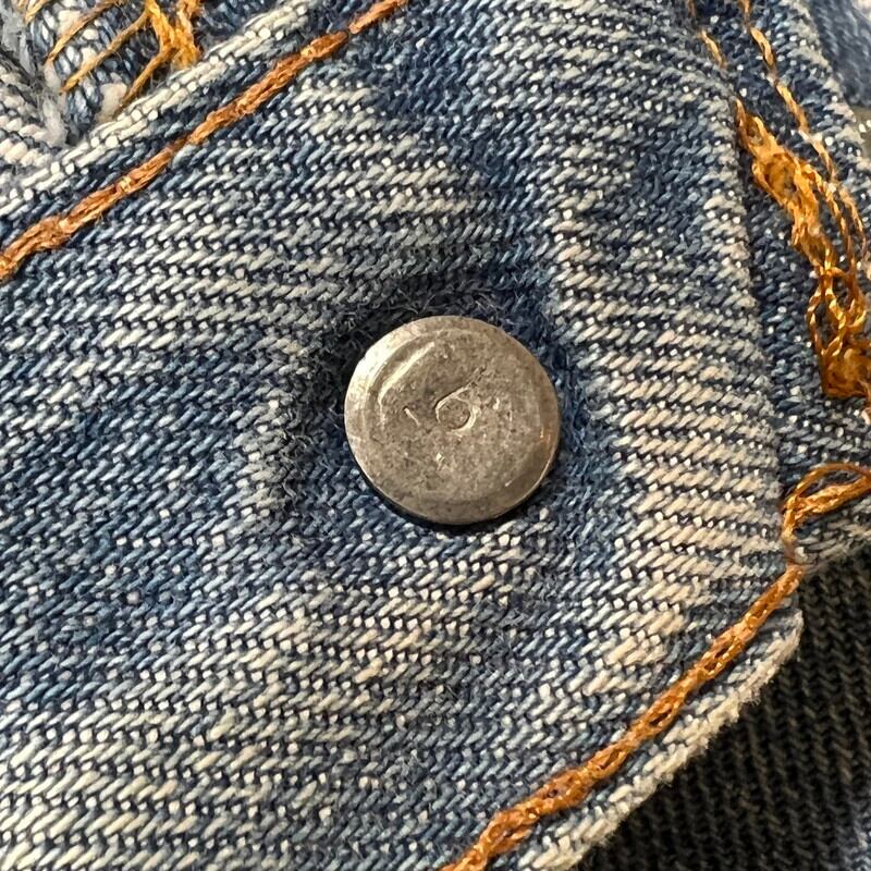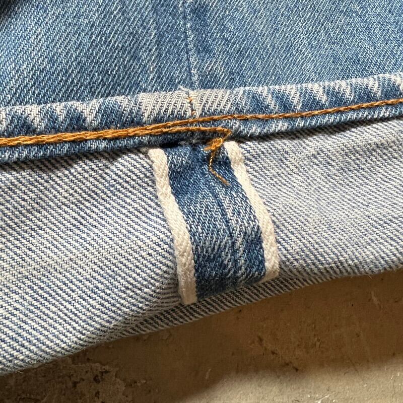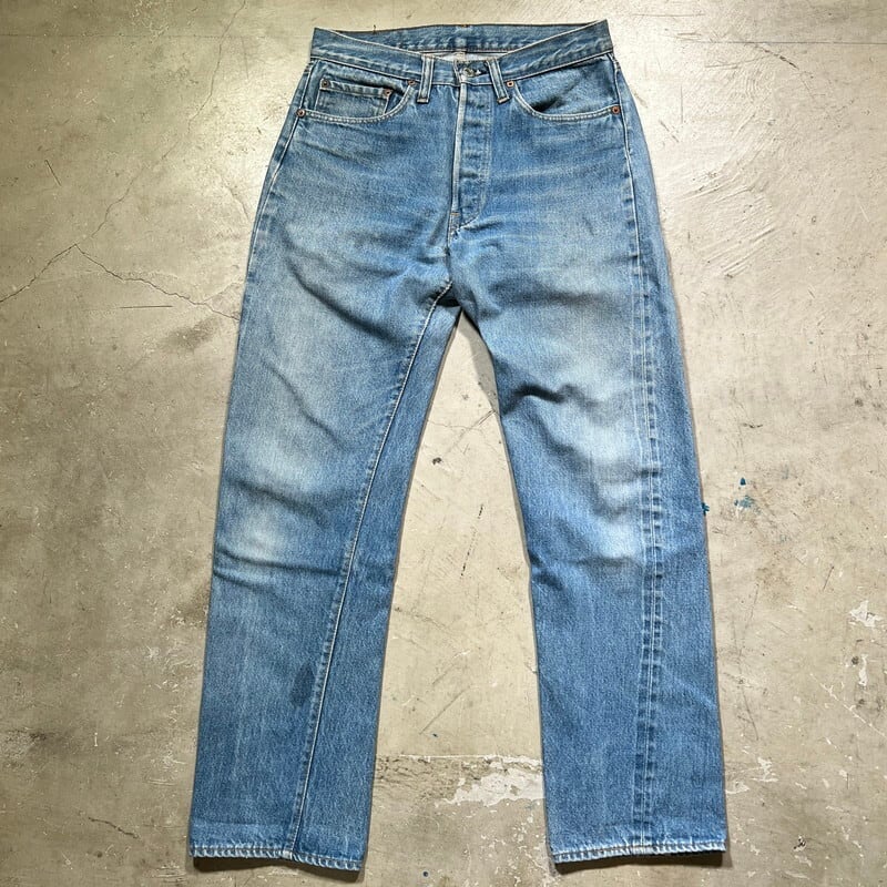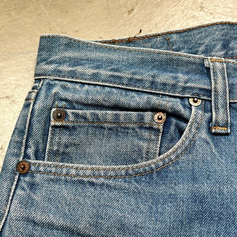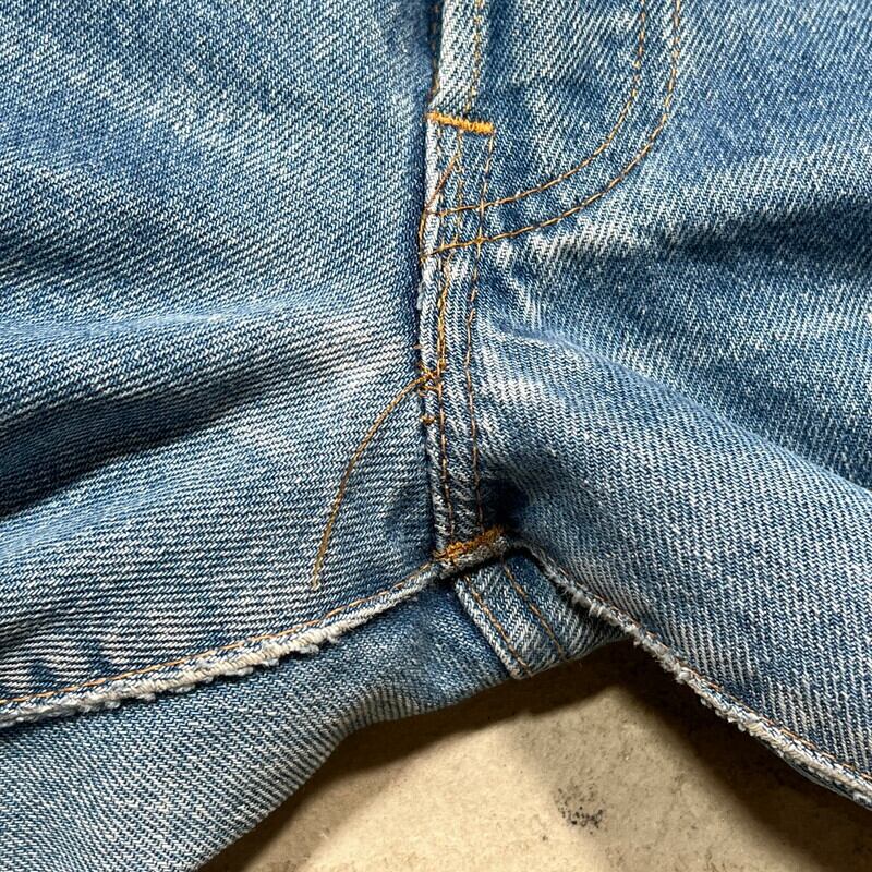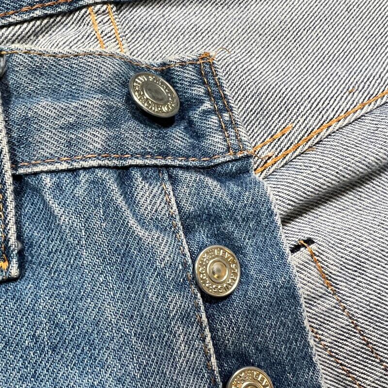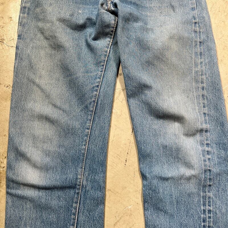 70年代後半から80年代初頭頃のLevi's501 66後期モデルです。トップボタン裏刻印6、ウォッチポケット裏チェーン、セルヴィッジ、アウトシーム裏シングル+チェーン、赤タブ欠損、バックポケット裏チェーン。全体的に色落ちが激しく色残りは2~3割程度です。内側のケアタグがほとんど欠損しているので、縮率等は確認できません。腿付け根にはヒゲが入りサイドにはセルヴィッジのアタリも入った個体です。バックヨークの一部にステッチ飛びがあり、生地が若干めくれています。内股にも若干擦れがございます。色味は薄めですが、コンディションは比較的良好だと思います。サイズ表記はございませんが、実寸で約W30インチです。レングスはしっかりとありますので、背の高い方でもご着用していただけると思います。66モデルも濃い物ですと価格も非常に高騰していますので、薄めなデニムをお探しだった方でサイズが合う方あは是非この機会に是非いかがでしょうか。