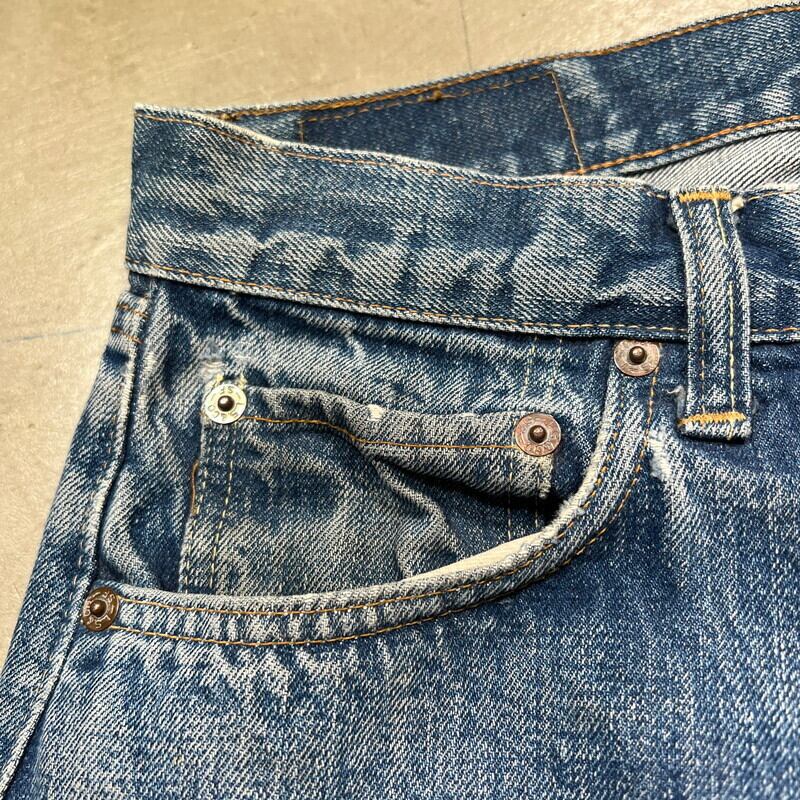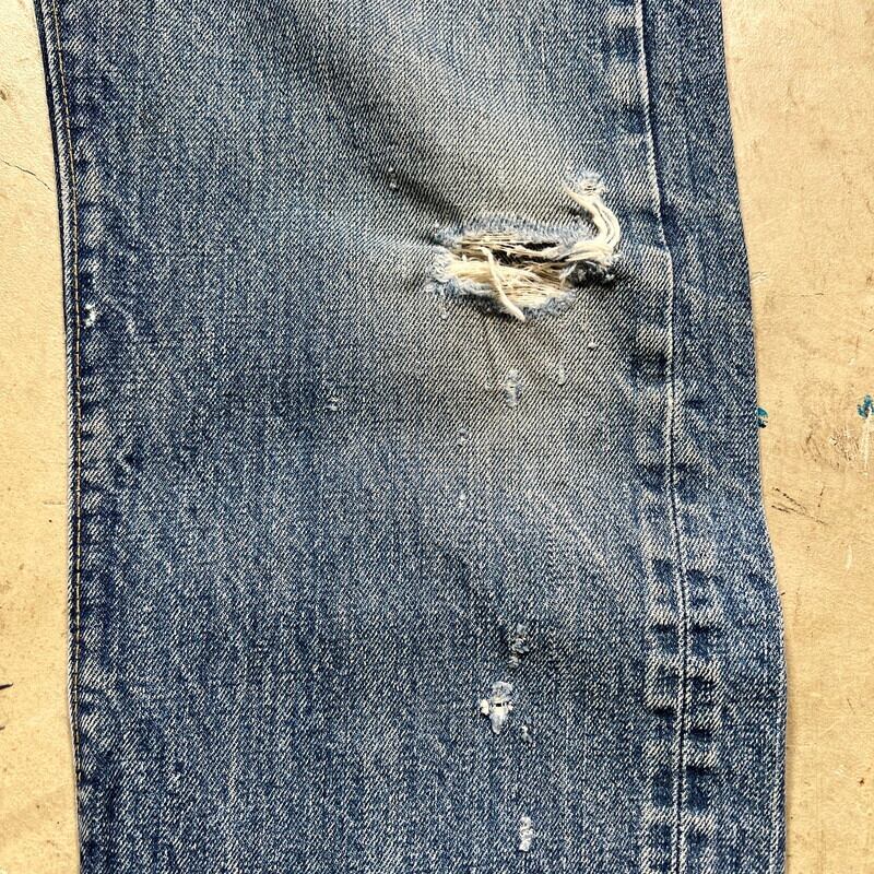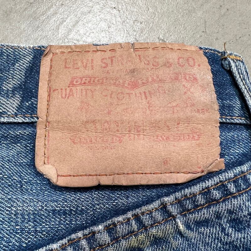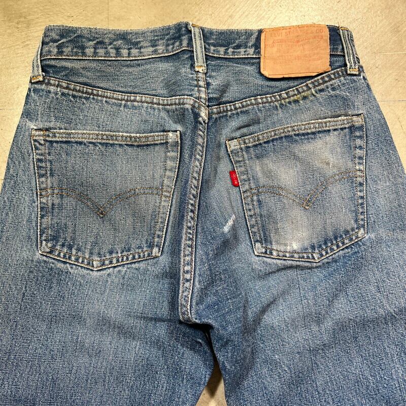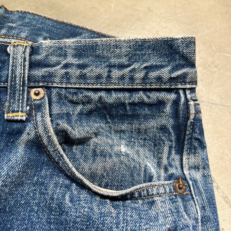 70年代頃のLevi's501デニム66前期モデルです。フロントトップボタン裏刻印66、ウォッチポケット裏チェーン、バックポケット裏シングル、スモールe。欠損しがちな紙パッチも残っています。全体的に粗めな色落ちが見られます。腿と両膝にダメージがございます。バックポケットの横にも擦れたダメージが見られます。裾のパッカリングの雰囲気も良く、使い易い1本だと思います。ダメージこそございまうsが、生地はしっかりとしていますので、ダメージを楽しみながら合わせていただいてもカッコ良いですし、しっかりとリペアに出して大切にご着用されても良いと思います。ダメージ考慮の価格帯ですので、お探しだった方は是非いかがでしょうか。ウエストはおおよそW30~31インチ位です。