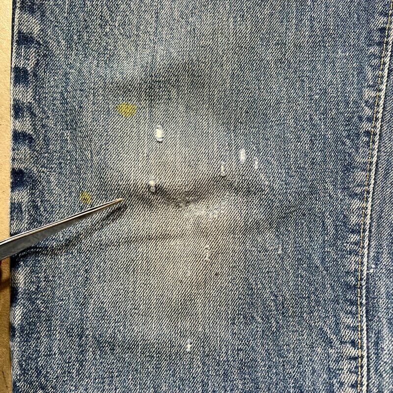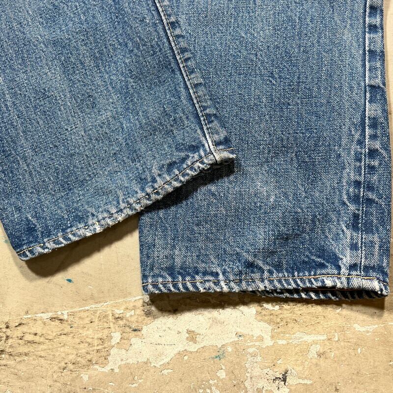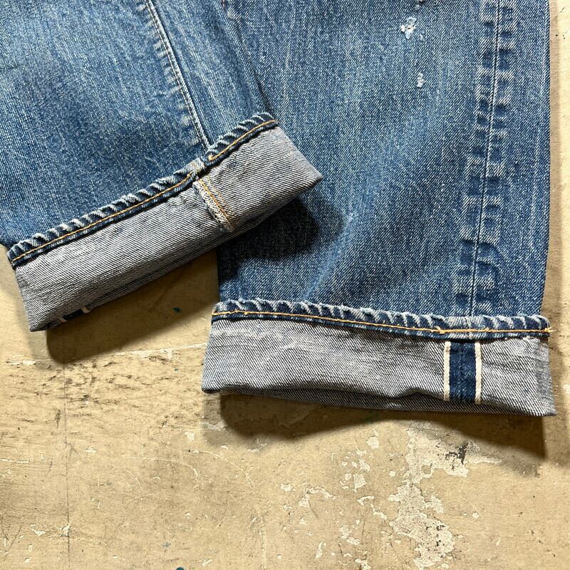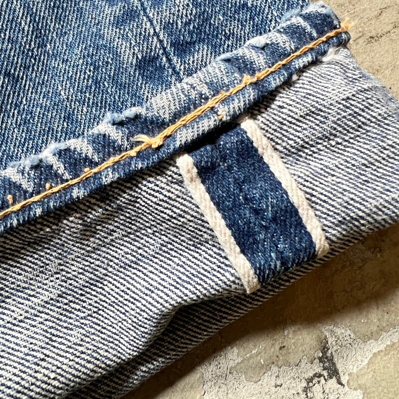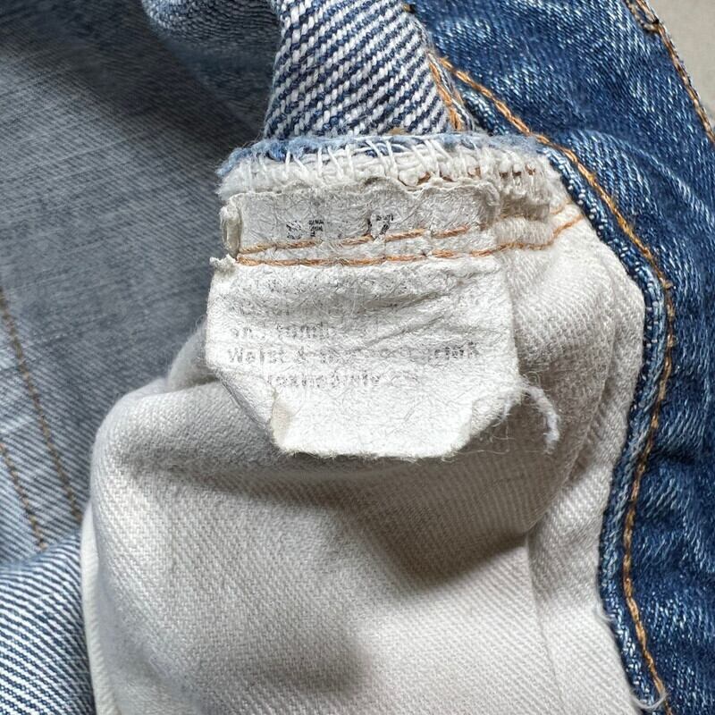 70年代頃のLevi's501デニム66前期モデルです。フロントトップボタン裏刻印66、ウォッチポケット裏チェーン、バックポケット裏シングル、スモールe。欠損しがちな紙パッチも残っています。全体的に粗めな色落ちが見られます。腿と両膝にダメージがございます。バックポケットの横にも擦れたダメージが見られます。裾のパッカリングの雰囲気も良く、使い易い1本だと思います。ダメージこそございまうsが、生地はしっかりとしていますので、ダメージを楽しみながら合わせていただいてもカッコ良いですし、しっかりとリペアに出して大切にご着用されても良いと思います。ダメージ考慮の価格帯ですので、お探しだった方は是非いかがでしょうか。ウエストはおおよそW30~31インチ位です。