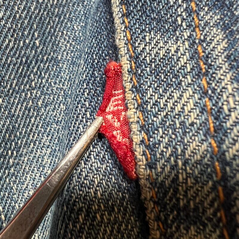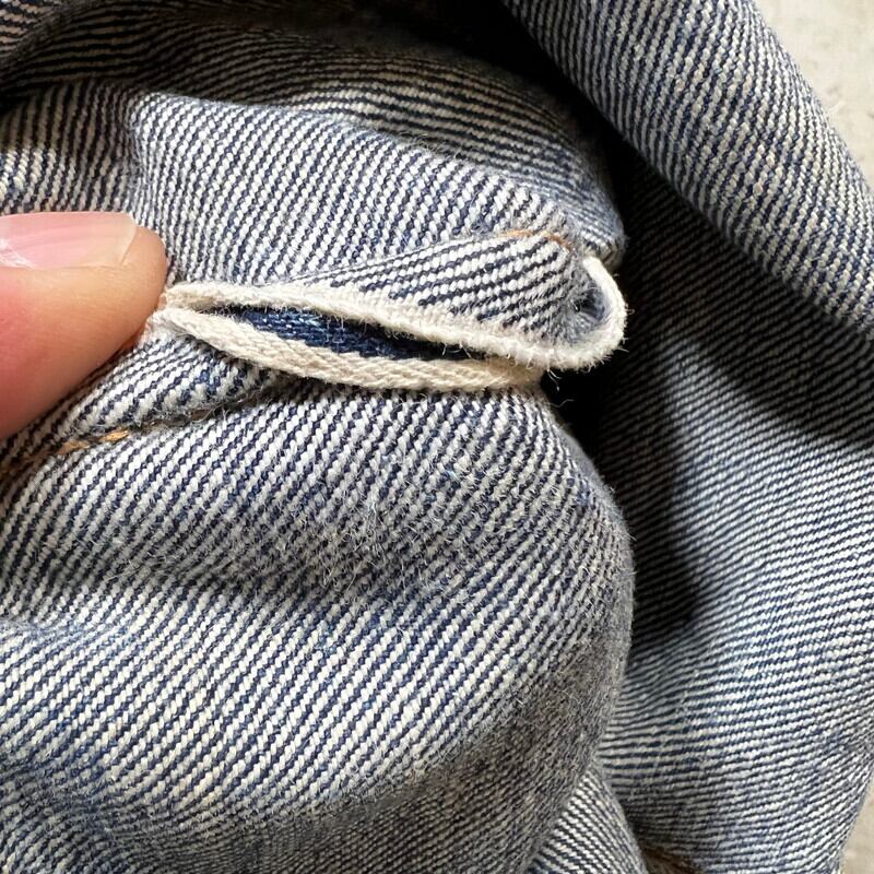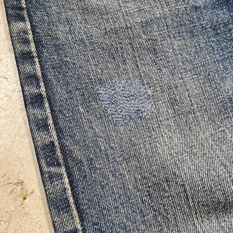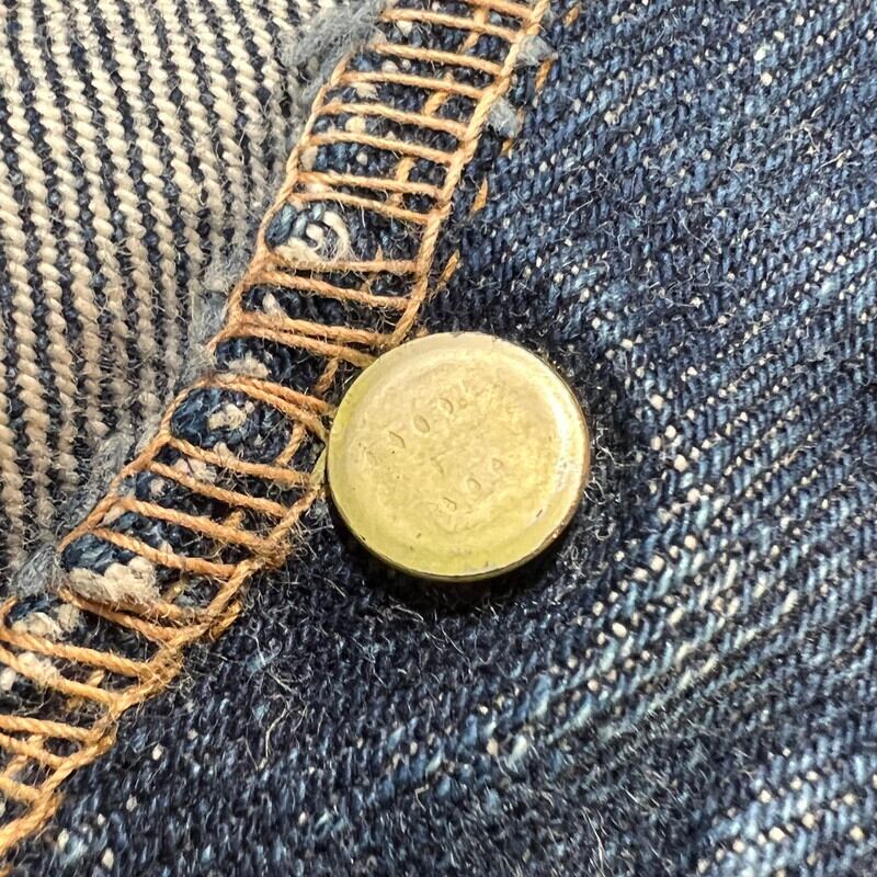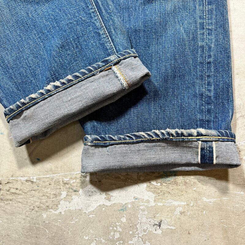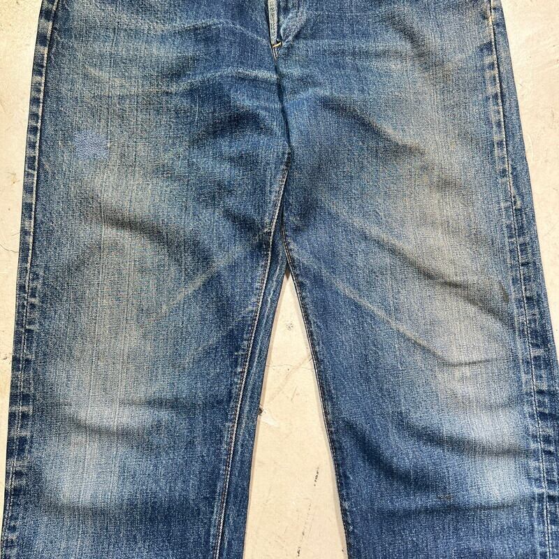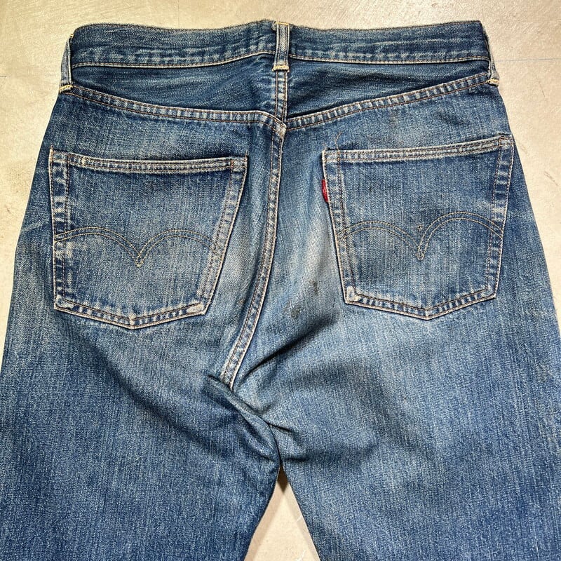 70年代頃のLEVI'S 501 デニムパンツです。トップボタン裏刻印8、足長R、ウォッチポケット裏チェーン、アウトシーム裏両面シングル、赤タブBig E、不均等V。色の濃淡が素晴らしいバランスで、ヒゲの入り方も綺麗な1本です。右腿に1カ所タタキリペアがございます。裾にも擦れによるダメージや、ステッチ飛びが見られます。右バックポケットにピンホールが1カ所有り、ポケット横にはオイル染みもございます。これぞBig Eという見事な色落ちでこれからのエイジングもまだまだ期待できるのではないでしょうか。ウエストは約W31インチで、男女共に穿きやすいサイズ感だと思います。リペアはございますが、全体的なコンディションはかなり良いと思いますので、サイズが合う方は是非この機会に是非いかがでしょうか。