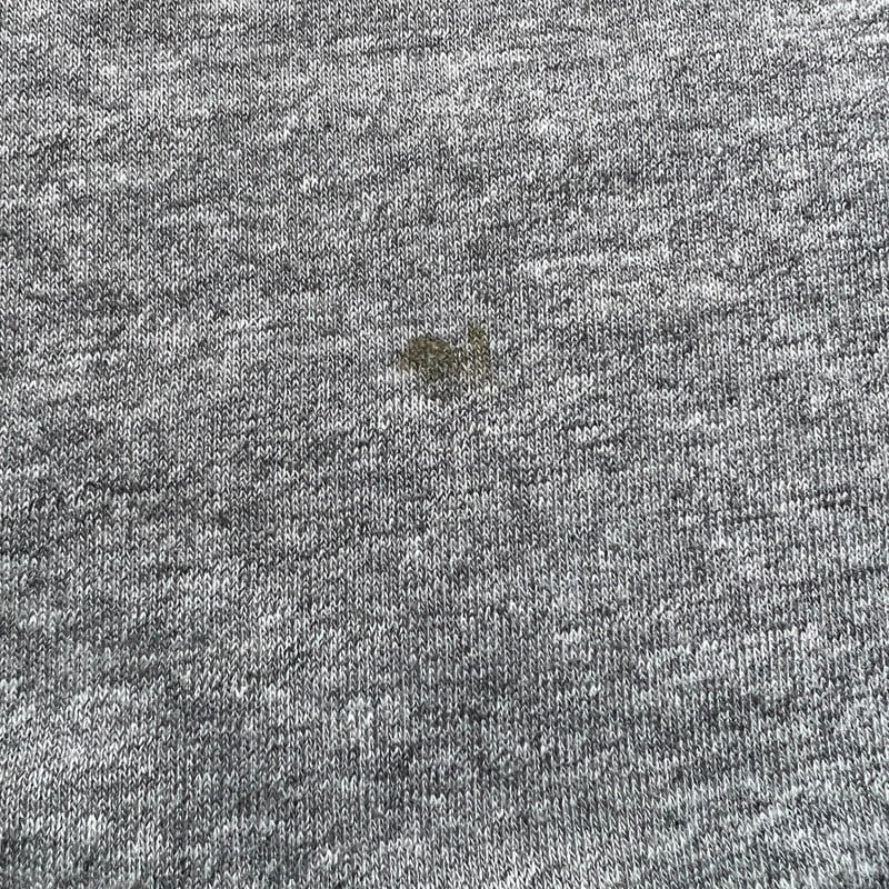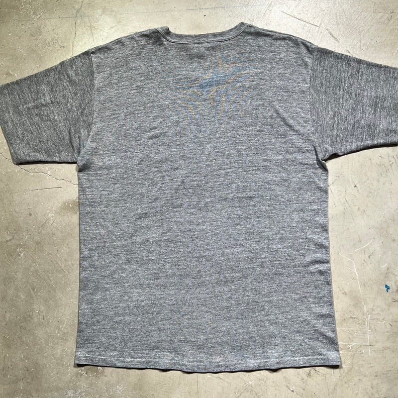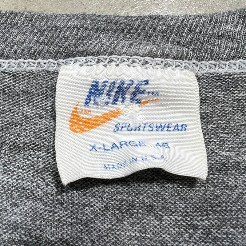 70年代80年代頃のNIKEロゴTシャツです。®マークからTM表記へと変わった時期のオレンジタグが付きます。首元はバインダーネックで、袖と裾はシングルステッチです。グレーボディにブル^-のプリントが入ります。一見染み込みプリントの様ですが、経年により元のプリントが薄くなっている為実際は染み込みプリントではありません。ポリ50%、コットン38%、レーヨン12%の柔らかい生地感です。フロントに小さなシミや色抜け箇所はござますが、その他目立つ汚れやダメージは無く状態は良好です。若干生地が薄くなっている気がします。XLサイズ表記ですが、M~L位の着用感だと思います。この年代では小さくタイト目なアイテムが多いので、お探しだった方も多いのでは無いでしょうか。シンプルなロゴTですが、雰囲気の良いアイテムですので、是非この機会にいかがでしょうか。