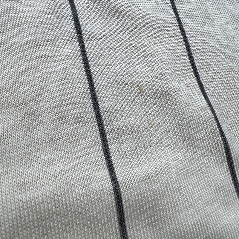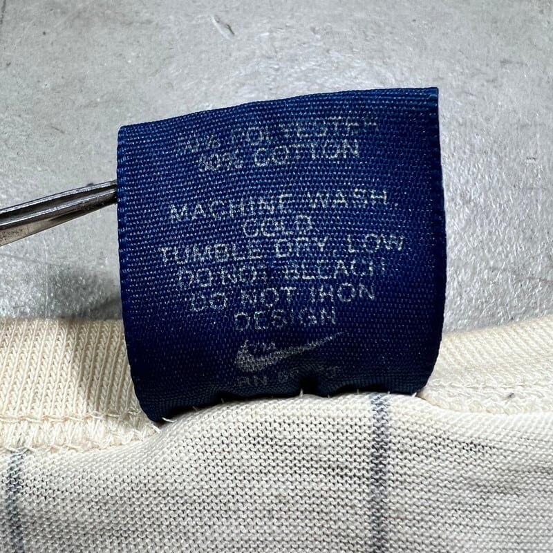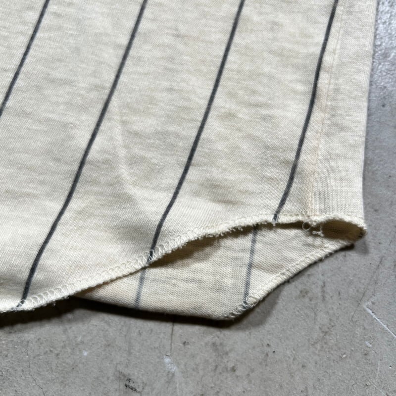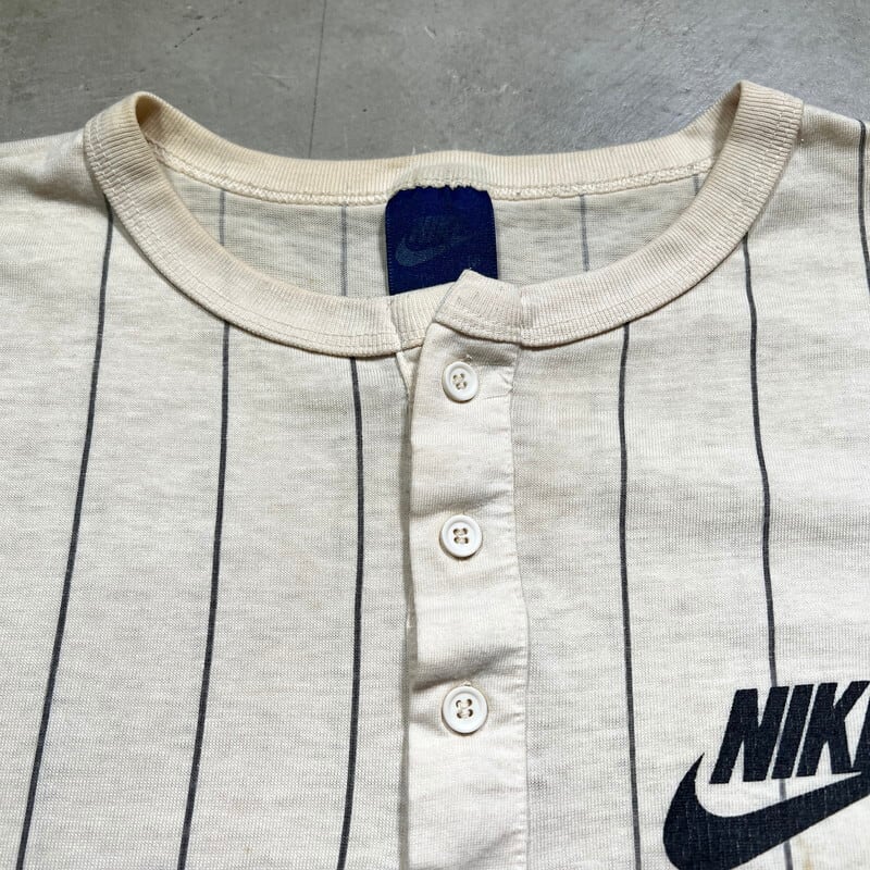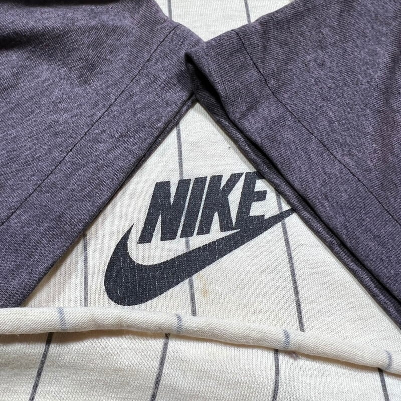 80年代頃のNIKEベースボールTシャツです。オレンジタグの後の紺タグが付くモデルです。くびもとはヘンリーネックで、袖はセットインスリーブの7分袖です(通常の7分袖よりは短いと思います)。ボディーのストライプは染み込み、胸元のロゴはラバープリント です。袖先はシングルステッチ、裾は篝縫いでくるっとなっています。袖はパープル、ストライプとロゴはブラックです。ネック部分に小さなピンホールが有り細かなシミ等はございますが、その他目立つ汚れやダメージは無く状態は良好です。NIKEのベースボールTシャツだとゴツナイキプリントの物が有名ですが、こちらのスウッシュが入るロゴの物は比較的見ないので珍しいのかなと思います。サイズはLなので、需要も高いのでは無いでしょうか。70∼80年代のNIKEのアイテムはコレクターも多く、サイズやデザインが良い物は枯渇していると思いますので、お好きな方は是非この機会にいかがでしょうか。色とサイズ違いも出品していますので、そちらも是非チェックしてみてください。
