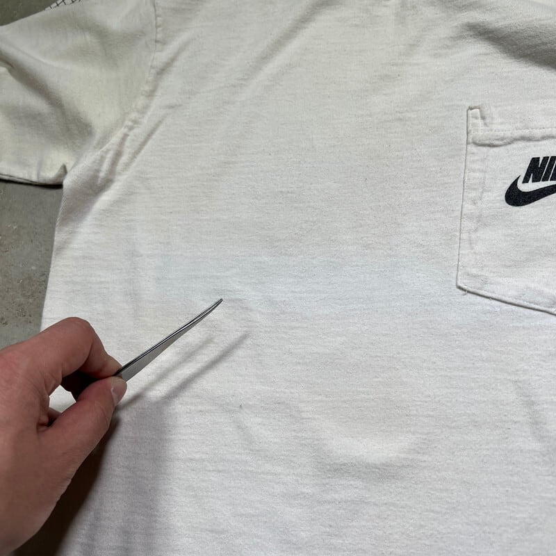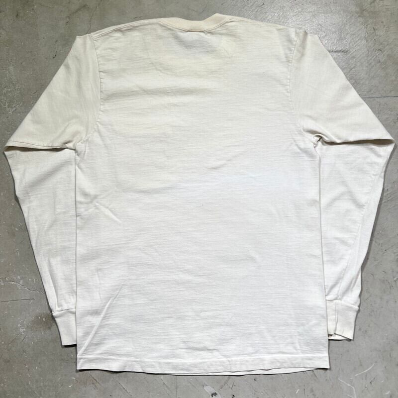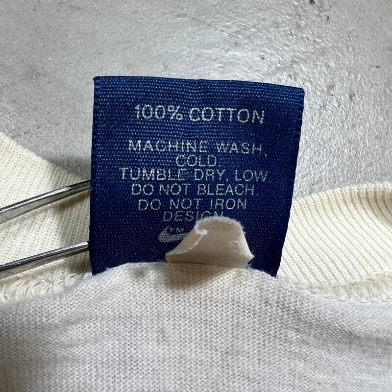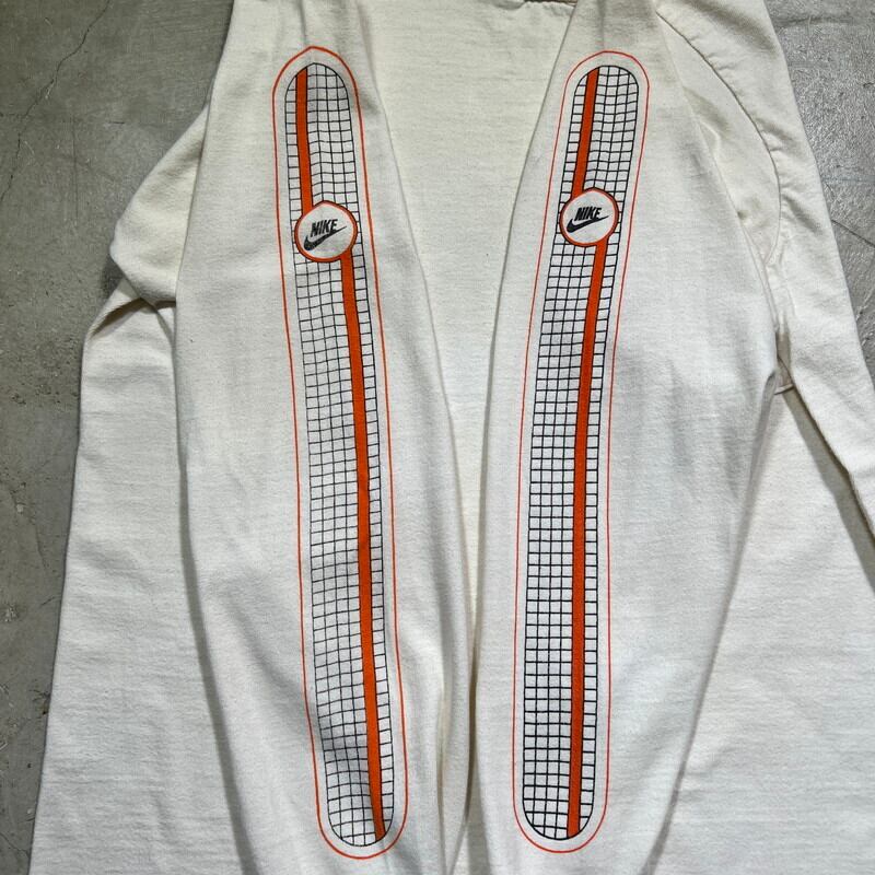 80年代頃のNIKE胸ポケット付きロンTeeです。TM表記の紺タグが付きます。胸ポケットにロゴが入り、両袖には格子状のデザインがプリントされています。裾はシングルステッチです。こちらのデザインもあまり見る機会は無いモデルだと思います。70~80年代のNIKEのスニーカーで格子状のデザインのモデルがあったと思うのですが、発売された時期はもしかすると同じ頃なのかもしれません。ホワイトボディにオレンジのラインが映えてバランスの良いカラーリングです。全体的にうっすらと変色しており、前後中央付近には畳みヤケのようにやや色味が違う箇所も見受けられます。変色具合はあくまでうっすらとなのであまり気にならないかと思います。サイズはS表記ですが着丈は少しありますので、普段Mサイズをご着用されている方でも身幅が合えば大丈夫だと思います。袖プリントがメインだと思うので、半袖スウェットとのレイヤードなども相性が良いと思います。個人的にオススメなデザインです。
