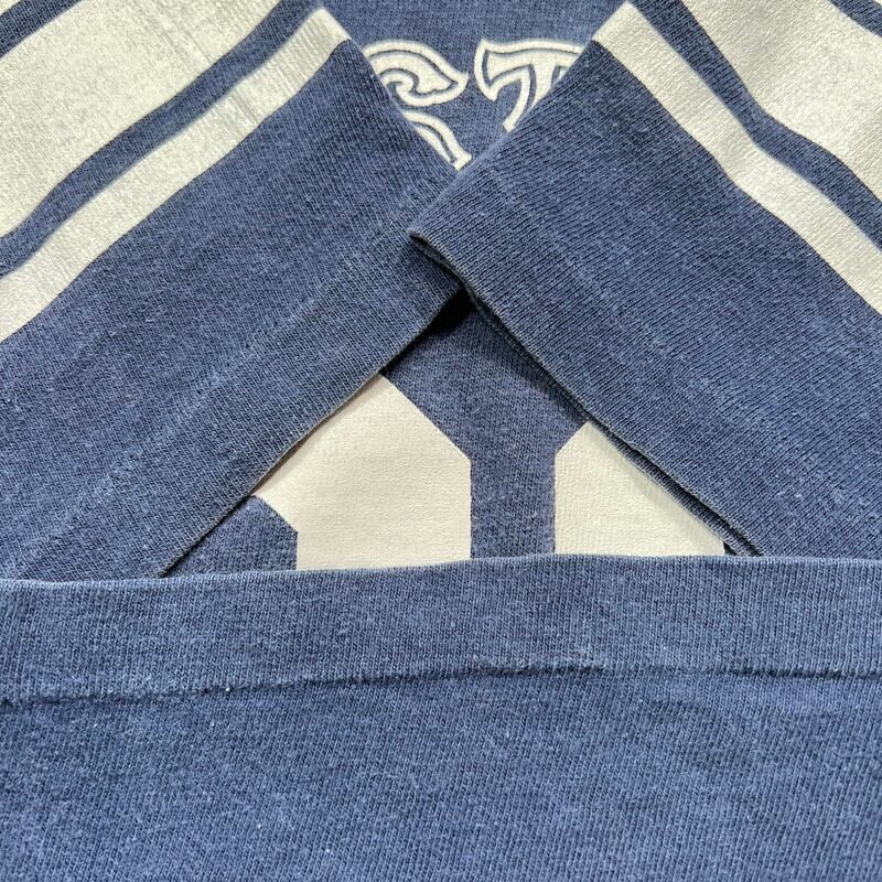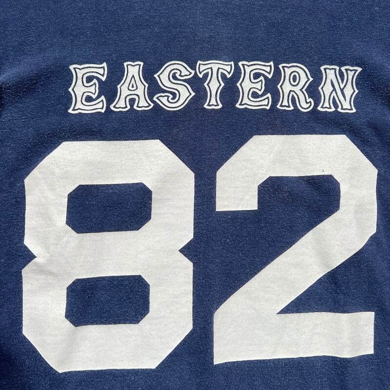 70年代頃のChampionフットボールTシャツです。胸の切り替えしが無い所謂”WIN Teeと呼ばれるアイテムでバータグが付くモデルです。フロントにはEASTERN 82とプリントされており、恐らくイースタン大学だと思われますが詳細は不明です。全体的に色褪せが見られますが、プリント割れも無くダメージは特にございません。背面中央に変色がございます。MEDIUMサイズです。通常のフットボールTeeに比べると胸元の切り替えが無い分すっきりとしています。リバースウィーブの価格の高騰もあり、WIN Teeなど70~80'sのChampionのTシャツも徐々に高くなってきていますので、今が買い時だと思います。お探しだった方は是非この機会にいかがでしょうか。