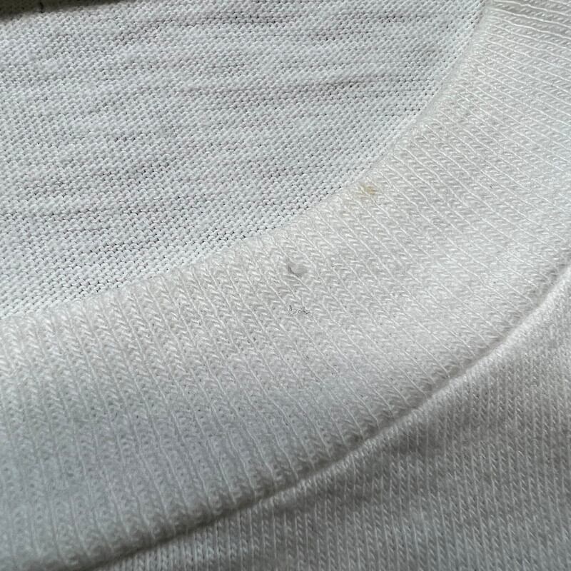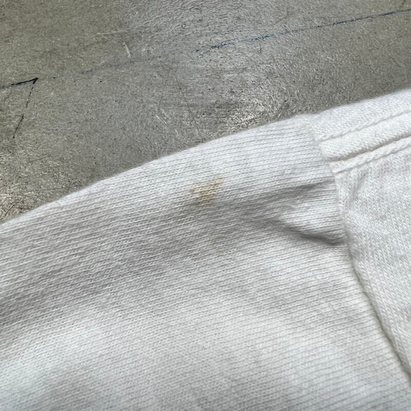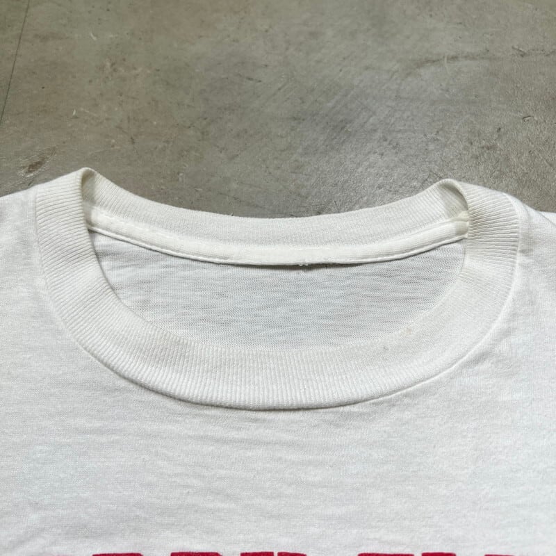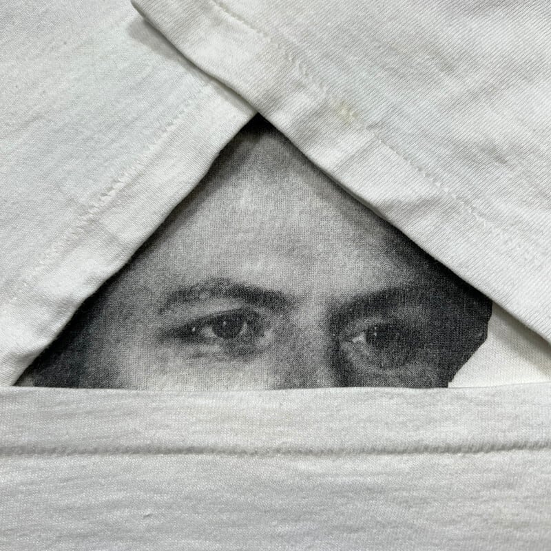 80年代頃のLARRY FLYNT FOR PRESIDENTフォトプリントTeeです。アメリカのポルノ雑誌「HUSLER」を創刊した実業家のラリー・フリントが1984年の米国大統領選挙に出馬した際に選挙キャンペーン用に作られた彼自身の顔がプリントされたアイテムです。最終的には選挙半ばで出馬を断念した事で知られています。裁判を起こされたり、銃撃されたりと数奇な人生を送る事となった人物です。1996年には彼の半生が映画化されています。フロントのプリントは文字部分は染み込み、フォト部分はラバープリントで刷られています。袖と裾はシングルステッチです。首タグが欠損しており、タグが付いていた部分にステッチ飛びがございます。汚れや目立つダメージは無く状態は良好です。着丈が短いのでSサイズ相当だと思います。男性だとかなりタイトで短く感じるかもしれません。小柄で華奢な方や女性向けのサイズ感だと思います。リプリントされている現行物は海外で販売されていますが、当時物はあまり流通していないように思います。少し変わり種ですが、わかる人にはグッとくるアイテムでは無いでしょうか。コレクションやプレゼントにいかがでしょうか。