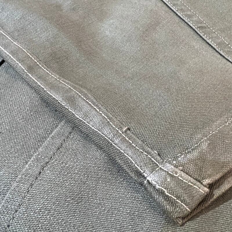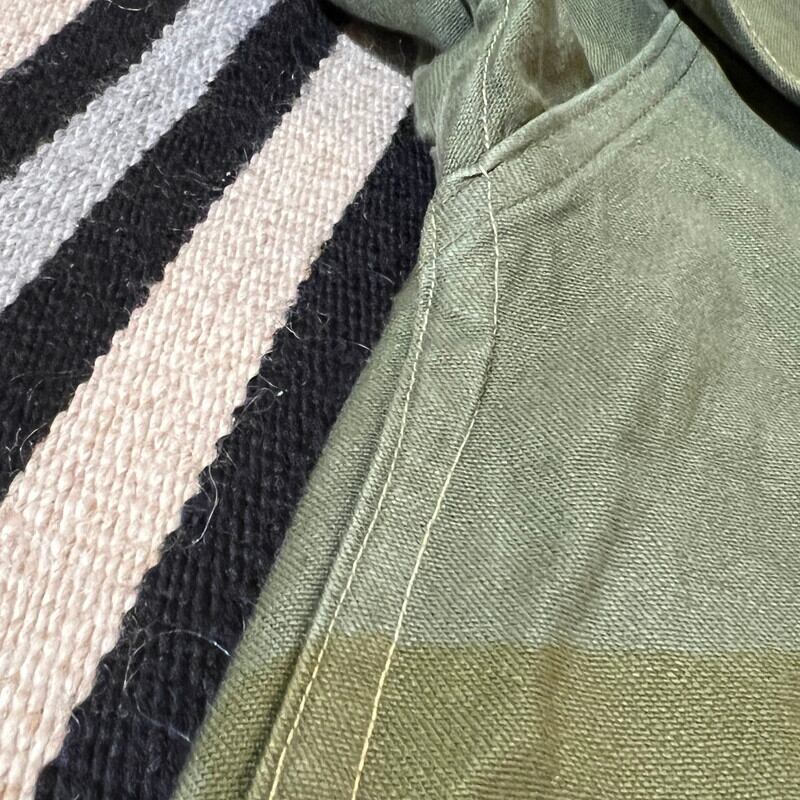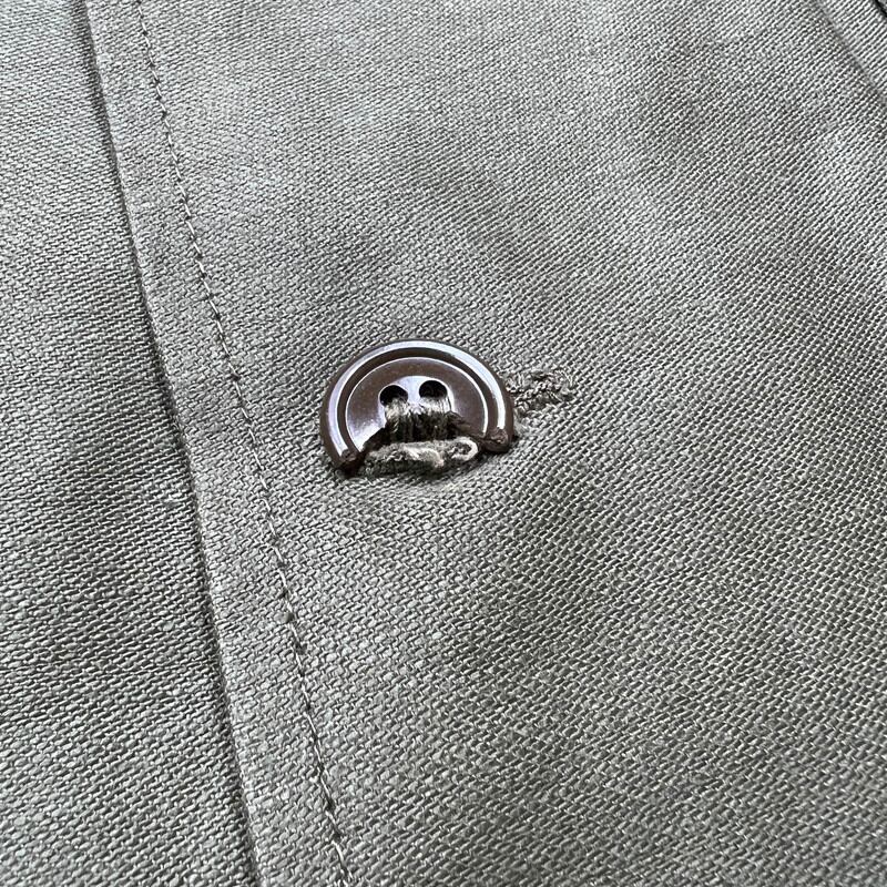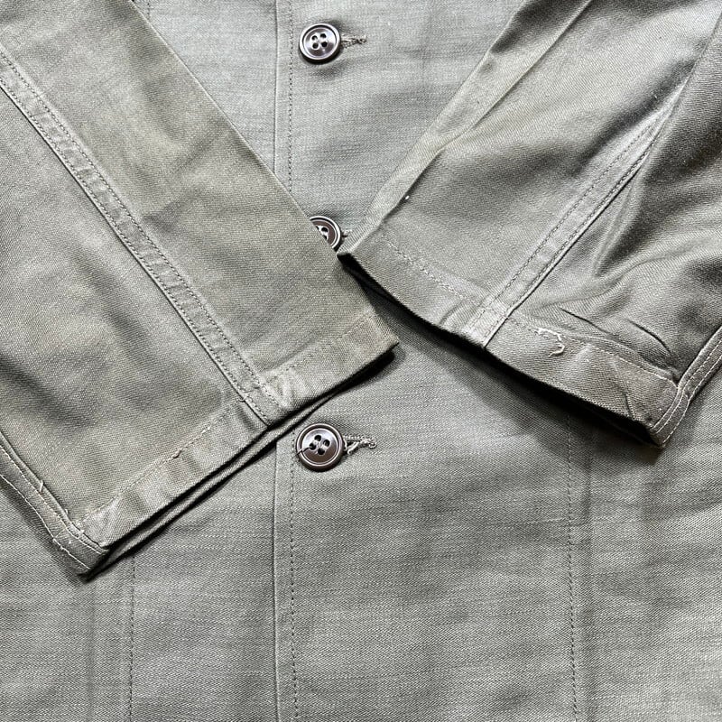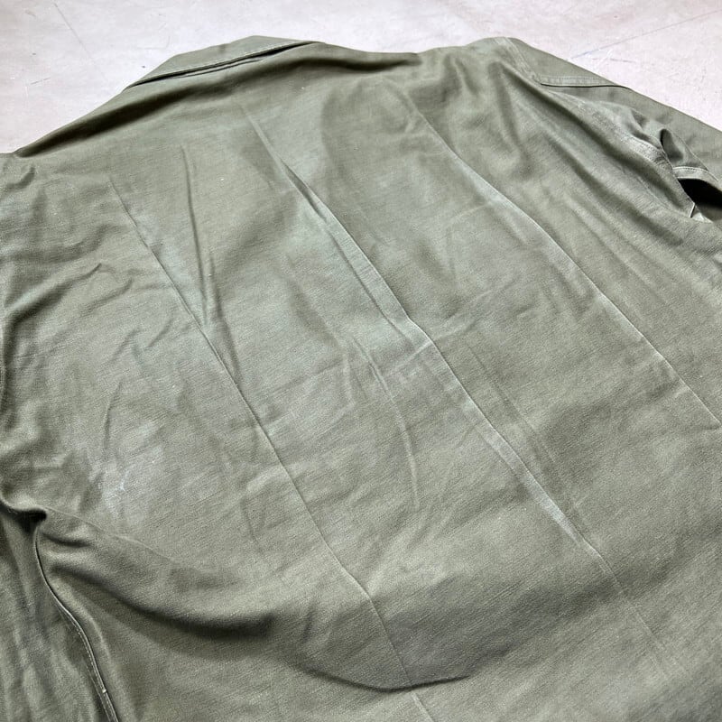 50年代のU.S.ARMY M-47 OG107 コットンサテンユーティリティージャケットです。40年代のヘリンボーンツイル地からこのコットンサテンへと切り替わった初期のモデルです。ミルスペックはMIL-J-3001B。PAT DATEがM-47HBTユーティリティージャケットと同年に行われています。初期の特徴としては、ミルスペックはスタンプ、第一ボタンと第二ボタンの間隔が開いている、筒袖、フラップポケットペン挿し口無し、こげ茶の樹脂ボタンとなります。こちらの個体は、恐らくデッドストックだった物を着用して恐らく未洗いなのかなという紺ディh損です。糊もまだ残っており、アイロン掛けがされたのか生地にやや光沢が出ています。袖幅と身幅が縫い直された形跡がありますので、少しリサイズしているようです。袖先はオリジナルに比べると狭まっていますが、身幅はさほど気にならないレベルです。第三ボタンと、左胸ポケットのボタンに割れがございます。長期保管による畳みジワやヤケ、色抜けがある箇所がございます。胸元のインシグニアも半分欠損しています。年代を考慮すればkなり状態は良い印象です。サイズ表記はLARGEですが若干ゆとりが有ります。後年のユーティリティージャケットに比べると圧倒的に珠数も少ないので、お探しだった方は是非いかがでしょうか。