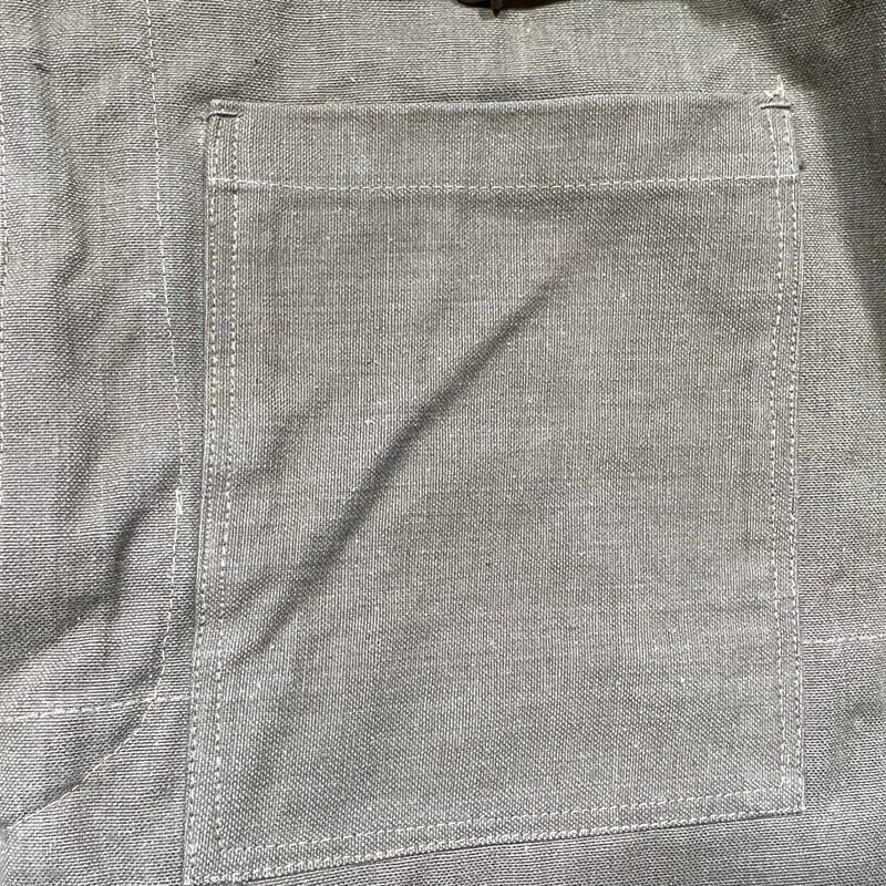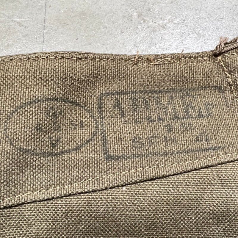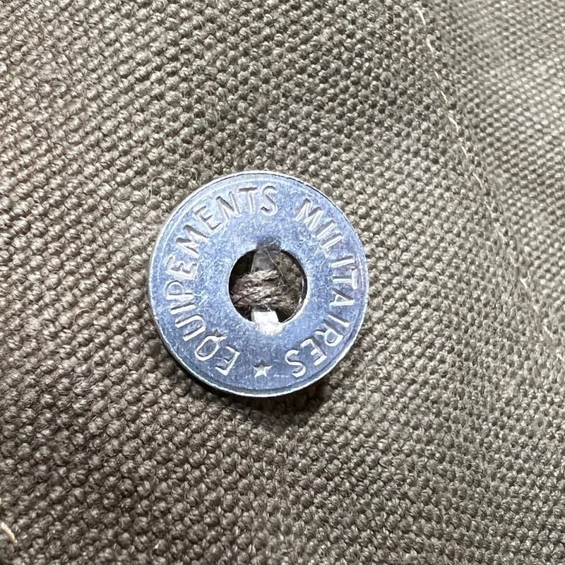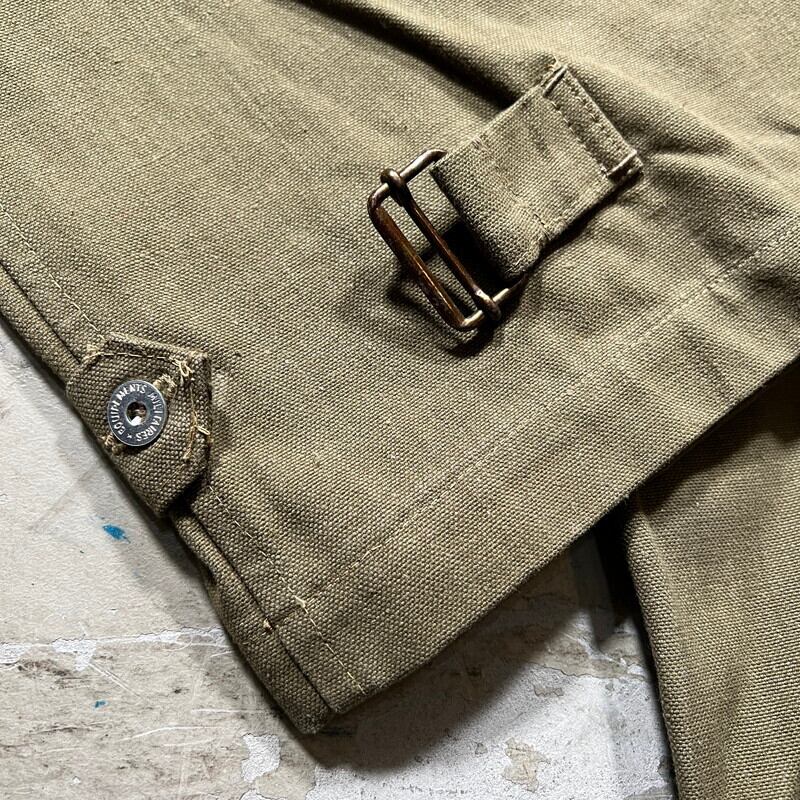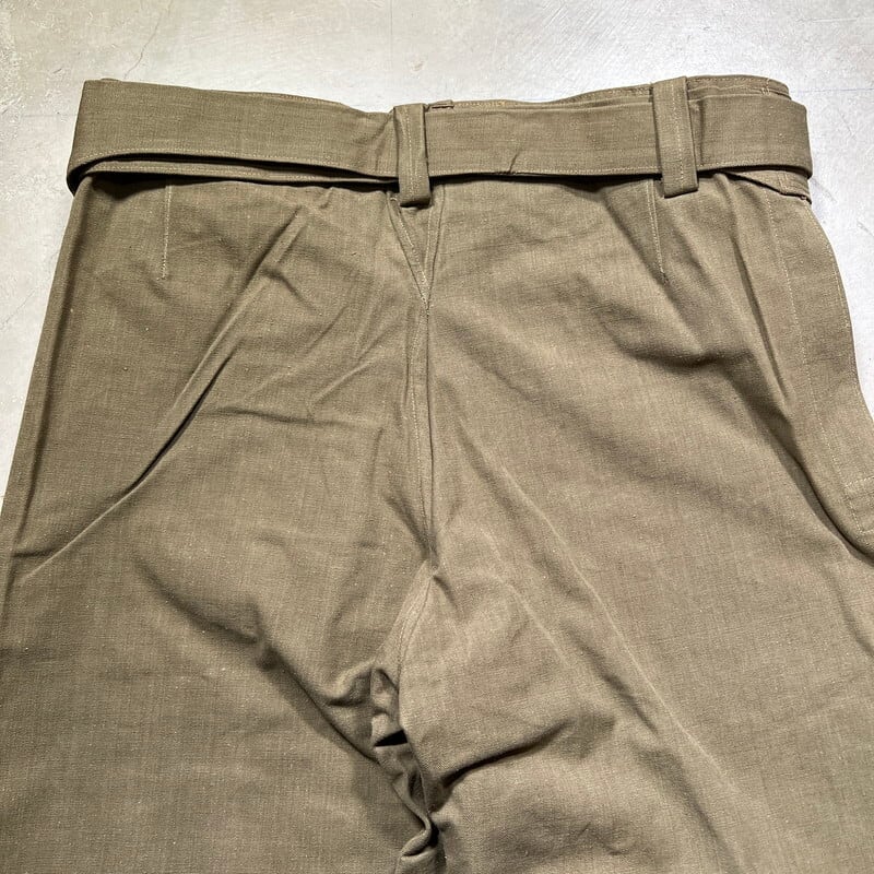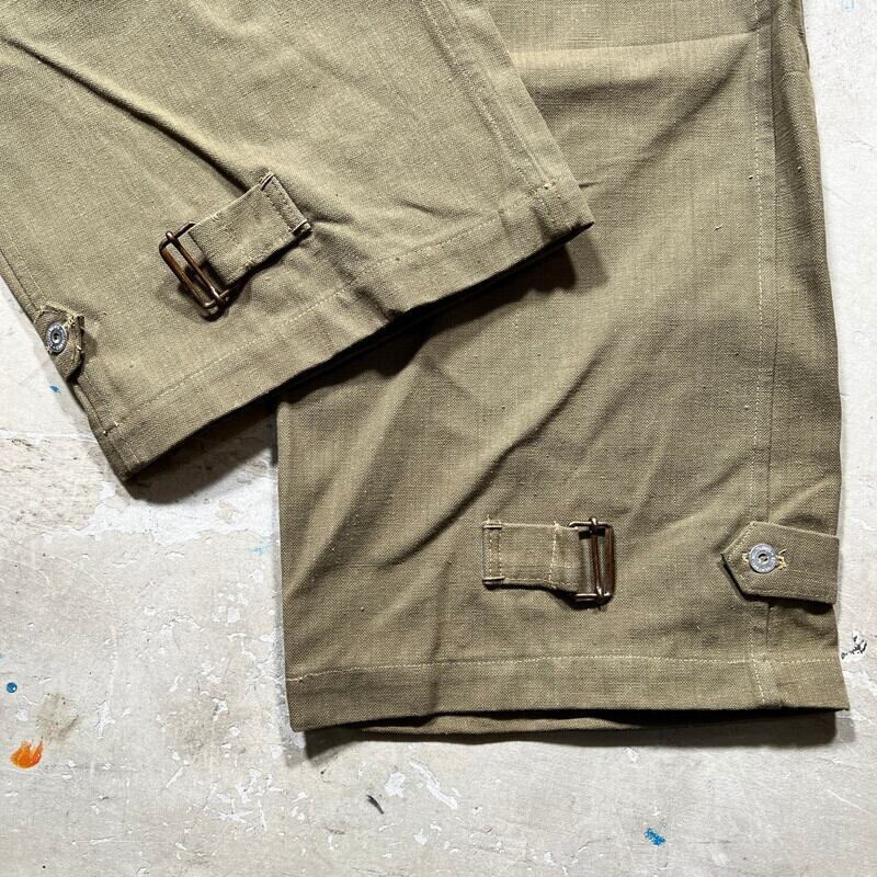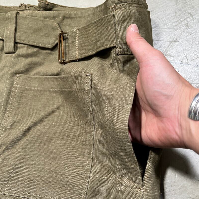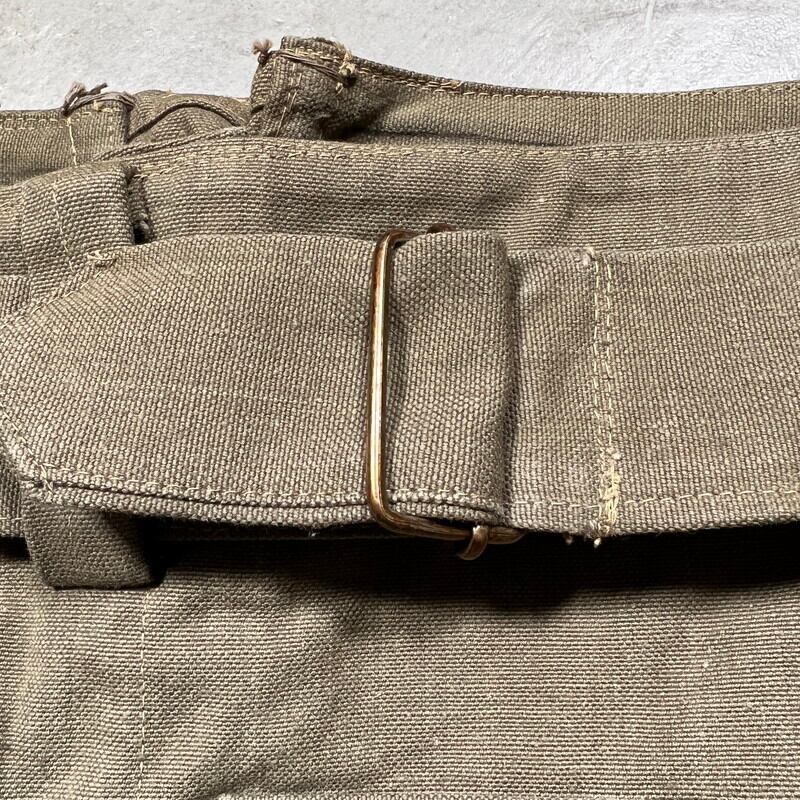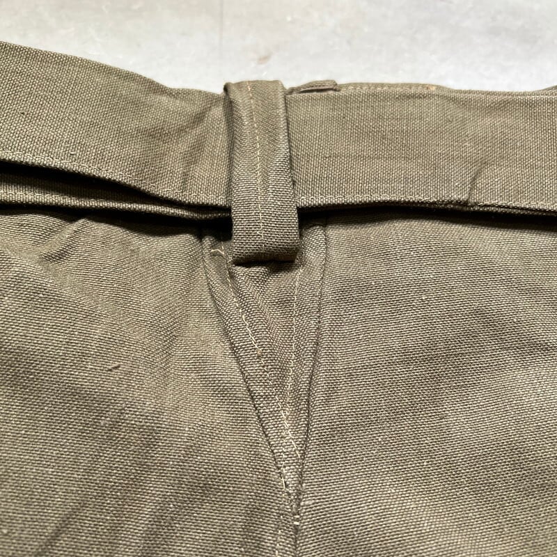 50年代頃のフランス軍M-38モーターサイクルパンツです。しっかりとしたコットンのキャンバス地で、フロントはフックにアルミボタン。無刻印のバックルが付く同素材のベルトで調整できます。裾にも絞れるストラップ付。マリンパンツのような四角いパッチポケット仕様の前期型で、バックにはポケットは付きません。前面内側は生地が2重でダブルニーとなっています。本来はバイクに乗る際に履いているパンツの上から着用するオーバーパンツですので、サイドから内側へ貫通したポケットがございます。ウエスト内側にスタンプが押印されており、恐らく1951年モデルだと思います。恐らくですが、まだ水に通っていないノンウォッシュで、使用感の少ないミントコンディションです。背面に一部色抜けのようなカ所はございますが、元から保管時に付いていたと思われます。近年の人気で注目度が一気に上がったフランス軍のモーターサイクルパンツですのでお探しの方も多いのではないでしょうか。サイズ表記は1でW42位と大き目ですが、ウエストをぎゅっと絞って穿くモデルなので、ゆったりとしたサイズ感がお好きな方は是非いかがでしょうか。
