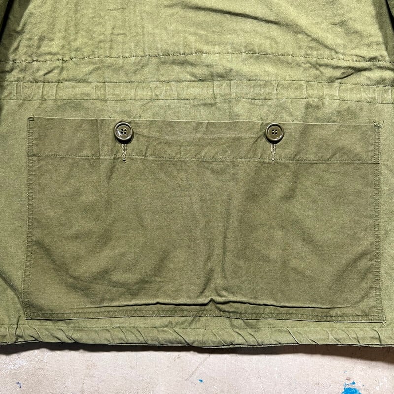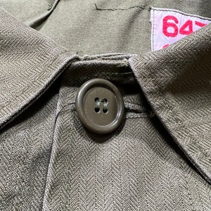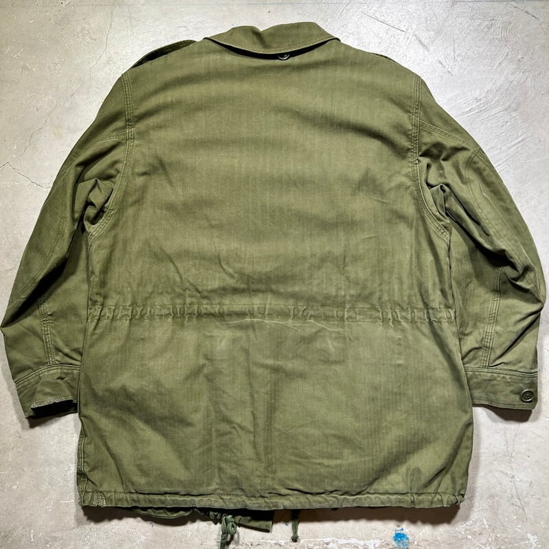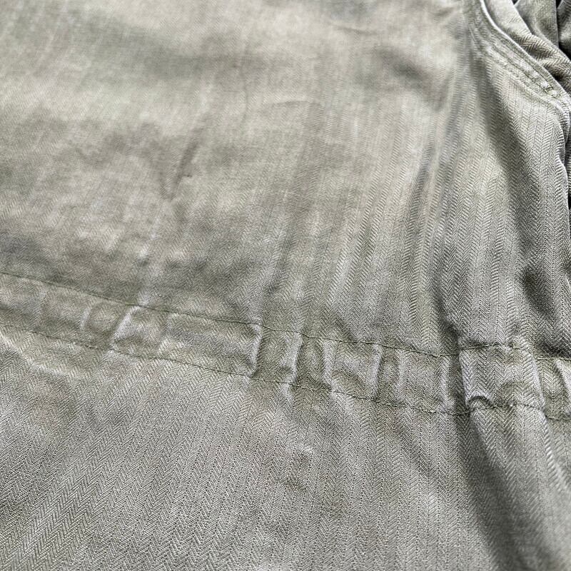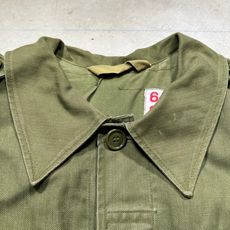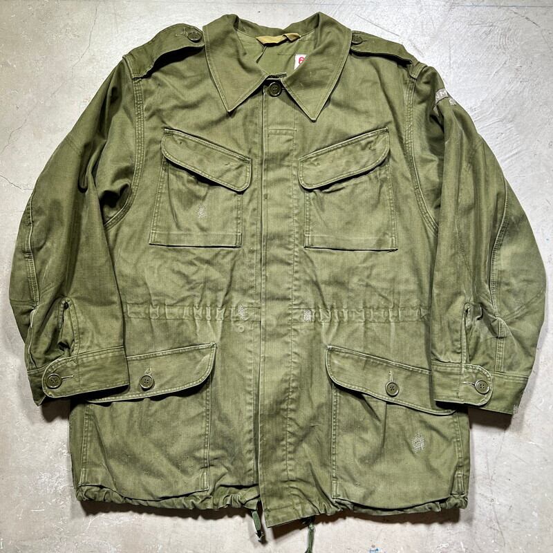 70年代頃のデンマーク軍M-58フィールドジャケットです。米軍のヘリンボーンツイル地に比べ幅の狭いヘリンボーン地が使用されています。斜めについたフラップや袖口のパイピング等非常にデザイン性の高いアイテムです。70年代以降の肩にエポレットが付く仕様です。生地がすべて2重構造となっています。内側腰部分には大きなポケットも配備されています。ウエストのコードでシルエットも変えられます。腰紐より上のボディの裏地には強度を上げる為か丸紐が埋め込まれております(デンマーク軍のフィールドパンツのダブルニーと同じ仕様)。他の軍ではなかなか無い面白いディティールだと思います。米軍やフランス軍のフィールドジャケットに比べると少しマイナー感は否めませんが、引けを取らないデザインやシルエットは秀逸です。ポケットや腰、袖先にリペアや粉かなダメージがあり、右袖にはワッペンを外した形跡もございますが雰囲気も良く、ヘリンボーンの経年変化を充分楽しめる1着です。サイズはL相当だと思います。