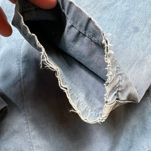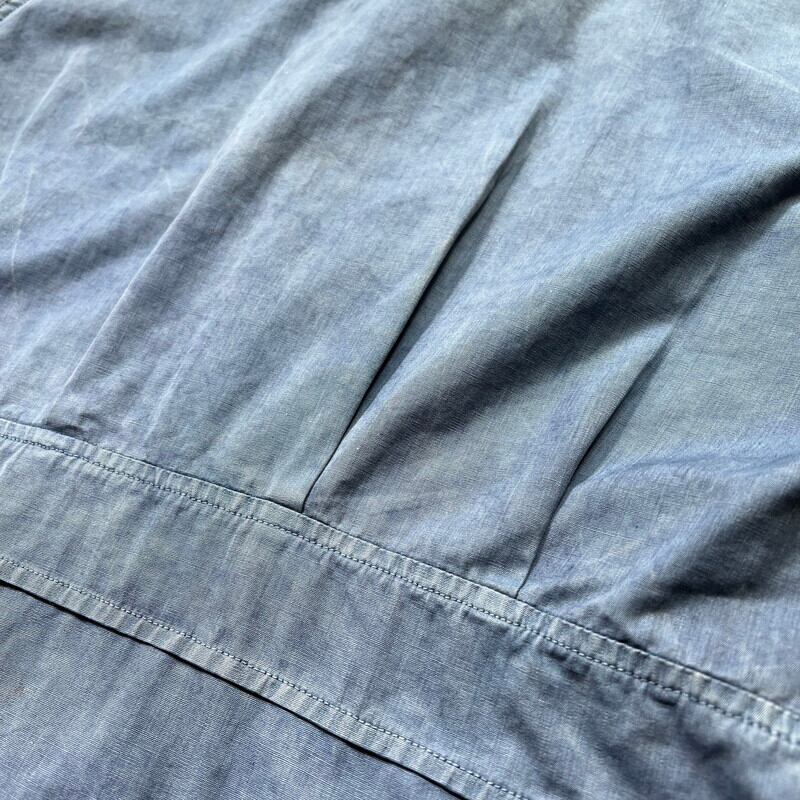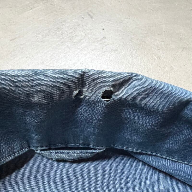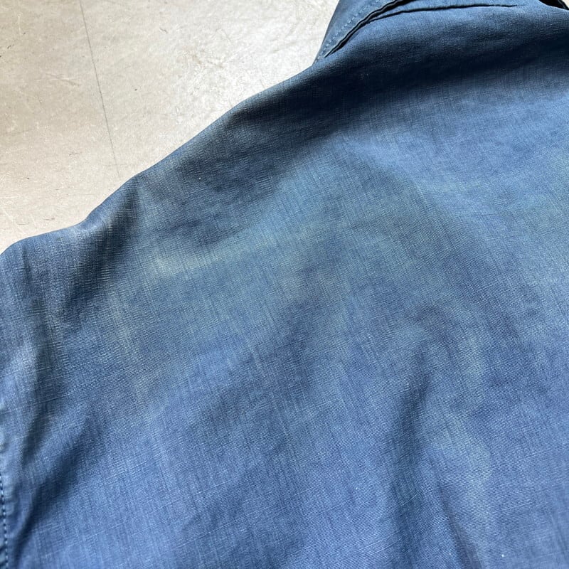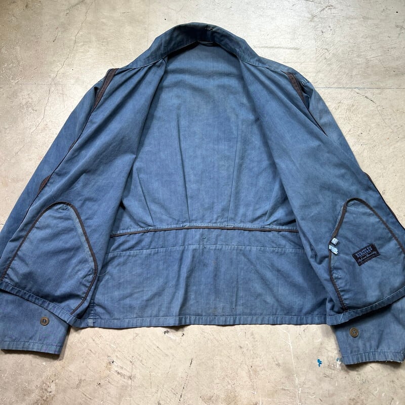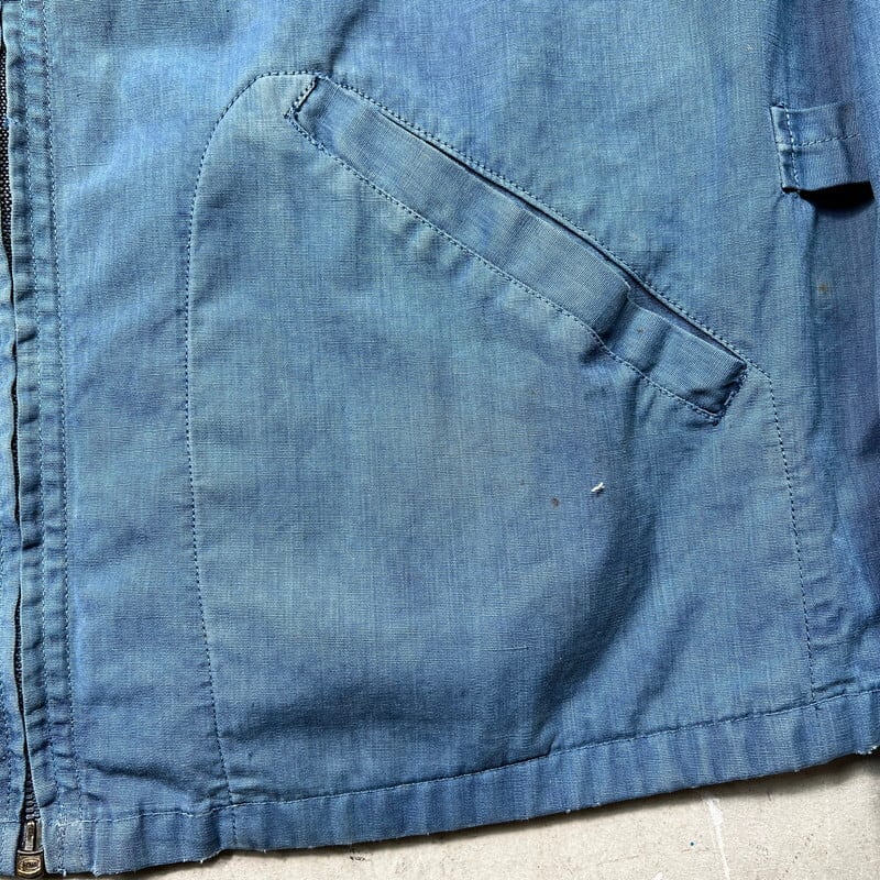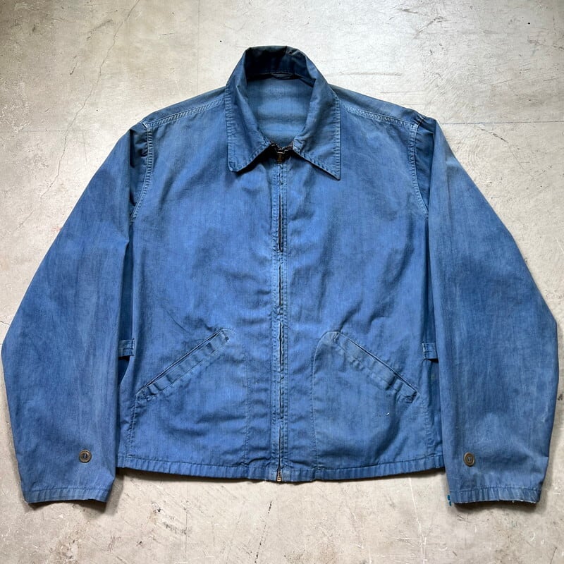 40年代頃のHERCULESコットンポプリンスポーツジャケットです。HERCULESはアメリカ3大ストアで知られるSearsがワークウェアを展開していたプライベートブランドです。目の細かなコットンポプリン地が使用されたアイテムです。フロントはピンロックのCROWNジッパー、サイドにアジャスター付き。元はベージュもしくは生成り等のボディをインディゴのような染料で後染めされた個体です。良い塩梅に褪色しており違和感なく良い雰囲気です。ジッパーのスプリングは残念ながら効いていません(※写真最後の下部の丸内のスプリングの端が上部の丸の溝から抜けてしまってます。外れたスプリングの端が左側のピンロックの溝に入り込んでいるので若干開閉時に引っかかる感じはありますが、開閉自体は可能です)。襟に2カ所小穴が有り、左の袖先に擦り切れがございます。薄汚れもございますが、さほど気にならないかと思います。こちらのモデルでウールを使用したタイプも存在しています。薄手なのでこれからの季節に重宝するアイテムですので、お好きな方は是非いかがでしょうか、サイズ表記はございませんが、恐らくM~L相当で良いサイズ感です。ありそうで無い色味のスポーツジャケットなのでオススメです。
