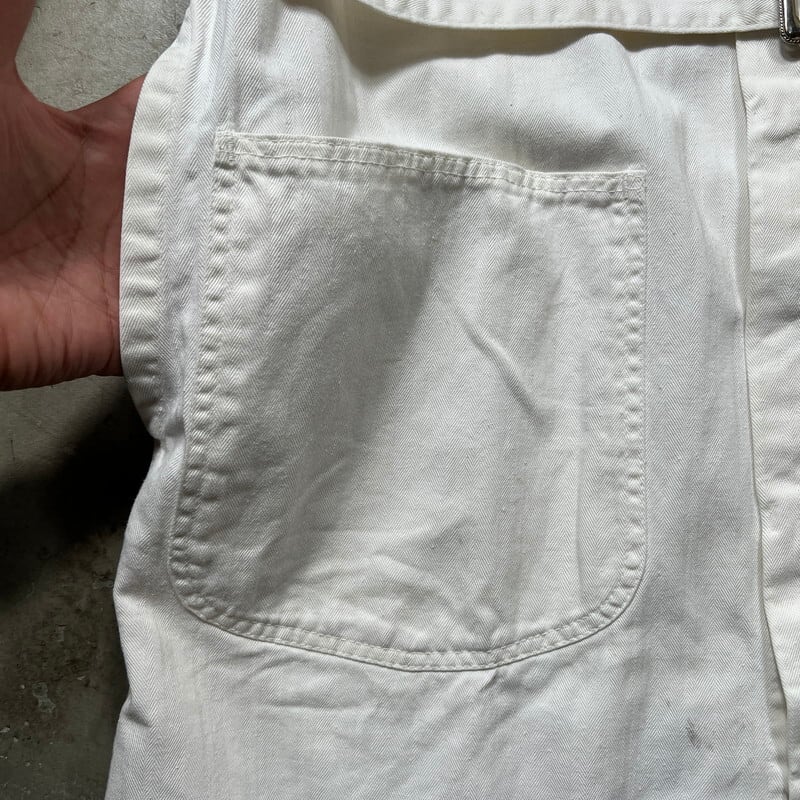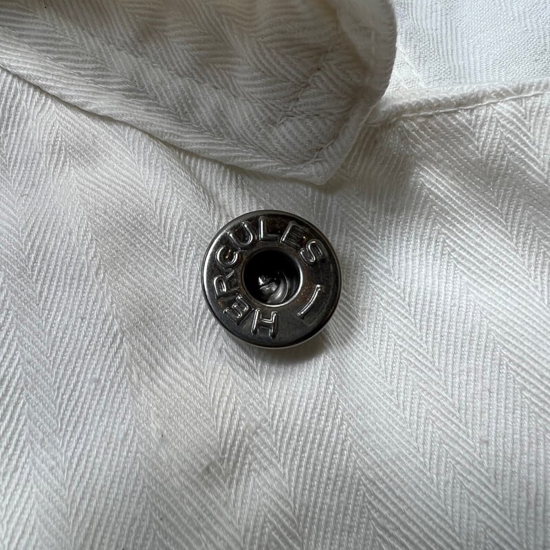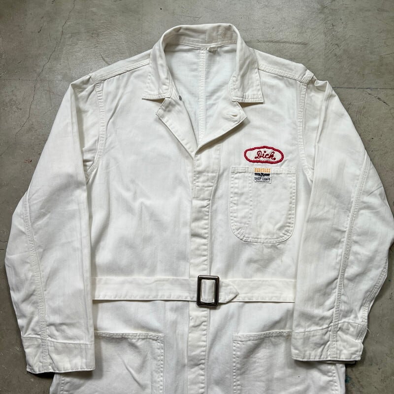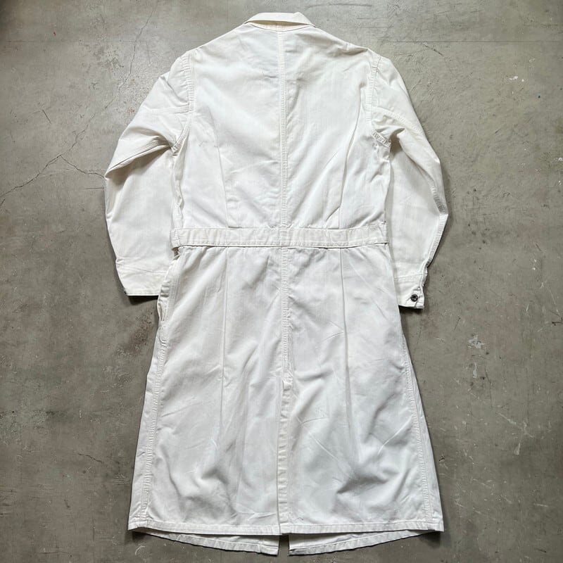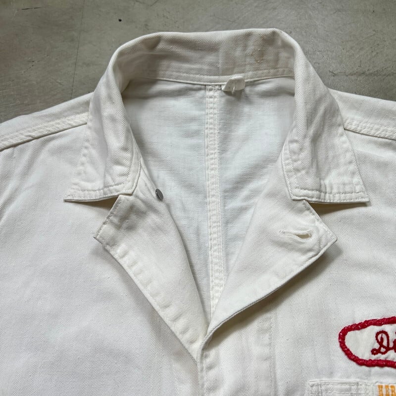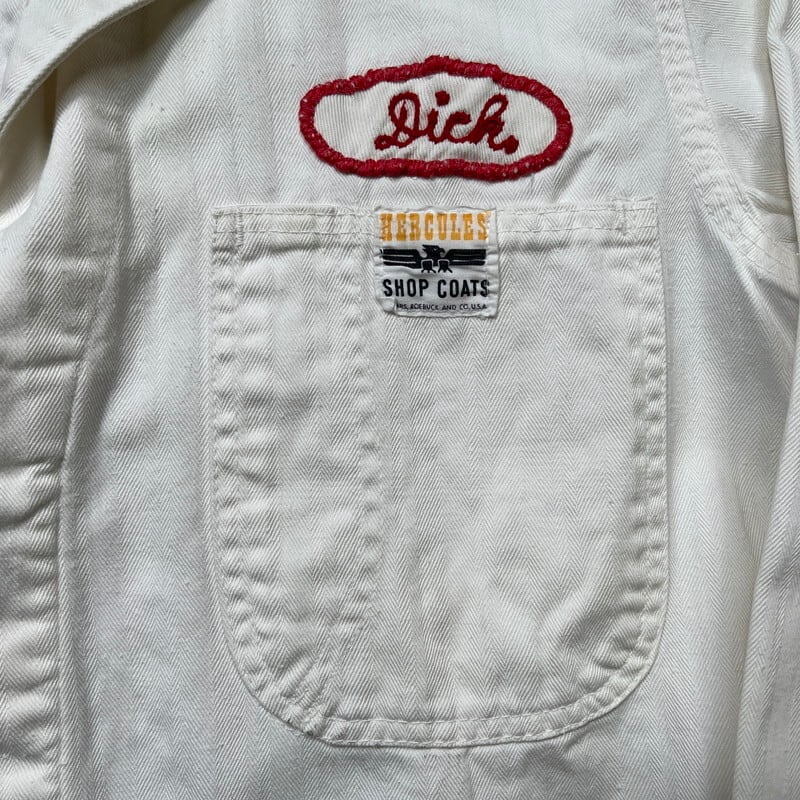 50年代頃のHERCULES HBTショップコートです。HERCULESはアメリカ3大ストアで知られるSearsがワークウェアを展開していたプライベートブランドです。ホワイトのヘリンボーンツイルが使用されており、同年代頃のNATION ALLSシリーズのアイテムだと思われます。胸元にはタグと、手製のネームワッペンが付きます。腰はフロントのみのハーフベルト仕様となっております。ボタンは社名入りのドーナツ打ち込みボタンで全て比翼仕立てとなっています。サイドには貫通ポケットもございます。背面のセンターベントにはセルヴィッジが使用されています(ボディが白なので少しわかりにくいです)。所々薄いシミ等見られ、左肩にピンホールが一カ所ございますが、その他ダメージは無く当時のワークウェアとしてはかなり状態は良いと思います。サイズ表記タグが欠損していますが、M~L程度です。汚れも少なくこれからのエイジングも存分に楽しめます。刺繍やワッペンでのカスタムも良いと思います。あえて白いパンツと合わせてもカッコ良いのでお勧めです。