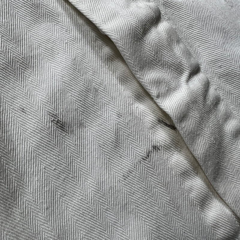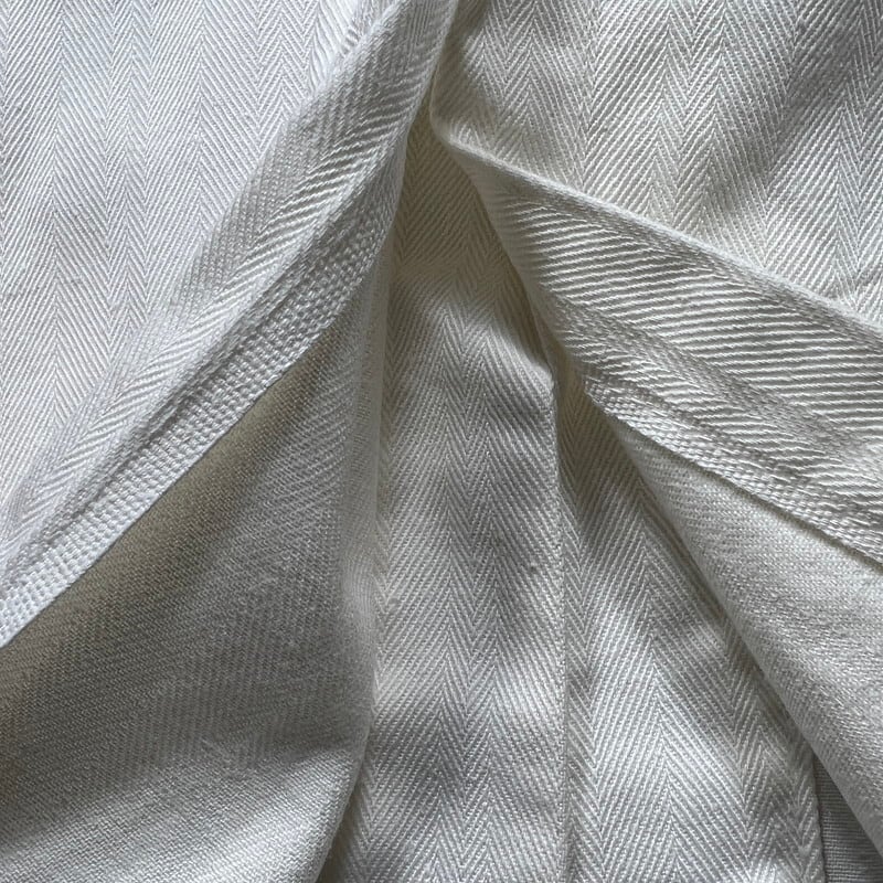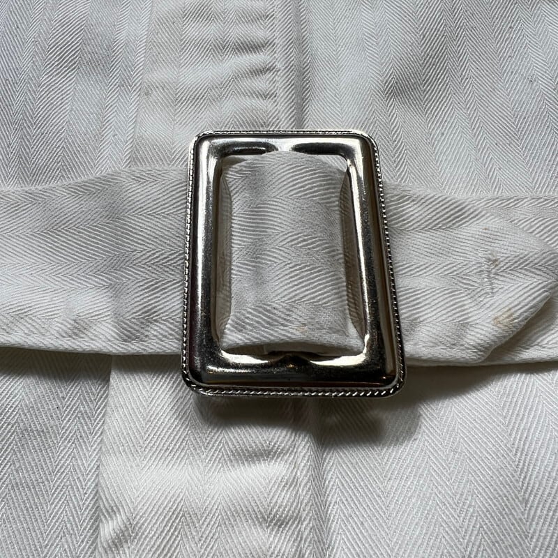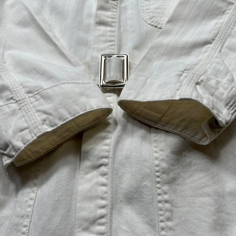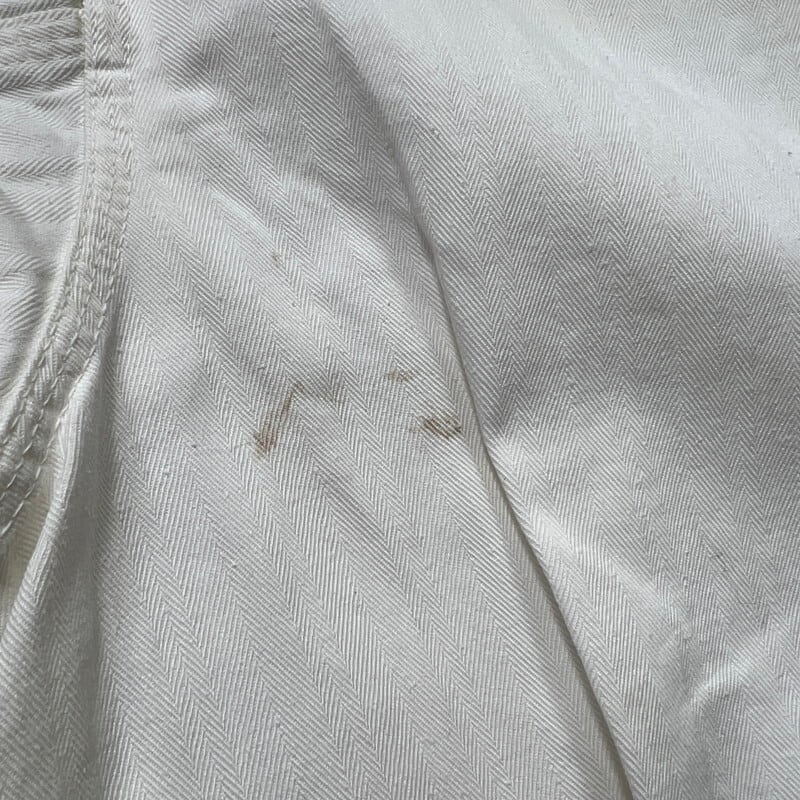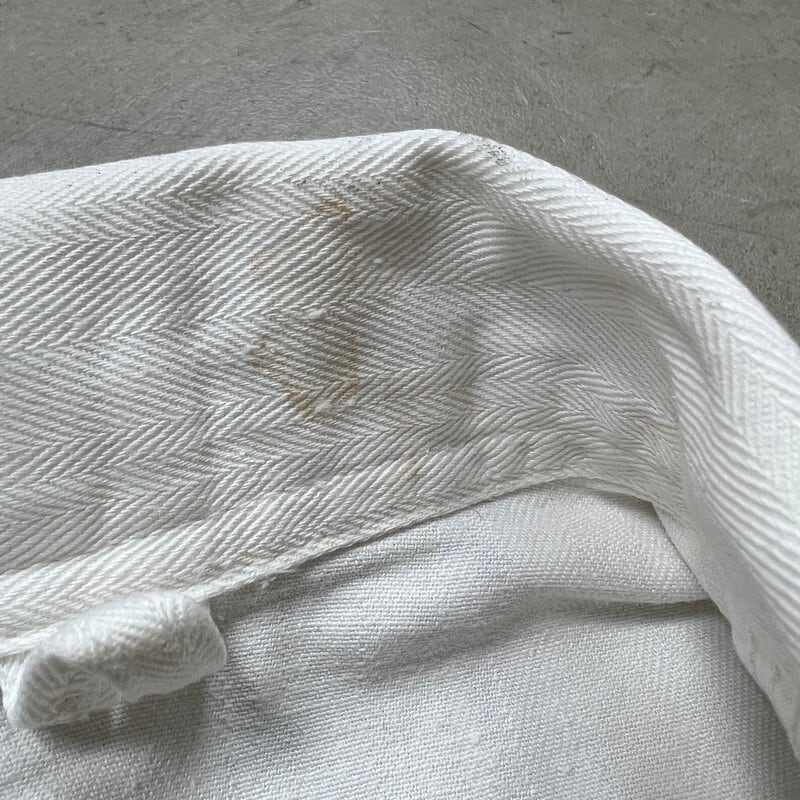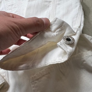 50年代頃のHERCULES HBTショップコートです。HERCULESはアメリカ3大ストアで知られるSearsがワークウェアを展開していたプライベートブランドです。ホワイトのヘリンボーンツイルが使用されており、同年代頃のNATION ALLSシリーズのアイテムだと思われます。胸元にはタグと、手製のネームワッペンが付きます。腰はフロントのみのハーフベルト仕様となっております。ボタンは社名入りのドーナツ打ち込みボタンで全て比翼仕立てとなっています。サイドには貫通ポケットもございます。背面のセンターベントにはセルヴィッジが使用されています(ボディが白なので少しわかりにくいです)。所々薄いシミ等見られ、左肩にピンホールが一カ所ございますが、その他ダメージは無く当時のワークウェアとしてはかなり状態は良いと思います。サイズ表記タグが欠損していますが、M~L程度です。汚れも少なくこれからのエイジングも存分に楽しめます。刺繍やワッペンでのカスタムも良いと思います。あえて白いパンツと合わせてもカッコ良いのでお勧めです。